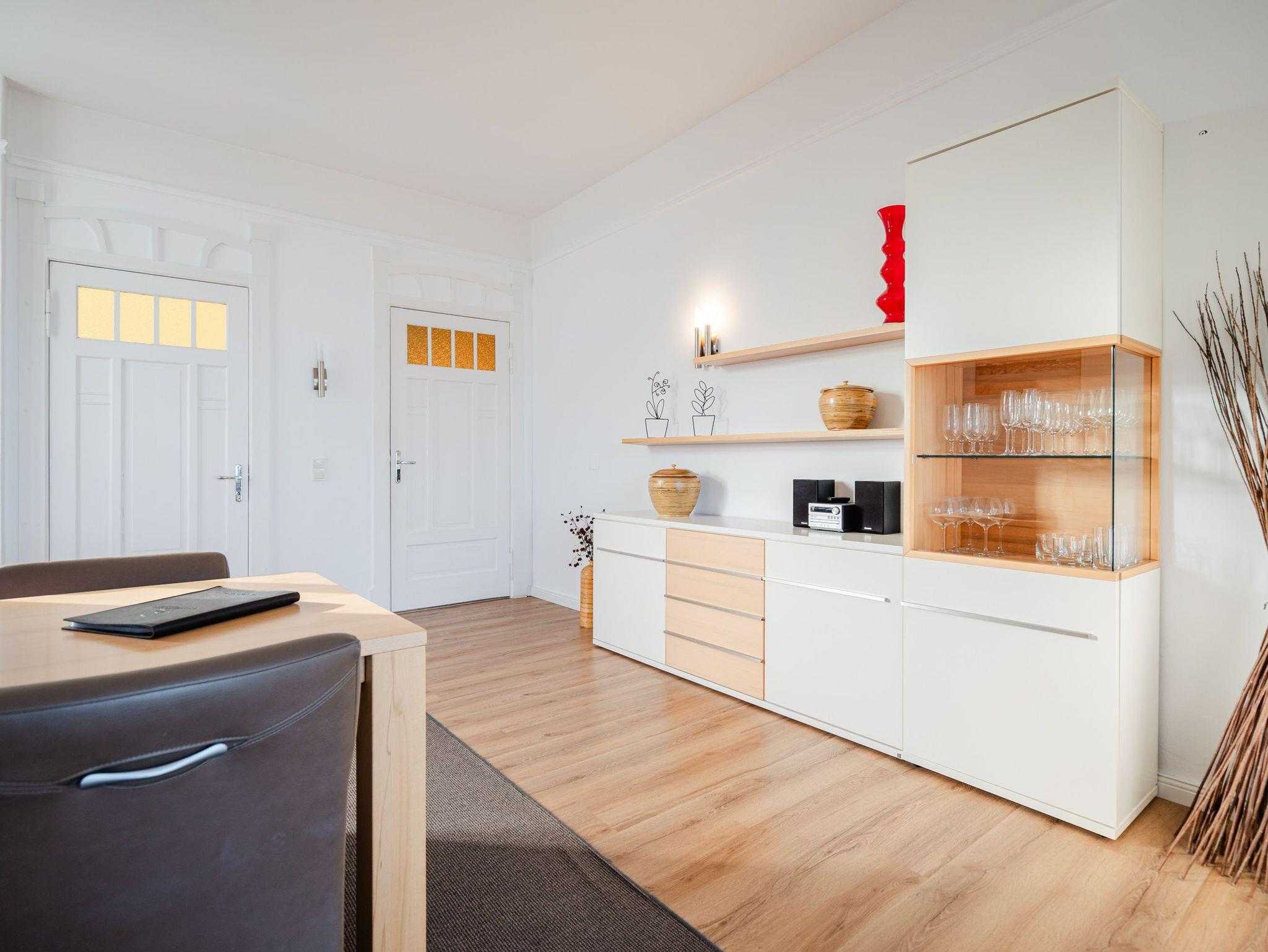 Traumhafter Meerblick, erste Reihe, 4-Sterne-Komfort-Wohnungen. Gibt es nicht? Doch! In der Villa Dora, eine stilvolle Villa der Kaiserzeit. Hier wird Ihr Urlaub zu einem besonderen Erlebnis, denn die Ostsee ist quasi vor der Tür. Komfortabel und ansprechend gestaltete Domizile, vom 1-Raum-Appartement mit verglaster Veranda bis hin zum Dachstudio mit 100 qm, bieten Ihnen zu zweit oder in Familie erholsame Urlaubstage. Für jedes Appartement in der Villa Dora steht ein Stellplatz zur Verfügung. Sie haben die Möglichkeit Ihre Fahrräder in einem separaten Raum unterzustellen. Eine Waschmaschine und ein Trockner im Haus sind gegen eine Gebühr nutzbar. Das WLAN-Netz steht kostenfrei zur Verfügung.