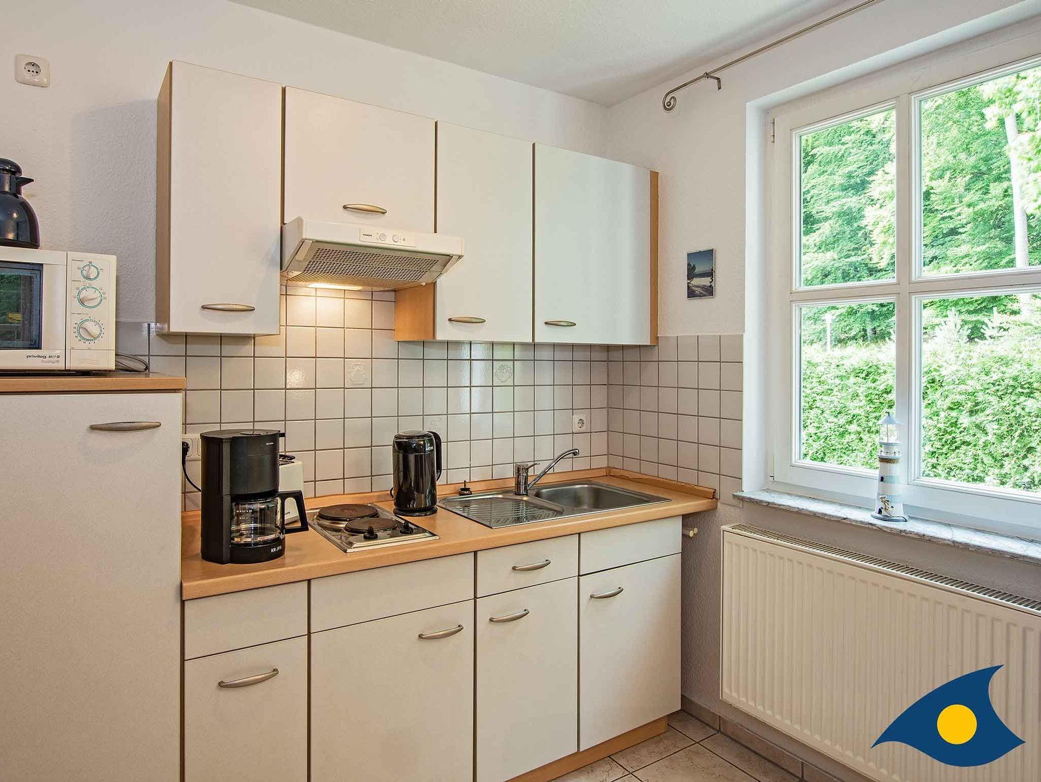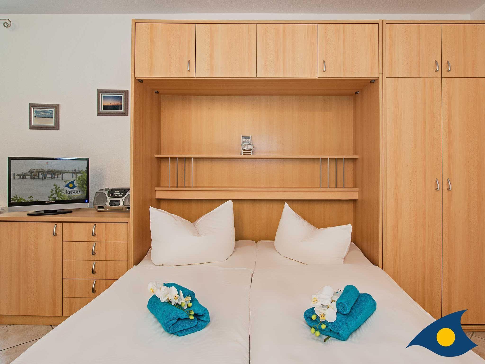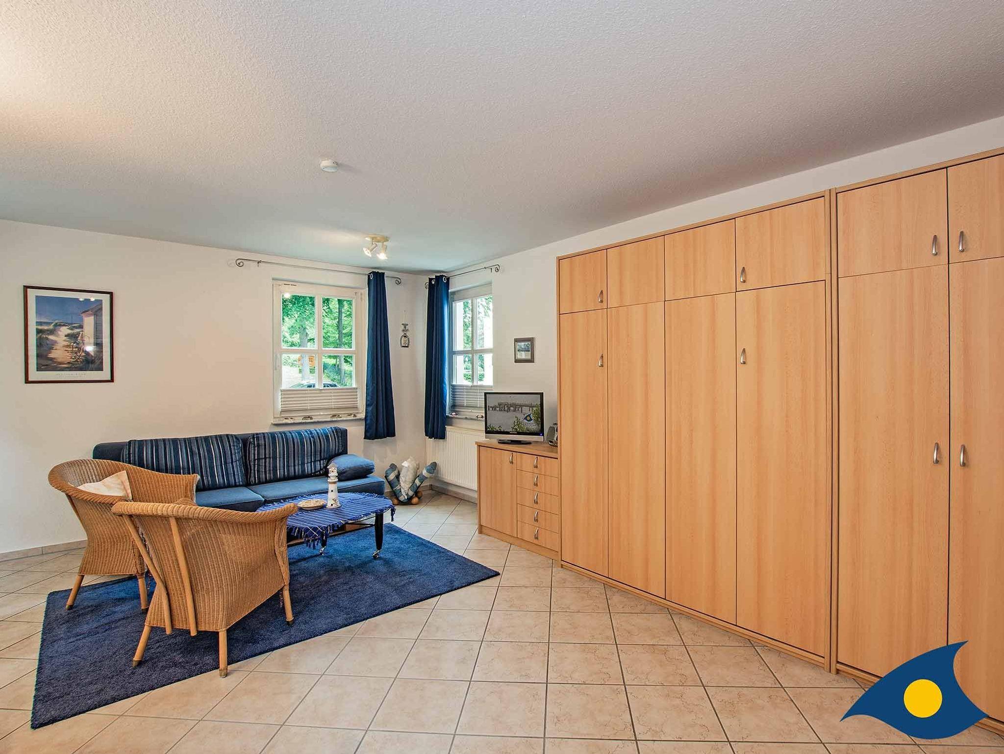 Dieses liebevoll eingerichtete Einraumappartement verfügt über einen kleinen Südwestbalkon (1,7 qm). Das komfortable Schrankbett mit Federkernmatratze (1,60 m breit) kann am Tag hochgeklappt werden.