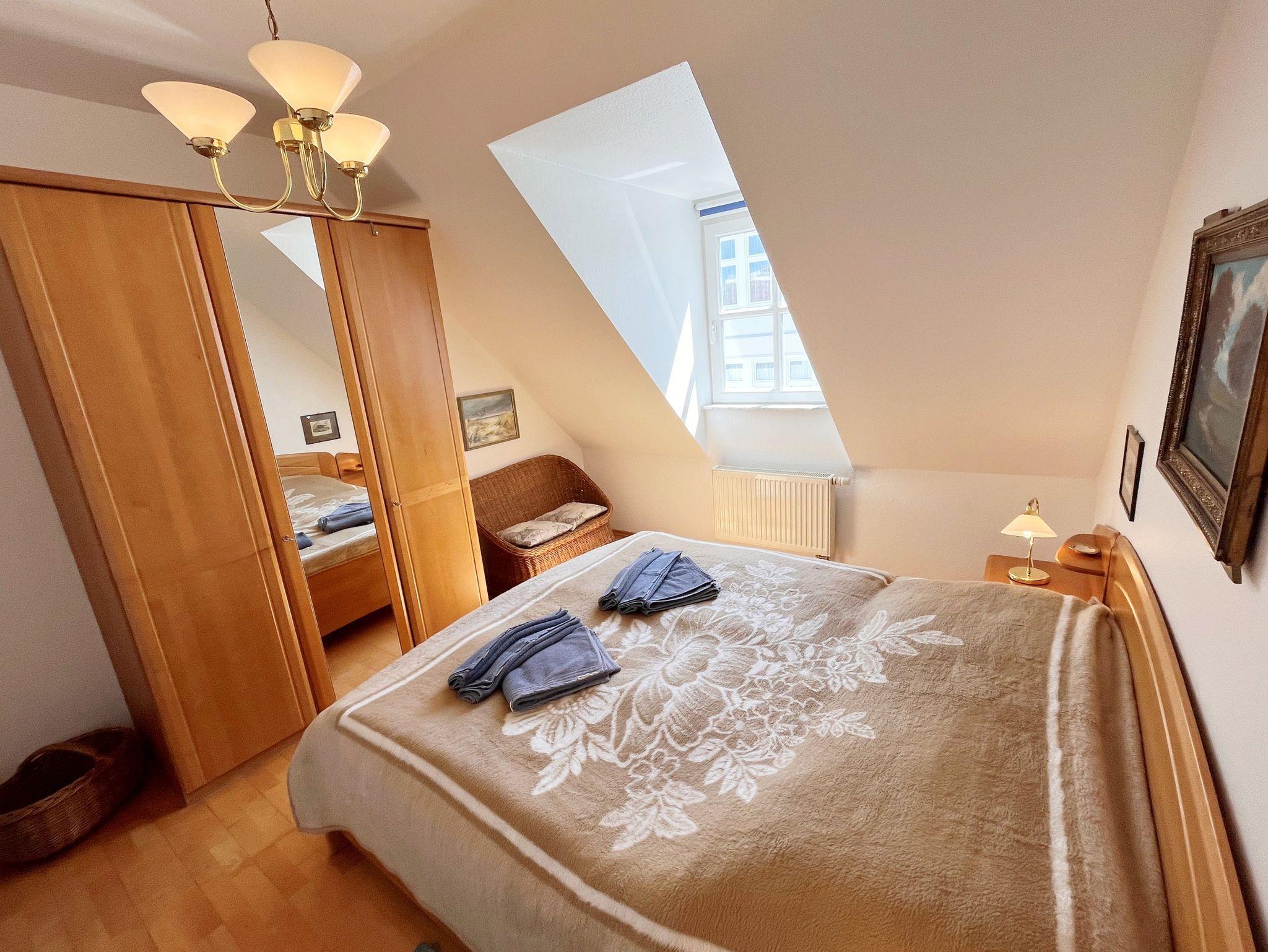 Die ca. 60 qm große Drei-Raum-Giebelwohnung im Obergeschoss des Hauses heißt Sie mit einem traumhaften, direkten Meerblick willkommen. Der helle, offene Wohn-, Ess- und Kochbereich lädt mit einer großzügigen Sitzecke, einem gemütlichen Essplatz sowie einer voll ausgestatteten Küchenzeile zum Wohlfühlen und Verweilen ein. Zwei separate Schlafzimmer sorgen für erholsamen Schlaf: eines mit einem komfortablen Doppelbett, das zweite mit zwei Einzelbetten - ideal für Familien oder Freunde. Ein Bad mit Dusche sowie ein separates WC bieten zusätzlichen Komfort. Vom Wohnzimmer aus betreten Sie den Balkon und genießen hier den unvergleichlichen Blick auf das Meer - der perfekte Ort für entspannte Stunden und unvergessliche Urlaubsmomente.