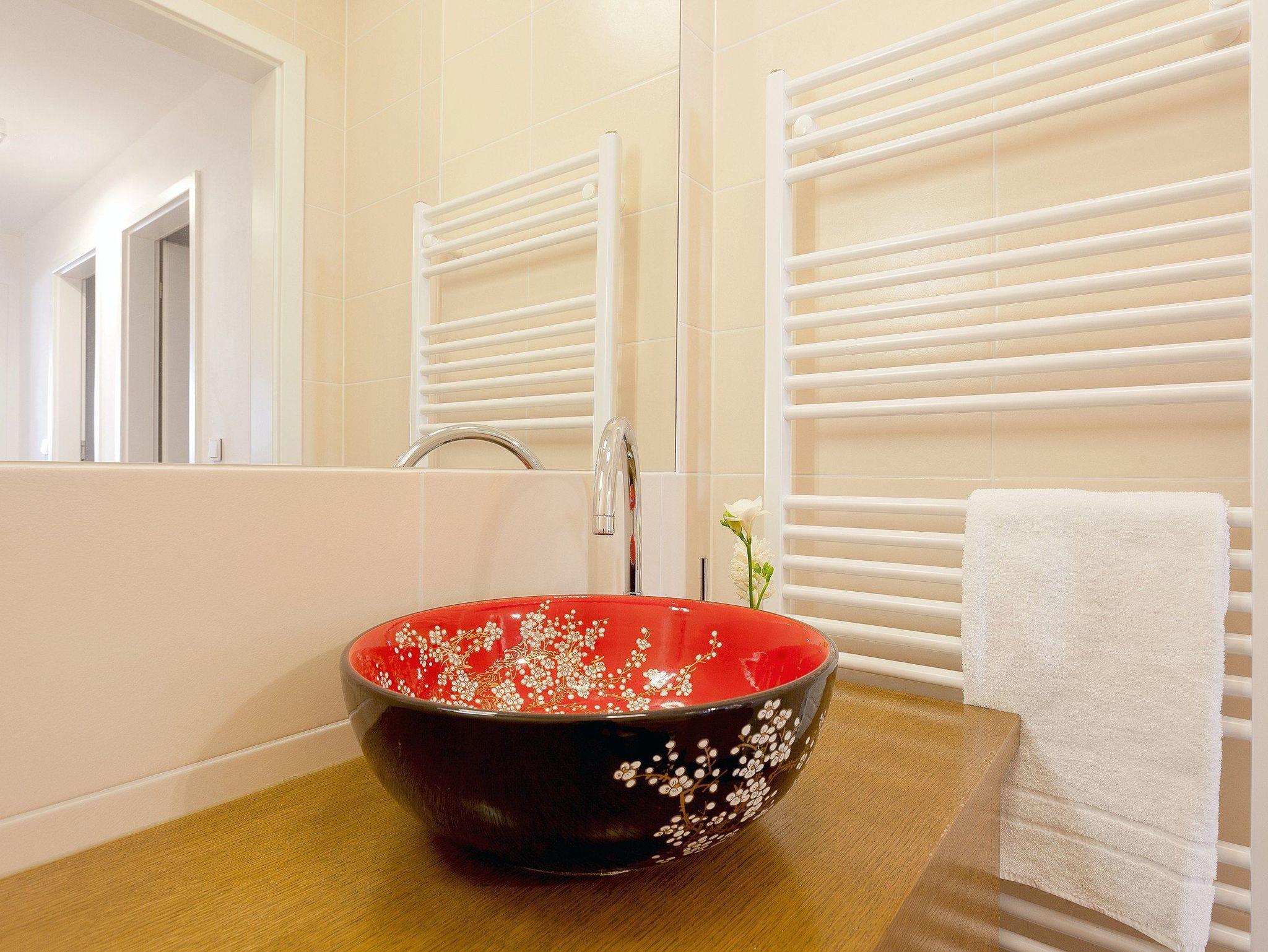 Inspiriert von einer langen Fernostreise vereint das Appartement B 0.2 modernste Einrichtungselemente mit asiatischen Accessoires in zarten Pastell-, Rot- und Schwarztönen.