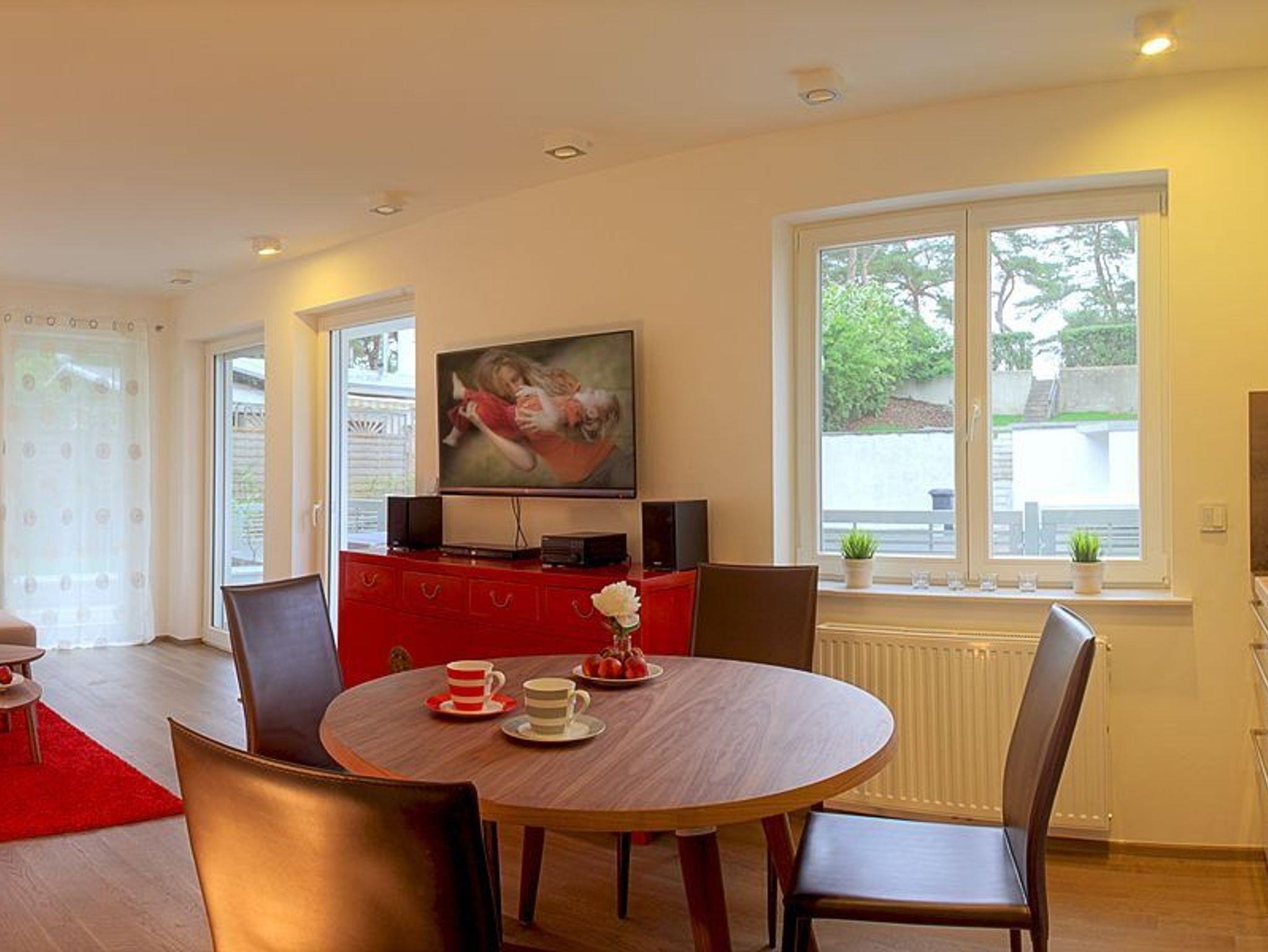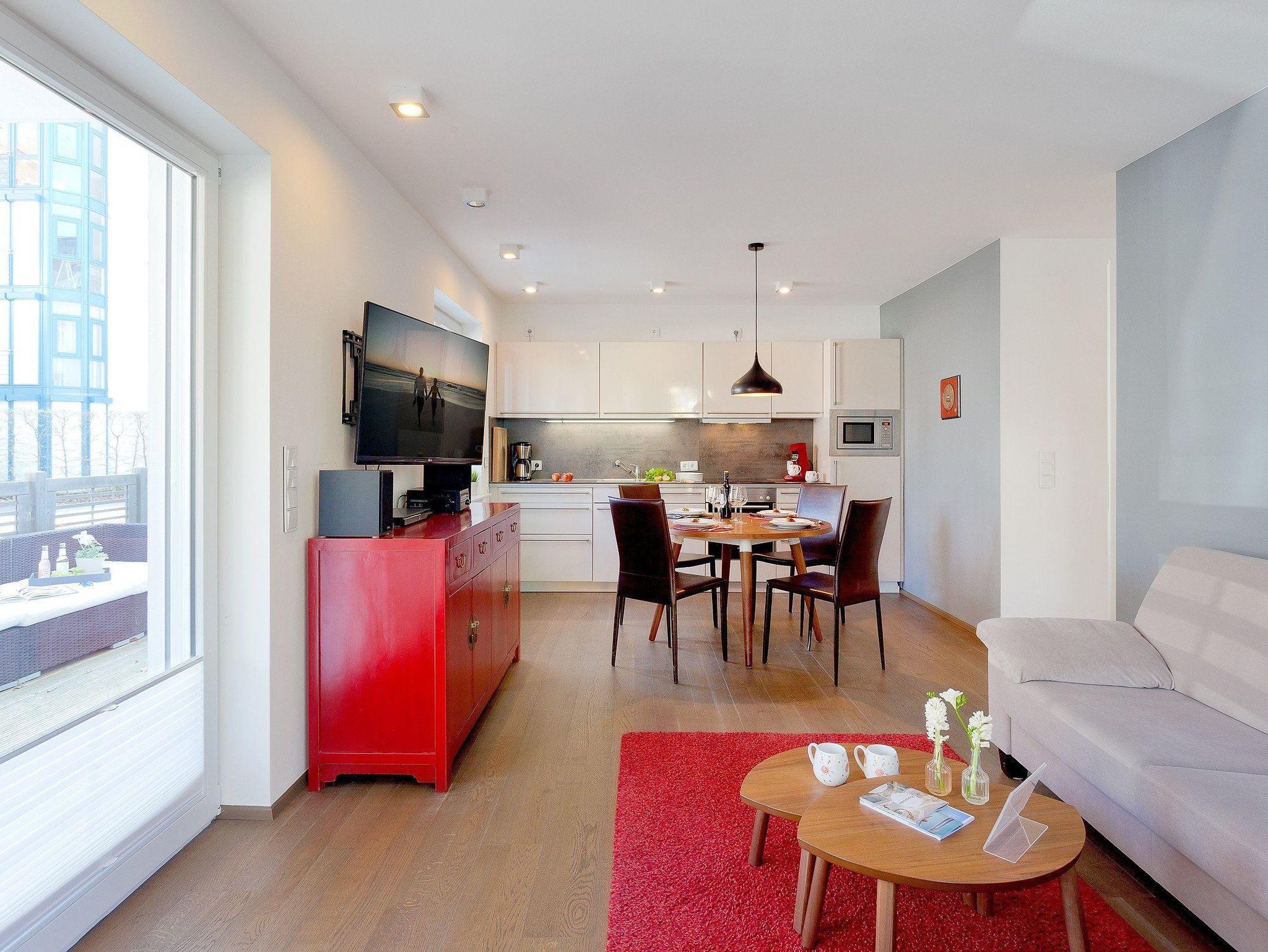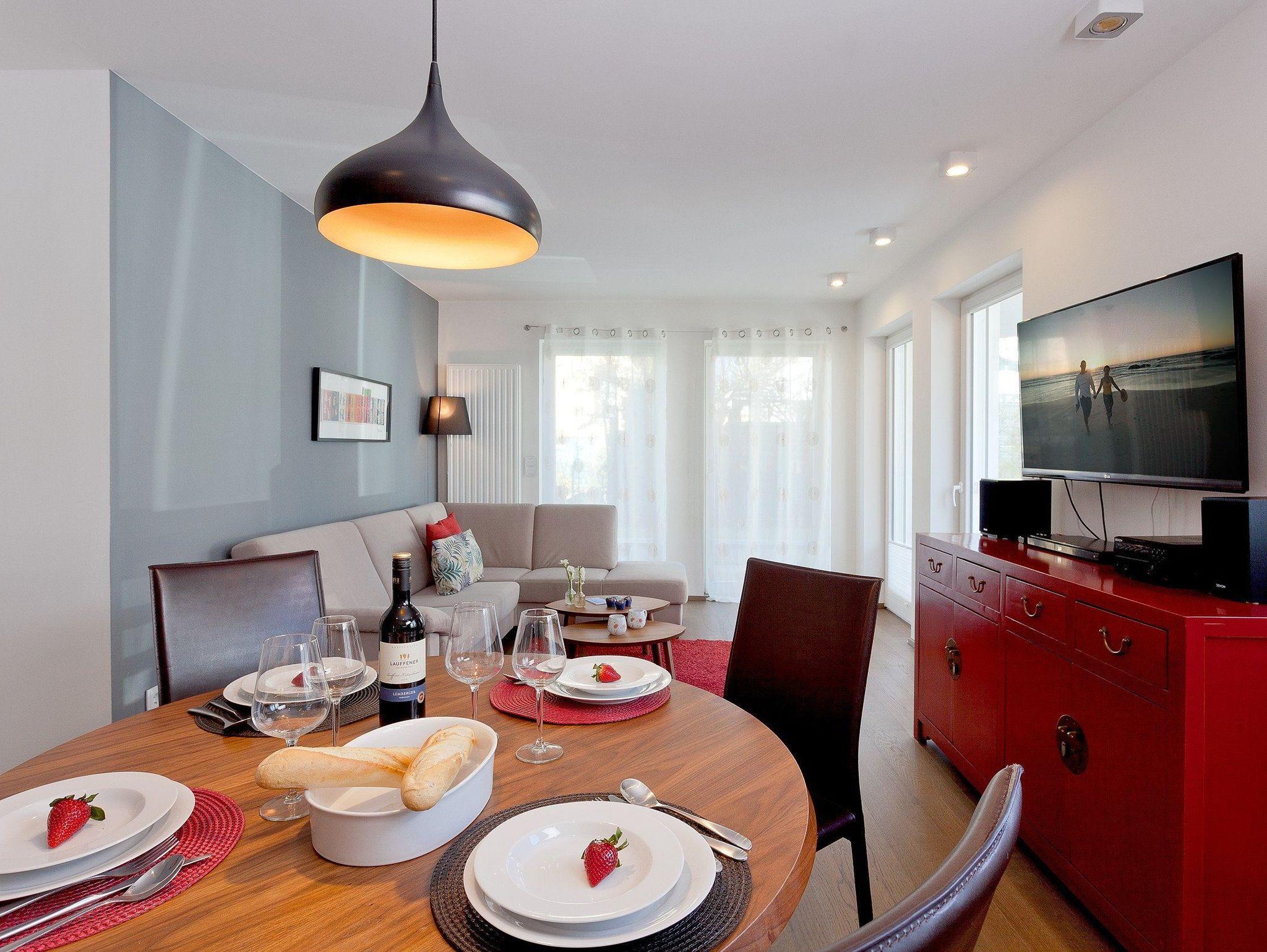 Das 3-Raum-Appartement befindet sich im Erdgeschoss, hat eine Größe von 66 Quadratmetern und ist für 4 Personen das ideale Urlaubsdomizil an der wunderschönen Ostseeküste. Das liebevoll eingerichtete Wohnzimmer überzeugt mit gemütlichem Ecksofa, Flachbild TV, DVD Player, Soundsystem sowie einer mit allen Extras ausgestatteten Einbauküche. Bodentiefe Fenster geben dem Wohnzimmer eine lichtdurchflutete Atmosphäre. Die vom Wohnzimmer angrenzende Nordost-Privatterrasse mit Loungeecke und Essbereich bietet ein harmonisches Urlaubserlebnis. Separat sind die beiden Schlafräume mit komfortablem Boxspringbett (160 x 200cm / 180 x 200cm / jeweils zwei getrennte Matratzen) und das Badezimmer mit ebenerdiger Echtglas-Dusche, XXL-Waschtisch, WC und einem Haarfön.