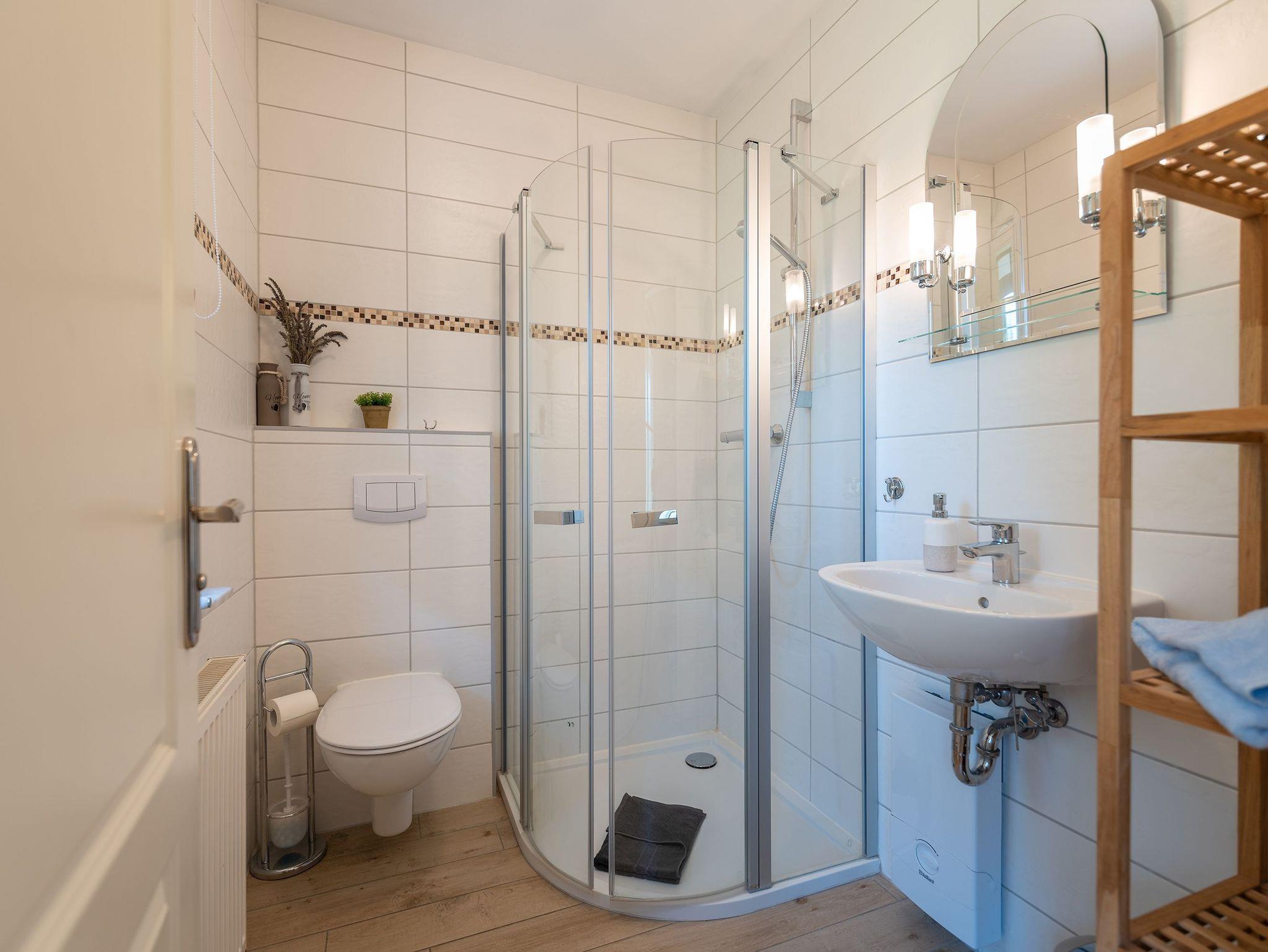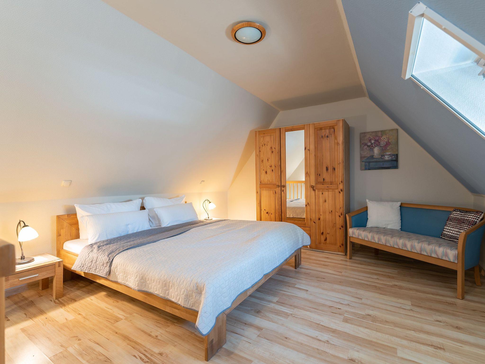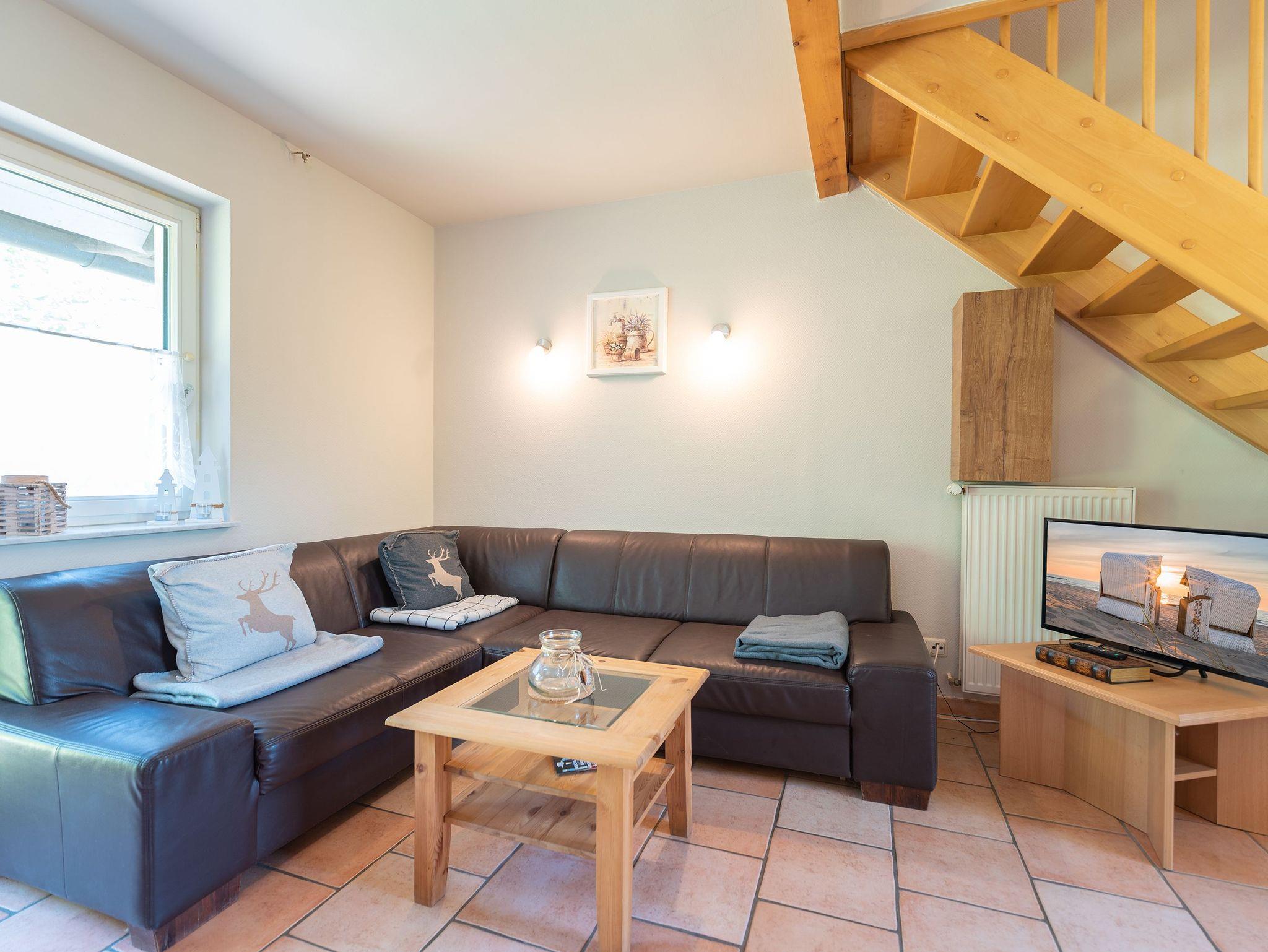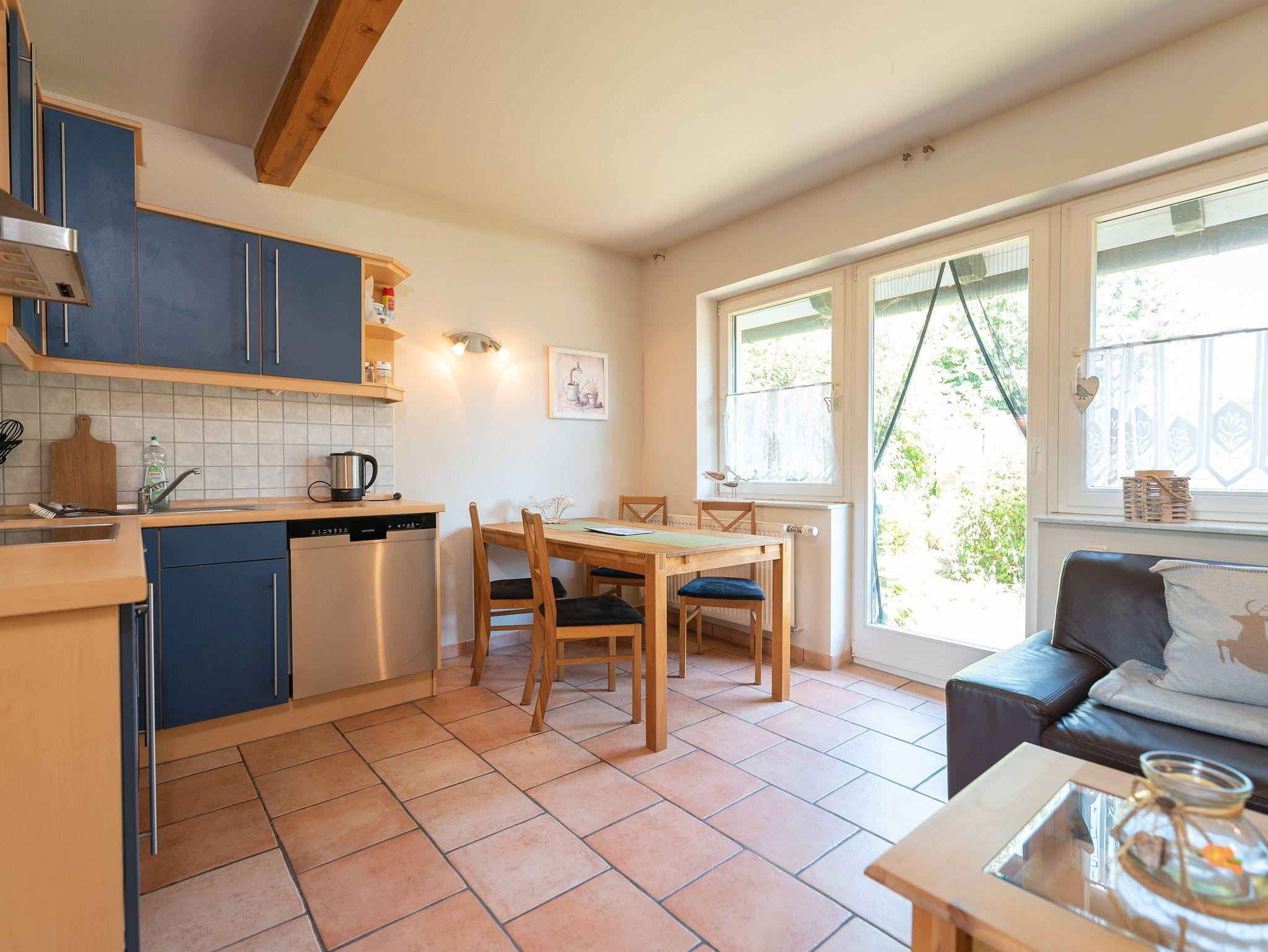 Ferienwohnung Selene 1: Diese linke Seite der Doppelhaushälfte umfasst ca. 50 m², perfekt für zwei Erwachsene und ihre vierbeinigen Freunde. Das Dachgeschoss beherbergt ein Schlafzimmer mit einem Doppelbett, während im Erdgeschoss der Wohn- und Essbereich mit einer offenen Küchenzeile und einem Duschbad zu finden sind. Eine Terrasse mit Holzgartenmöbeln bietet den idealen Platz für den Morgenkaffee. Zu den Annehmlichkeiten gehören ein Parkplatz direkt am Eingang und kostenfreies WLAN.