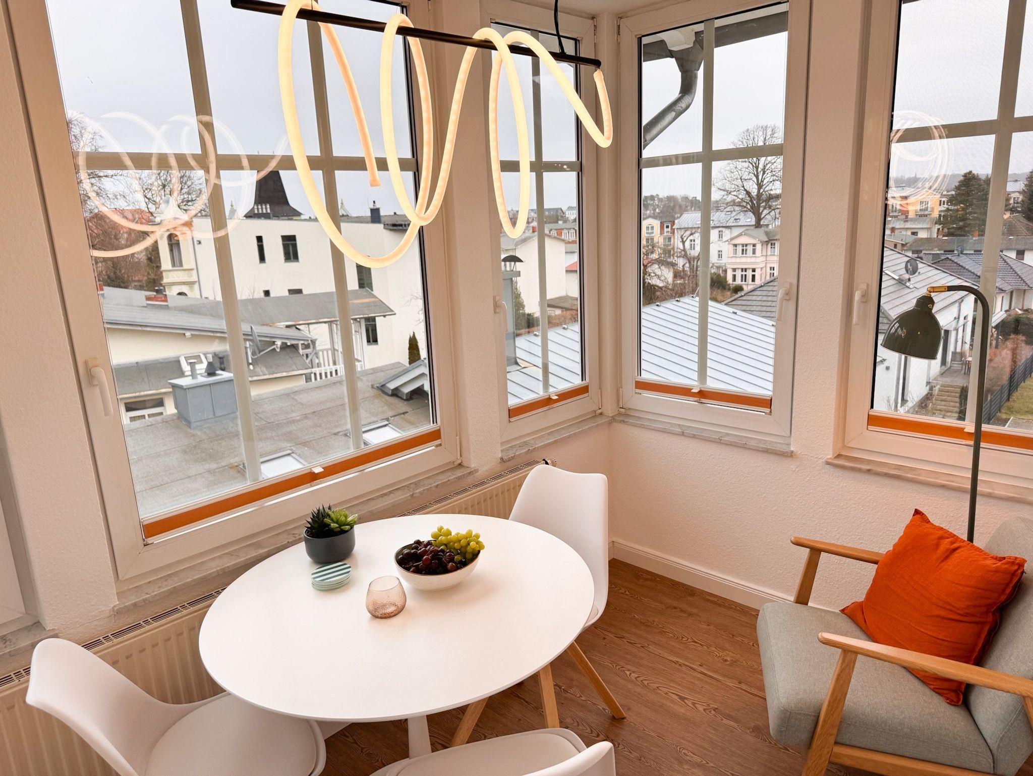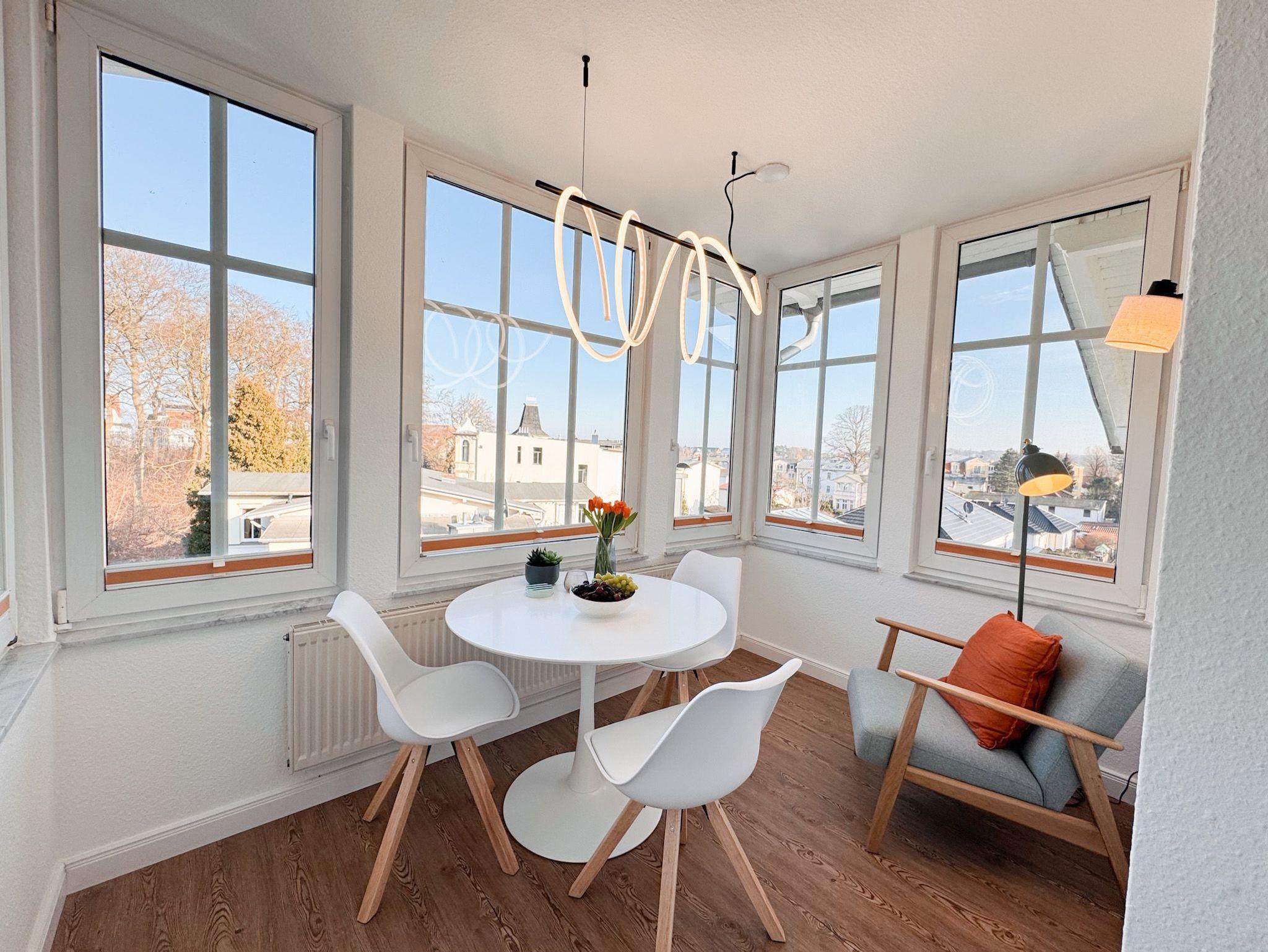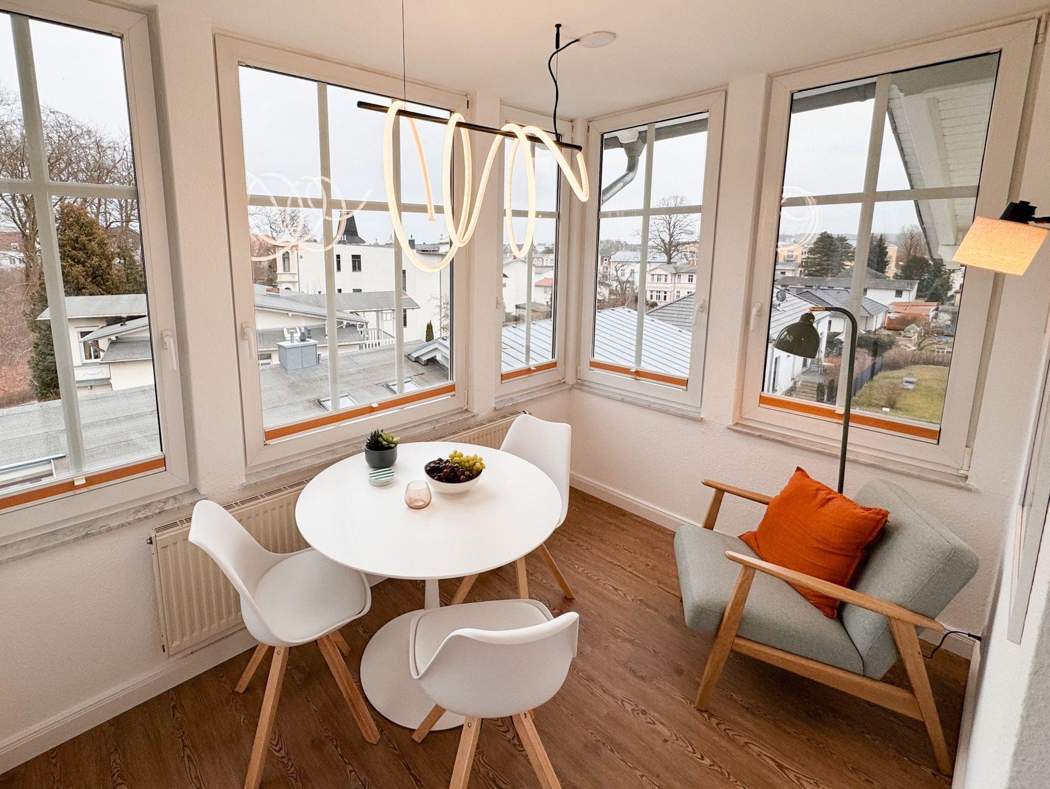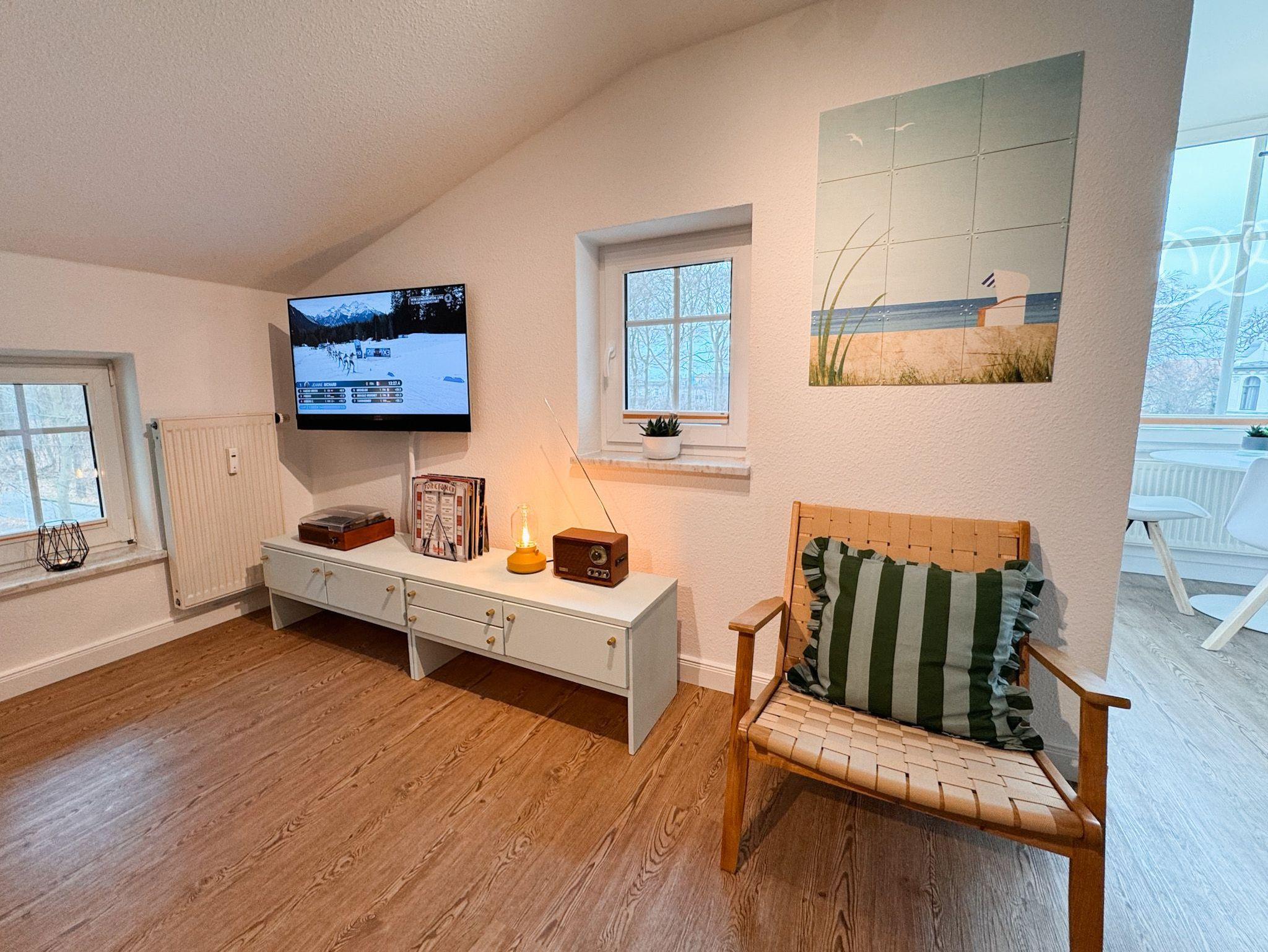 Sie befindet sich im Dachgeschoß der Villa Waldstraße und bietet Ihnen ein modernes Wohnzimmer, eine komplett ausgestattete moderne Küchenzeile mit Cerankochfeld, Mikrowelle, Dunstabzughaube, Kühlschrank mit Gefrierfach, Kaffeemaschine, Wasserkocher, Toaster, Backofen, Geschirrspüler. Im Erkerzimmer mit Blick über Bansin lässt es sich wunderbar Frühstücken. Das Schlafzimmer ist mit einem komfortablen Boxspringbett (180cmx200cm) und Flachbildfernseher ausgestattet. Das Bad ist mit Badewanne, Dusche und WC ausgestattet. Als Aufbettungsmöglichkeit steht im Wohnzimmer für eine 3. und 4. Person eine bequeme Schlafcouch (140cmx200cm) zur Verfügung.