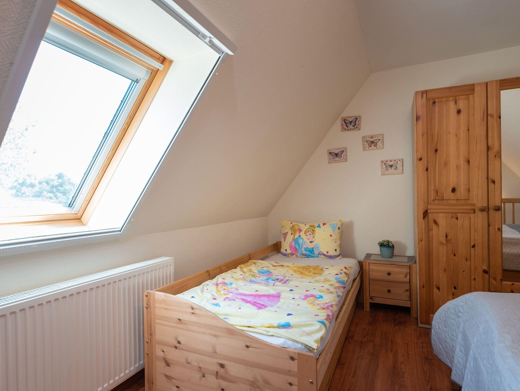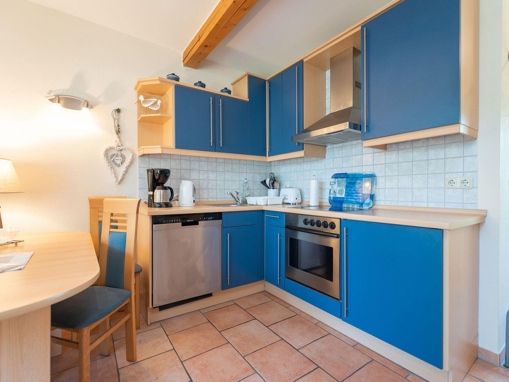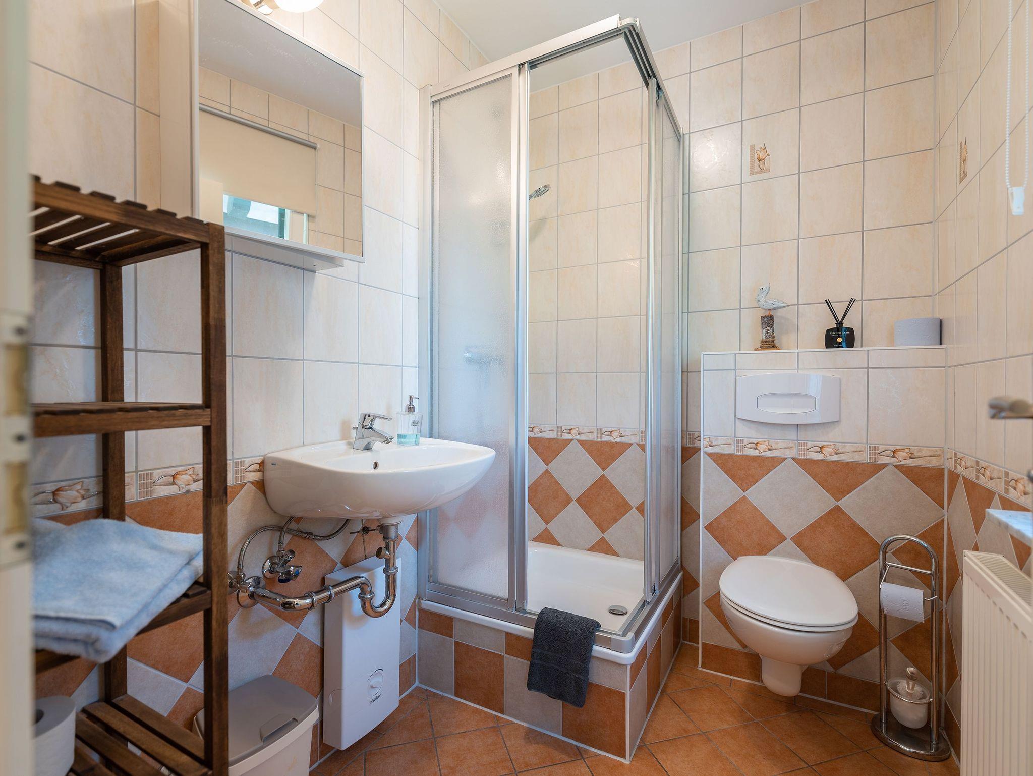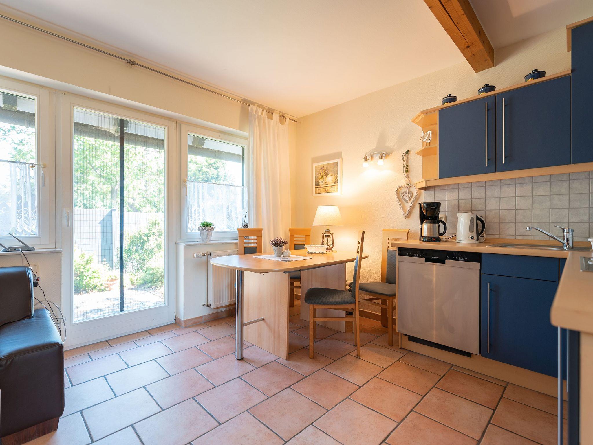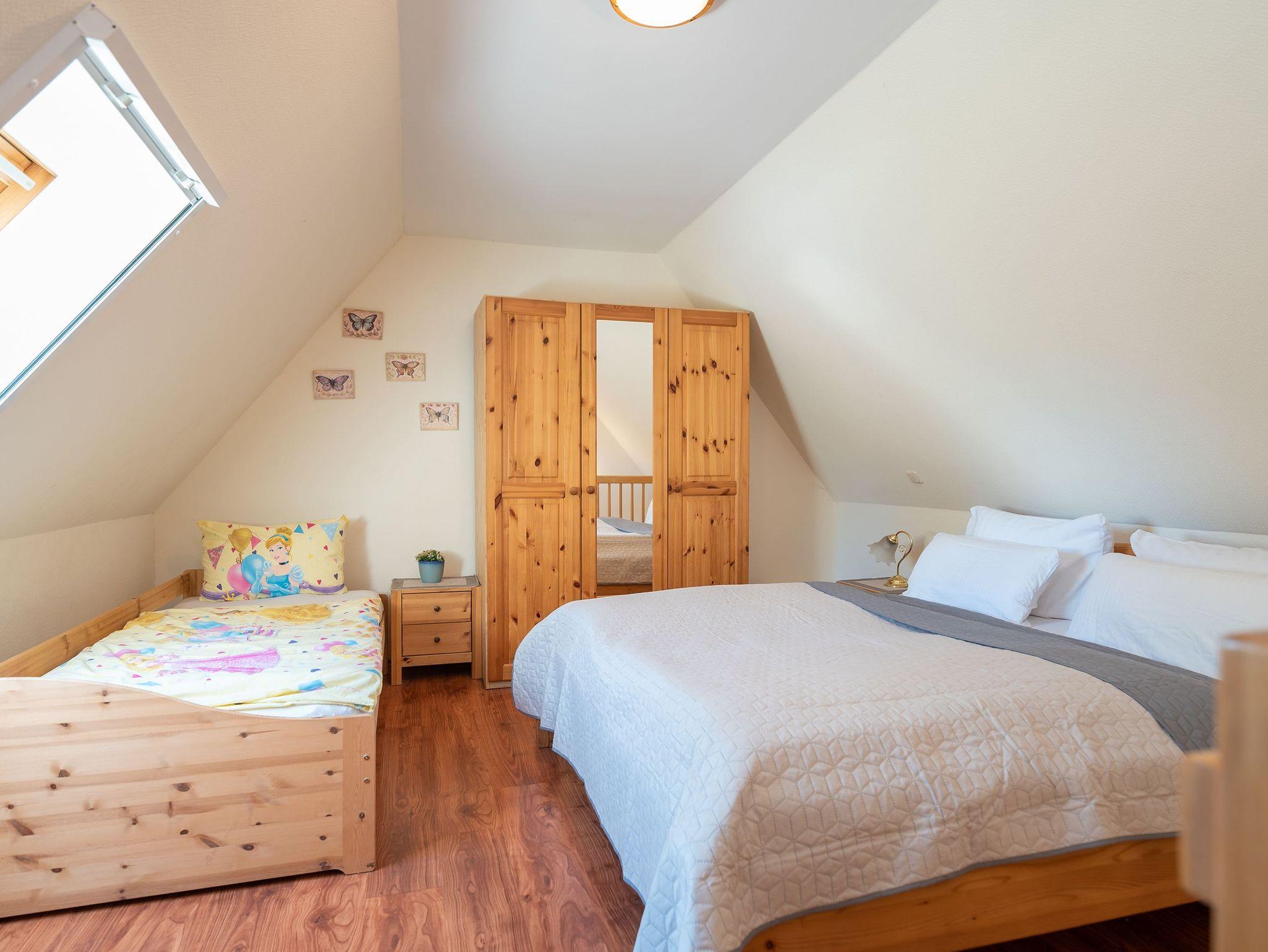 Ferienwohnung Selene 2: Die rechte Seite des Doppelhauses ist ebenfalls 50 m² groß und eingerichtet für zwei Erwachsene, ein Kind und deren Hund. Das Schlafzimmer im Dachgeschoss bietet ein Doppelbett sowie ein Einzelbett. Wie in Fewo 1, befinden sich der Wohnbereich, die Küche und das Duschbad im Erdgeschoss, ergänzt durch eine ähnliche Terrassenausstattung. Auch hier sind ein kostenfreier Parkplatz und WLAN inklusive.