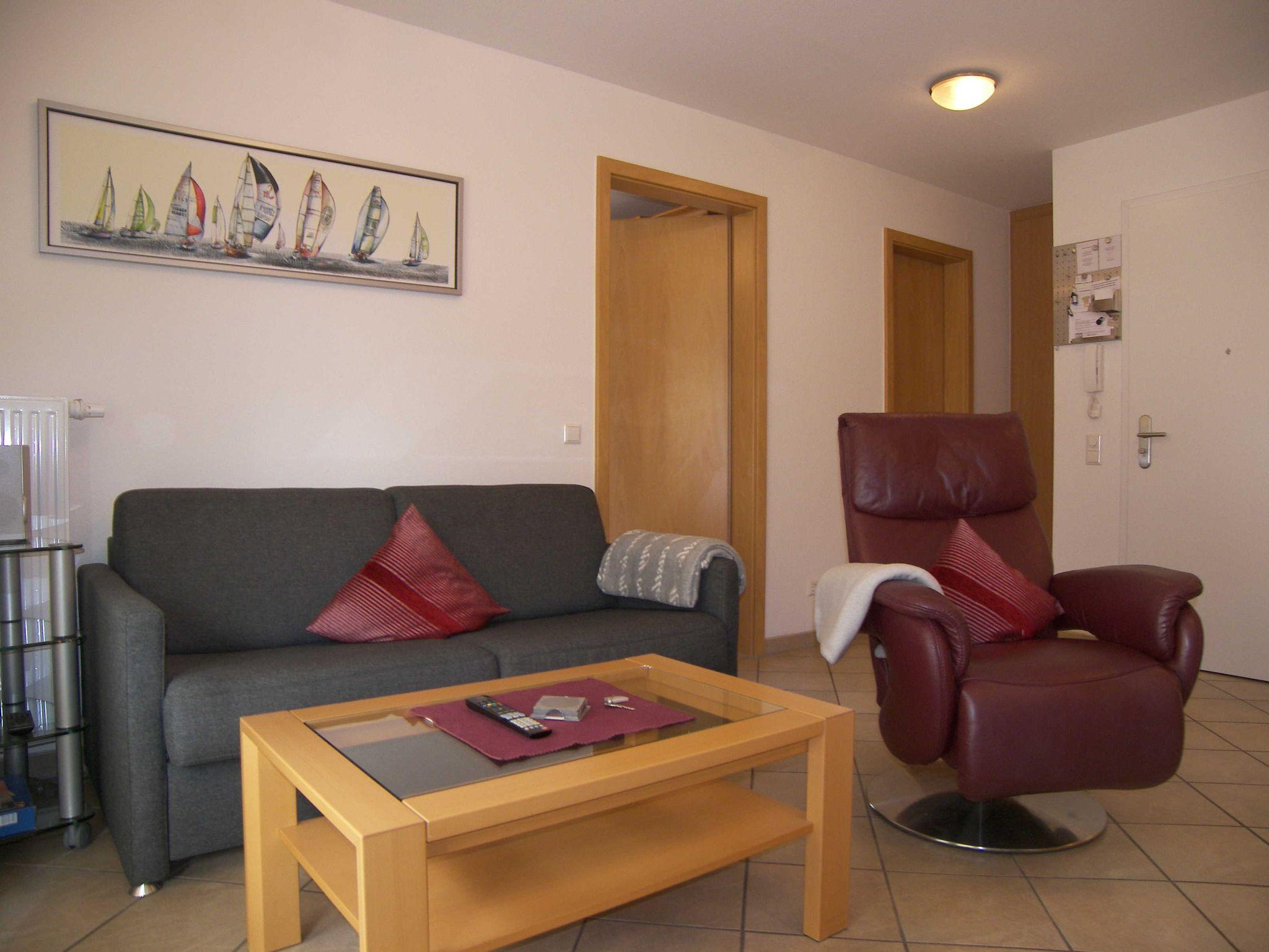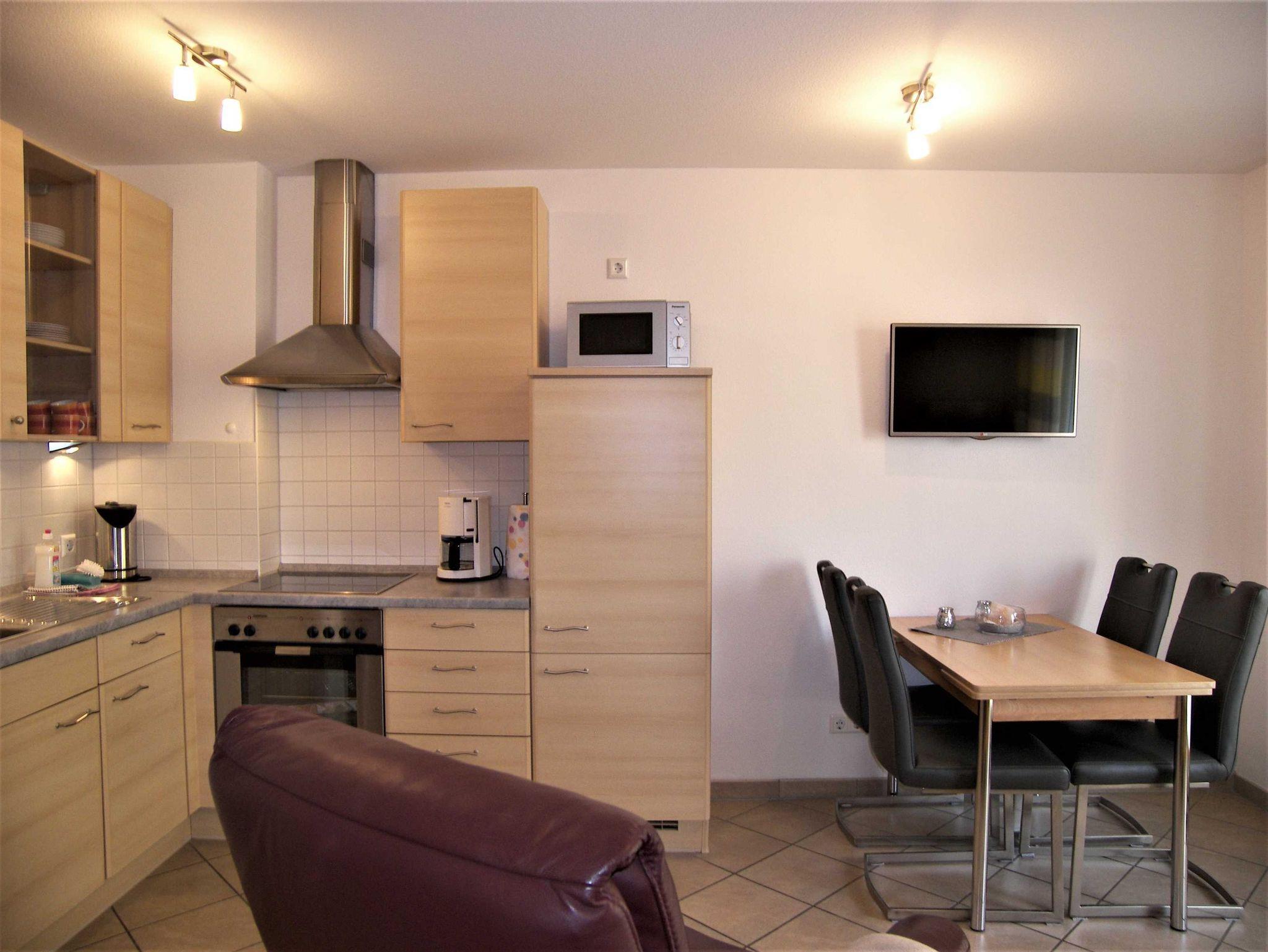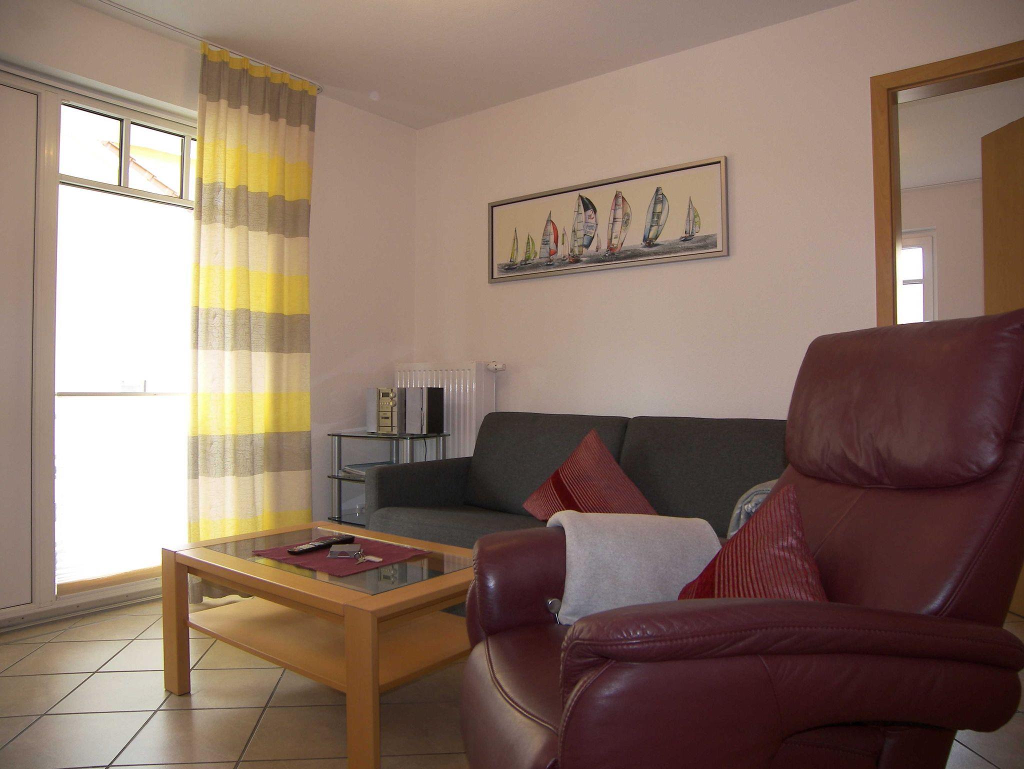 Komfortable 2-Raum Nichtraucher-Ferienwohnung im 1. OG. mit Balkon zur Südwestseite. Die Wohnung verfügt über einen Schlafraum mit Doppelbett und Kleiderschrank, einem kombinierten Wohn- und Schlafraum mit einer ausklappbaren Schlafcouch (Liegefläche 1,40 x 2,00 m), TV, Radio mit CD-Player, gemütliche Couchsitzgruppe und Essbereich sowie eine Küchenzeile mit 4 Platten Herd, Backofen, Mikrowelle, Spüle, Kühlschrank, Kaffeemaschine, Geschirr etc.