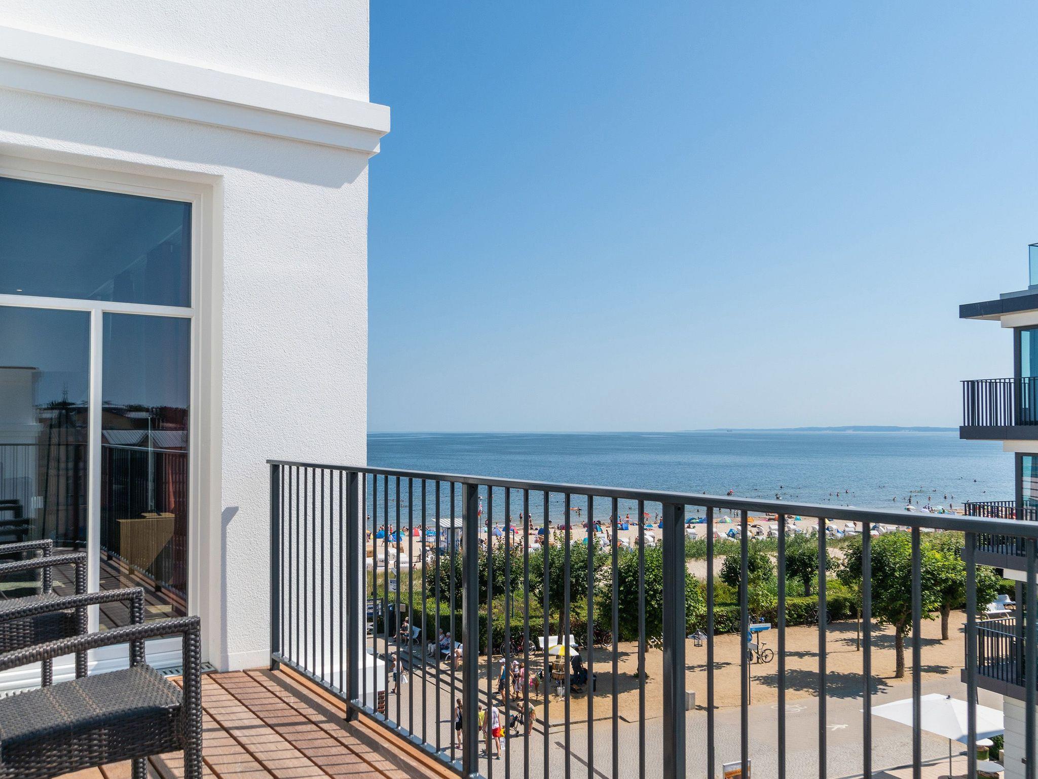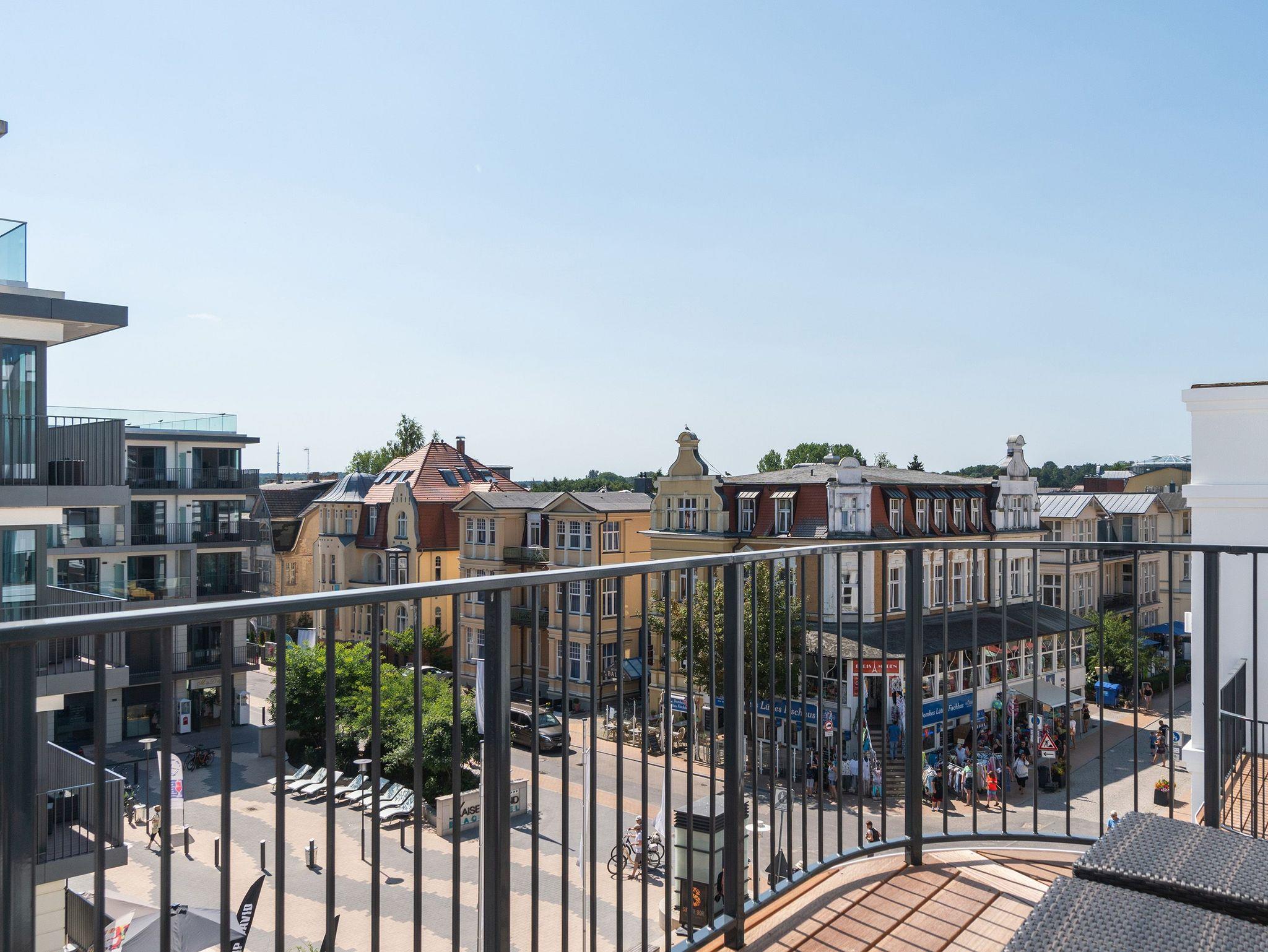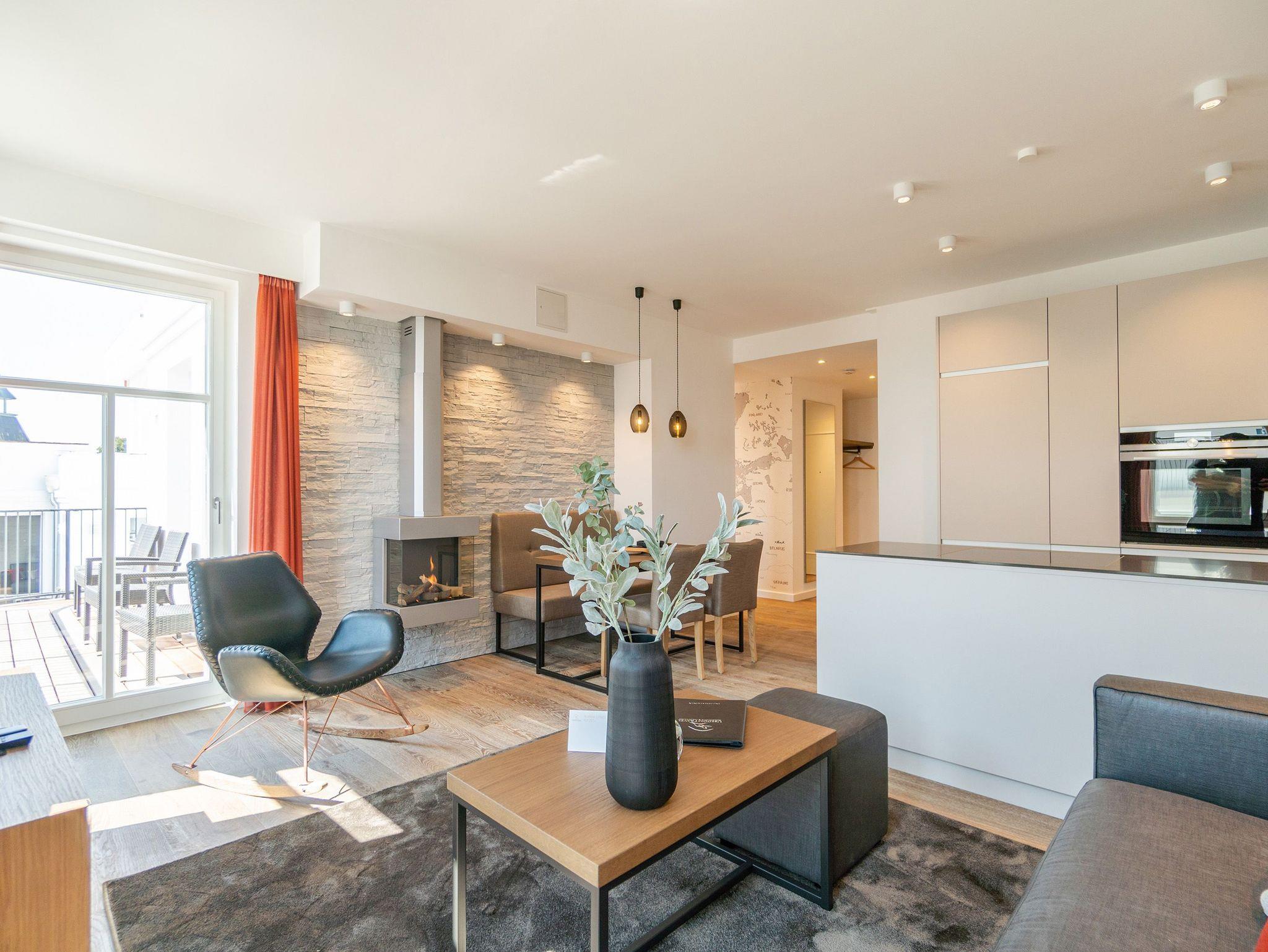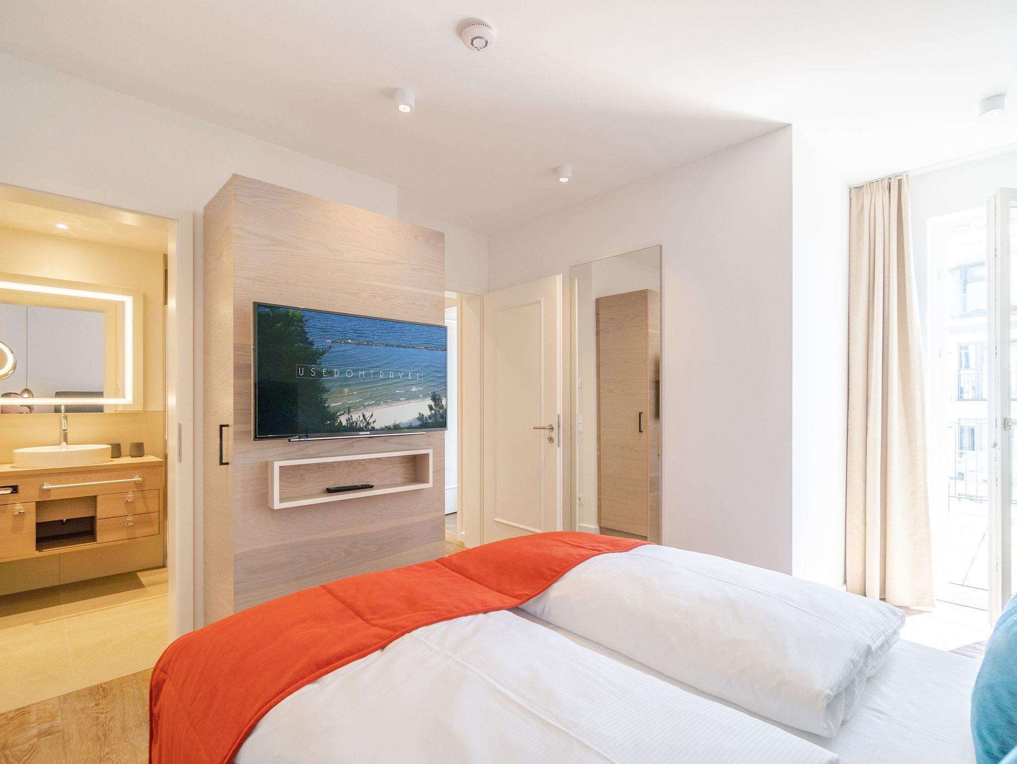 Von der Sonne verwöhnt wird dieses wunderschöne, 66 Quadratmeter große Appartement im 3. Obergeschoss. Schon direkt nach dem Aufstehen können Sie auf dem Balkon nicht nur die Morgensonne, sondern auch den Blick auf die glitzernde Ostsee genießen. Schöner kann der Urlaubstag doch nicht beginnen. Hell und sonnendurchflutet sind auch die drei Räume Ihres Urlaubsdomizils. Exklusivität und modernes Wohndesign treffen hier auf Leichtigkeit und Behaglichkeit. Ausgesuchte Design-Möbel, ein Bose-Soundsystem, das über das Handy bedienbar keine Klangwünsche offen lässt, ein Gas-Kamin, der auf Knopfdruck eine wohlige Kuschelatmosphäre verbreitet ? die Liste an besonderen Annehmlichkeiten, die dieses Appartement zu bieten hat, ist lang. Das offene Wohn-Esszimmer verfügt über einen riesigen Flat-TV, eine gemütliche Sofa-Sitzgruppe mit Schaukelstuhl, einen schönen, großen Esstisch und eine voll ausgestattete Küche. In dieser werden begeisterte Kochherzen höher schlagen. Denn hochwertige Markengeräte, edles Geschirr von ASA, eine von drei Seiten zugängige Kochinsel ? alles in modernem und zeitlos schlichtem Design ? warten nur darauf, dass sie damit ihre kreativen Gaumenfreuden in die Tat umsetzen. Die beiden Schlafzimmer sind mit bequemen Boxspringdoppelbetten (1,60 x 2,00), ablagefreudigen Schränken, Flat-TV und einem Zugang zum umlaufenden Süd-Ost-Balkon ausgestattet. Lassen Sie sich einfach fallen. Den Rest erledigt die wunderbare Wohlfühlatmosphäre. In zwei Bädern können sich Auszeithungrige frisch machen. Beide Badezimmer besitzen geräumige Regen-Duschen, einen großzügigen Waschtisch und ein WC. Wellness-Highlight des Masterbades ist eine Panoramasauna, die eine ganz private Entspannungsauszeit an kühlen Tagen oder Abenden erlaubt. In der Wohnung gibt es einen kleinen Abstellraum mit einem Waschtrockner. Bei uns wird Rundum-sorglos groß geschrieben. Darum sind bei Ihrer Anreise die Betten bezogen und Handtücher liegen für Sie bereit. Zudem ist das WLAN in der Wohnung kostenfrei. In der hochmodernen Tiefgarage ist für Sie der Pkw-Stellplatz Nr. 21 reserviert.