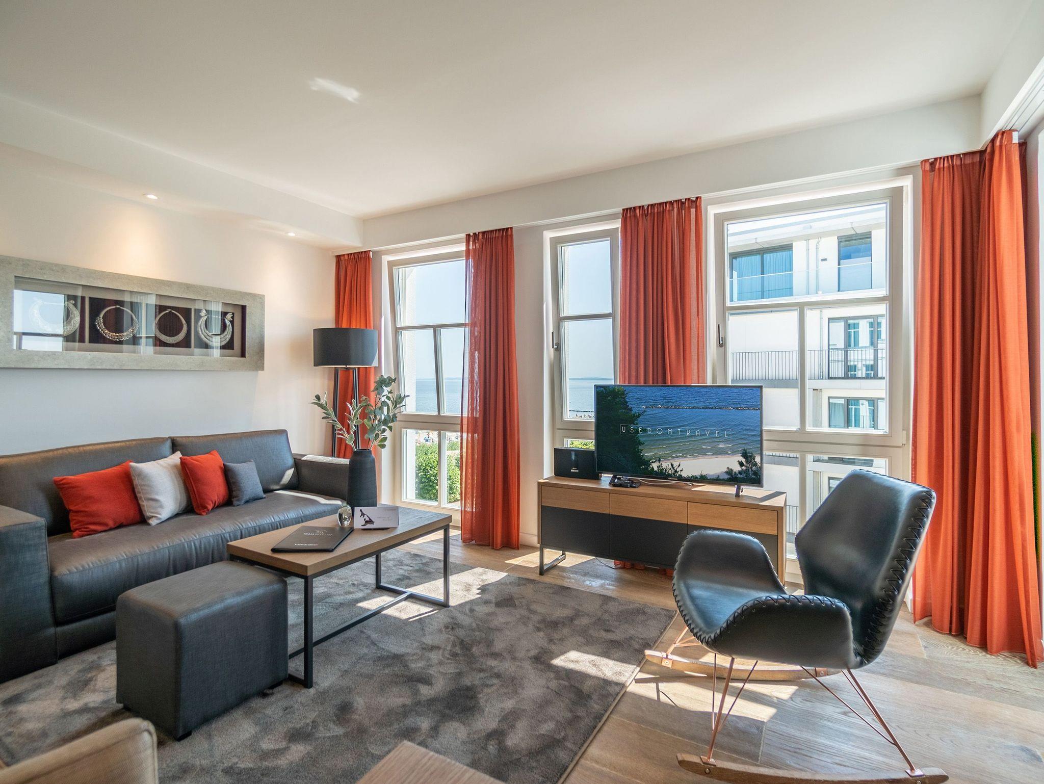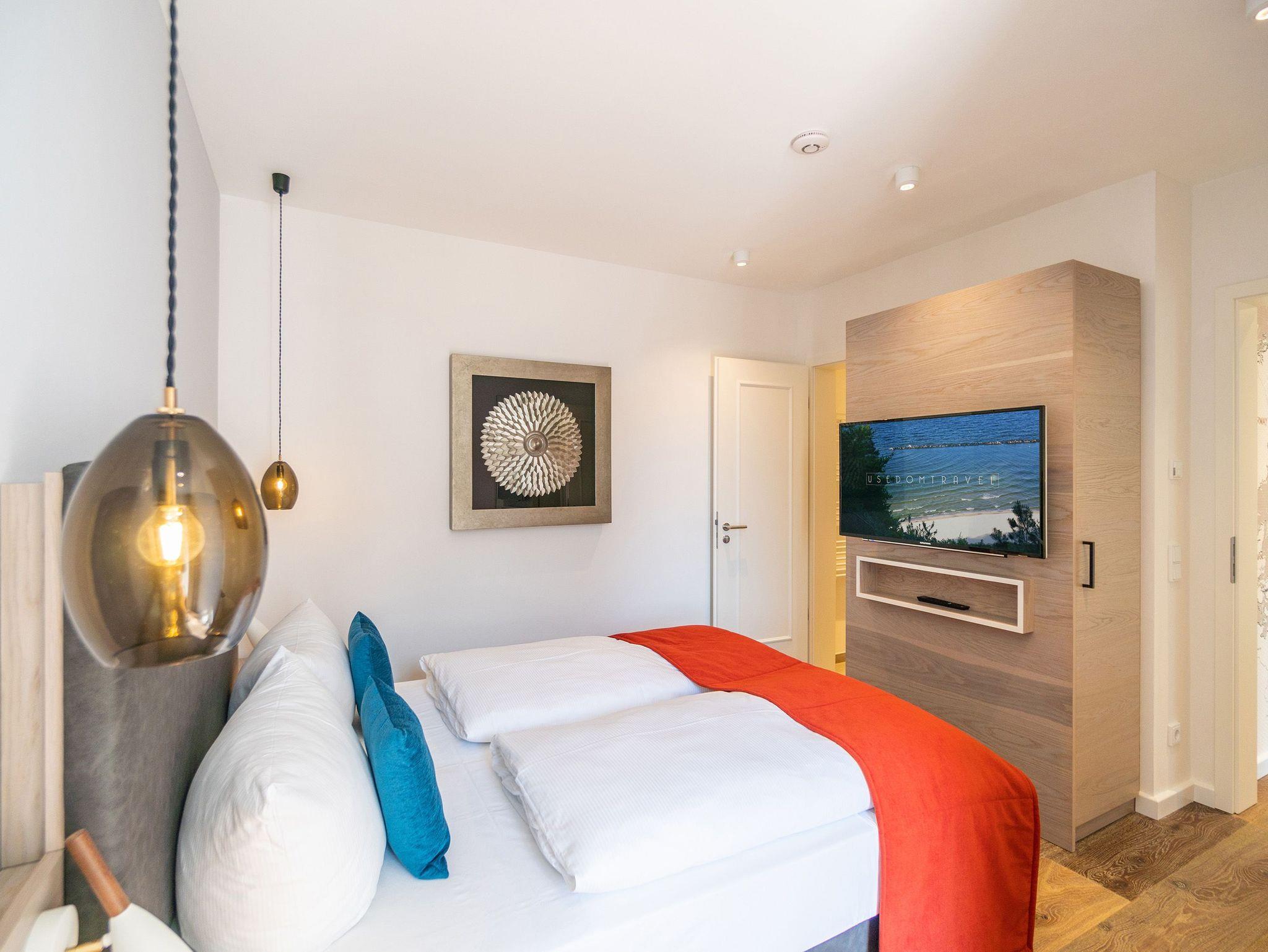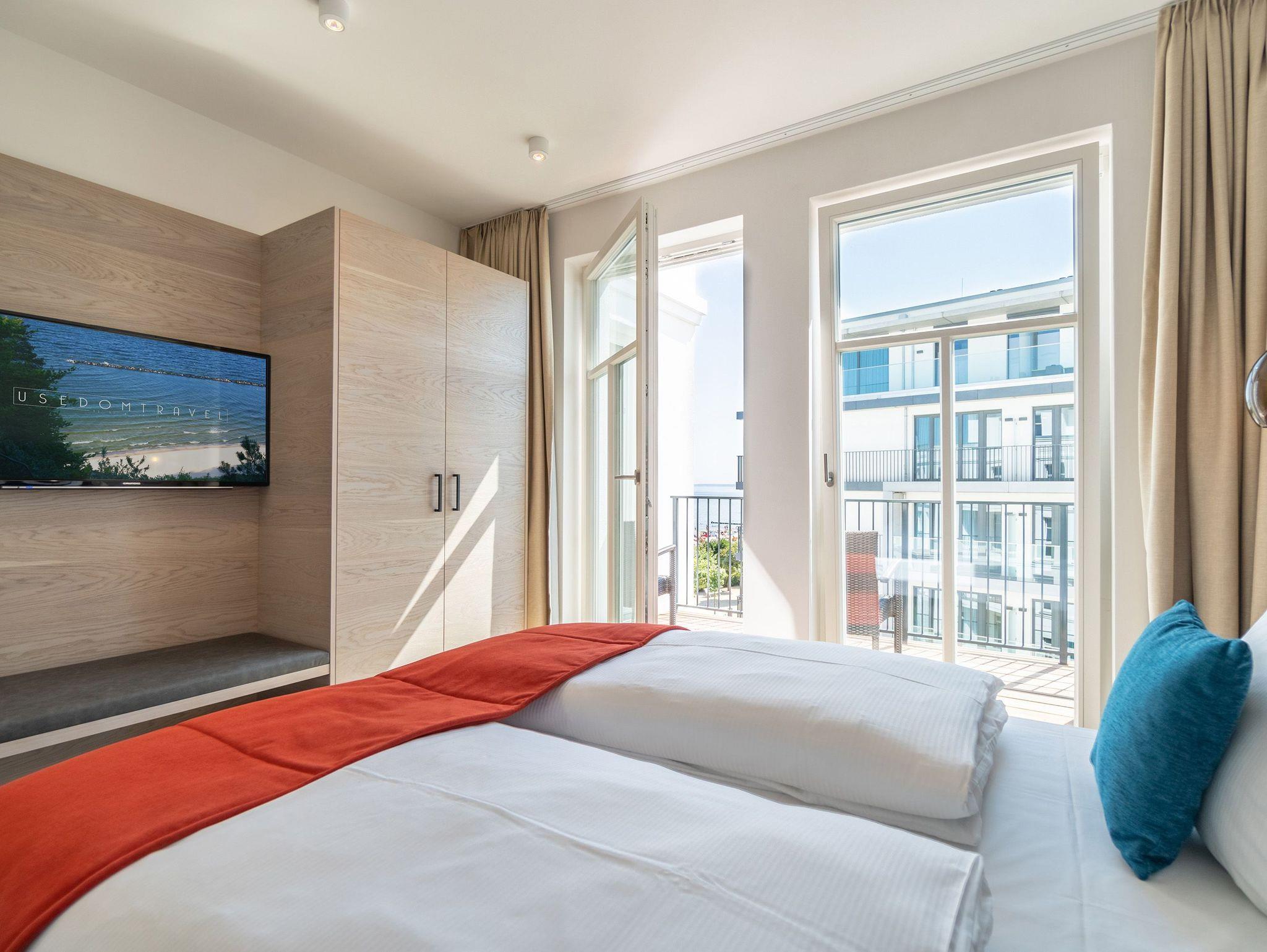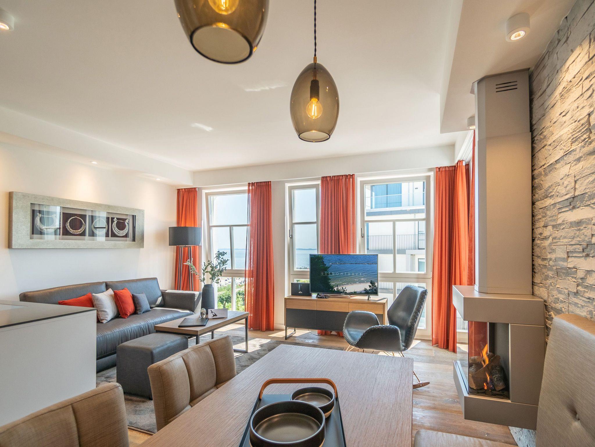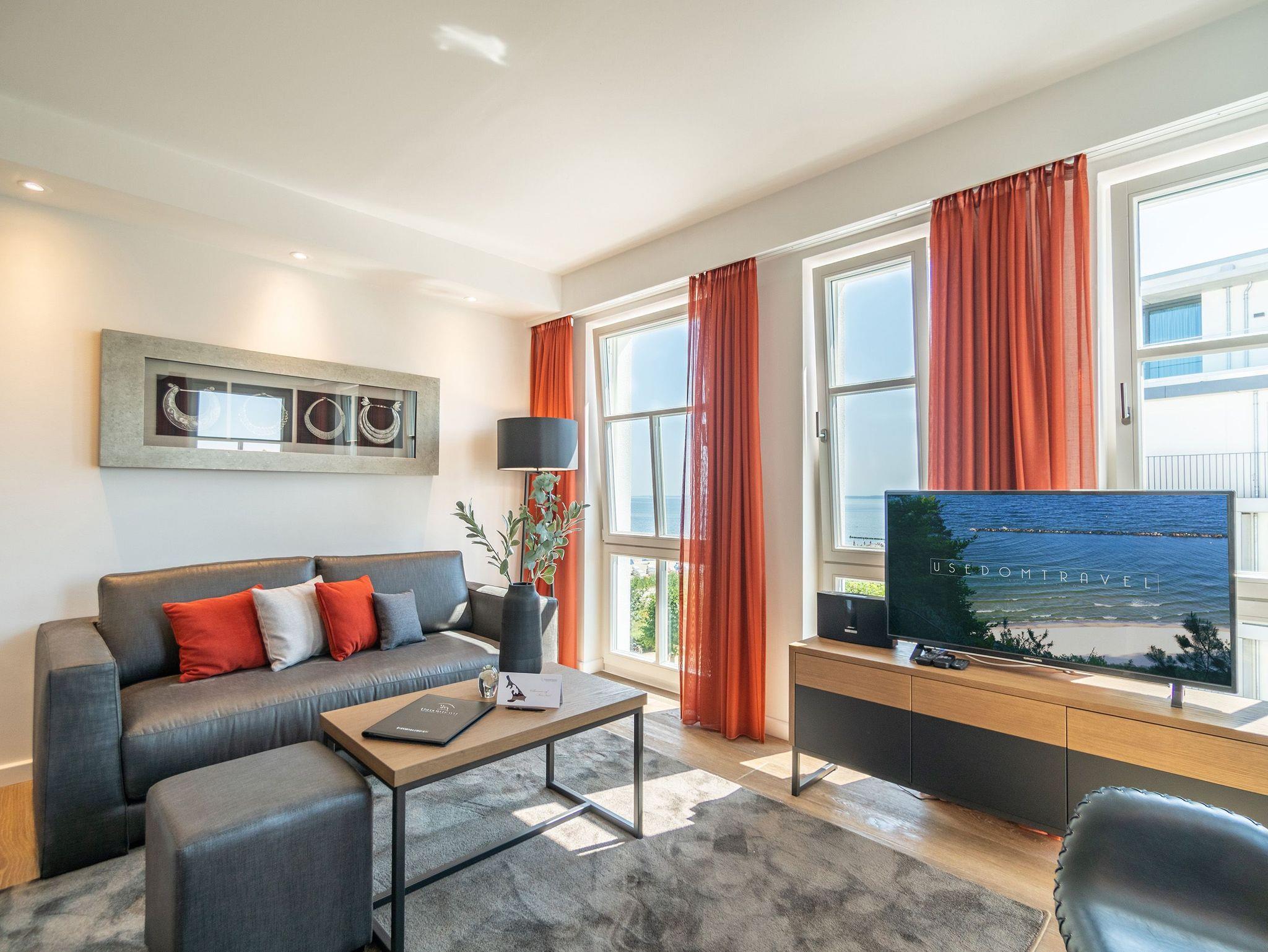 Von der Sonne verwöhnt wird dieses wunderschöne, 66 Quadratmeter große Appartement im 3. Obergeschoss. Schon direkt nach dem Aufstehen können Sie auf dem Balkon nicht nur die Morgensonne, sondern auch den Blick auf die glitzernde Ostsee genießen. Schöner kann der Urlaubstag doch nicht beginnen. Hell und sonnendurchflutet sind auch die drei Räume Ihres Urlaubsdomizils. Exklusivität und modernes Wohndesign treffen hier auf Leichtigkeit und Behaglichkeit. Ausgesuchte Design-Möbel, ein Bose-Soundsystem, das über das Handy bedienbar keine Klangwünsche offen lässt, ein Gas-Kamin, der auf Knopfdruck eine wohlige Kuschelatmosphäre verbreitet die Liste an besonderen Annehmlichkeiten, die dieses Appartement zu bieten hat, ist lang. Das offene Wohn-Esszimmer verfügt über einen riesigen Flat-TV, eine gemütliche Sofa-Sitzgruppe mit Schaukelstuhl, einen schönen, großen Esstisch und eine voll ausgestattete Küche. In dieser werden begeisterte Kochherzen höher schlagen. Denn hochwertige Markengeräte, edles Geschirr von ASA, eine von drei Seiten zugängige Kochinsel alles in modernem und zeitlos schlichtem Design warten nur darauf, dass sie damit ihre kreativen Gaumenfreuden in die Tat umsetzen. Die beiden Schlafzimmer sind mit bequemen Boxspringdoppelbetten (1,60 x 2,00), ablagefreudigen Schränken, Flat-TV und einem Zugang zum umlaufenden Süd-Ost-Balkon ausgestattet. Lassen Sie sich einfach fallen. Den Rest erledigt die wunderbare Wohlfühlatmosphäre. In zwei Bädern können sich Auszeithungrige frisch machen. Beide Badezimmer besitzen geräumige Regen-Duschen, einen großzügigen Waschtisch und ein WC. Wellness-Highlight des Masterbades ist eine Panoramasauna, die eine ganz private Entspannungsauszeit an kühlen Tagen oder Abenden erlaubt. In der Wohnung gibt es einen kleinen Abstellraum mit einem Waschtrockner. Bei uns wird Rundum-sorglos groß geschrieben. Darum sind bei Ihrer Anreise die Betten bezogen und Handtücher liegen für Sie bereit. Zudem ist das WLAN in der Wohnung kostenfrei. In der hochmodernen Tiefgarage ist für Sie der Pkw-Stellplatz Nr. 21 reserviert.