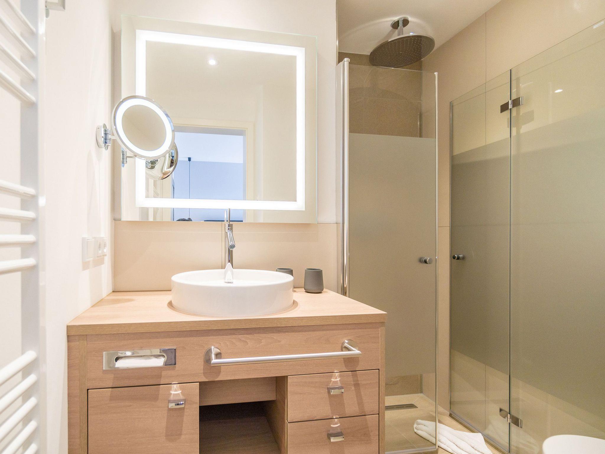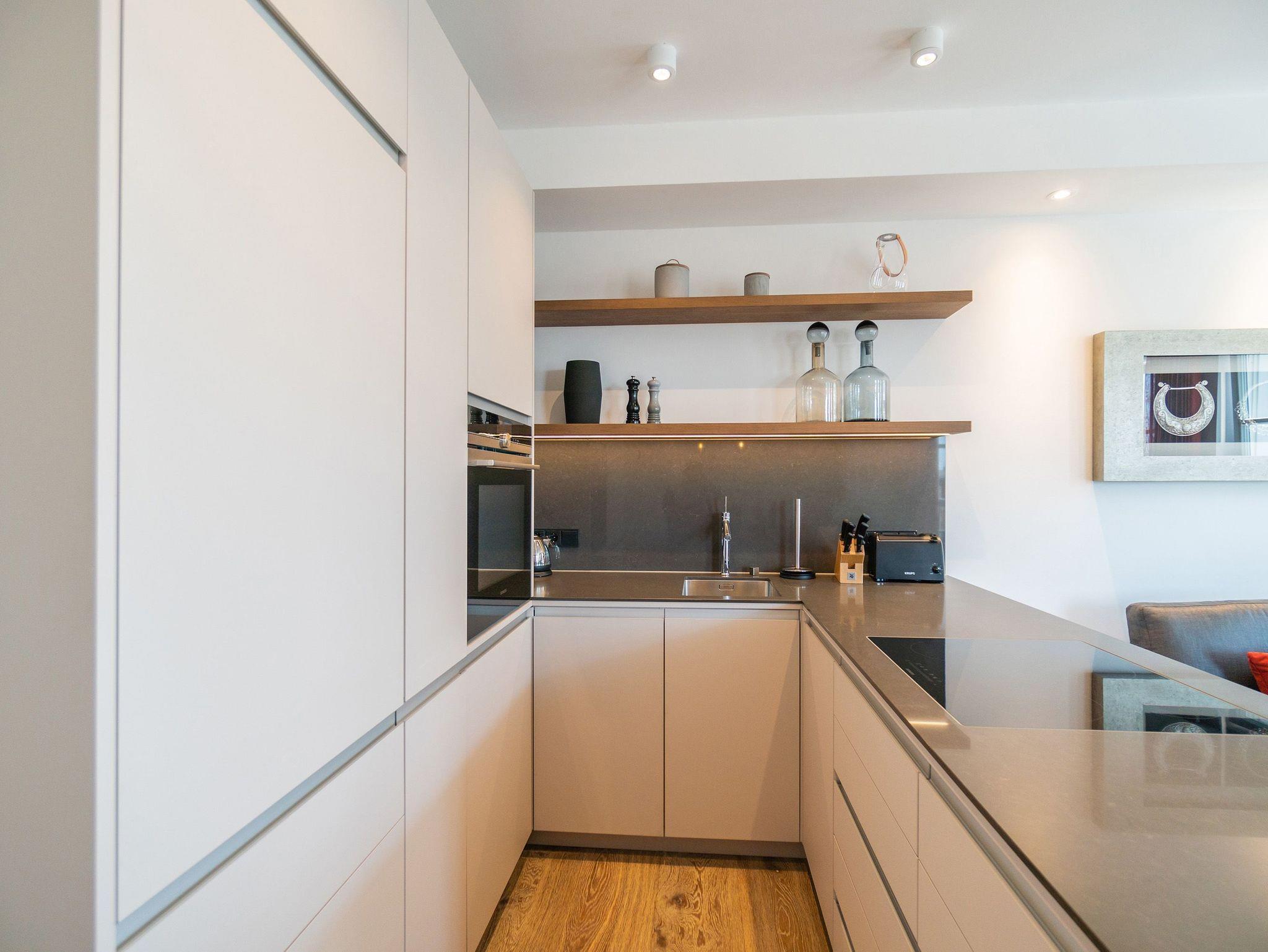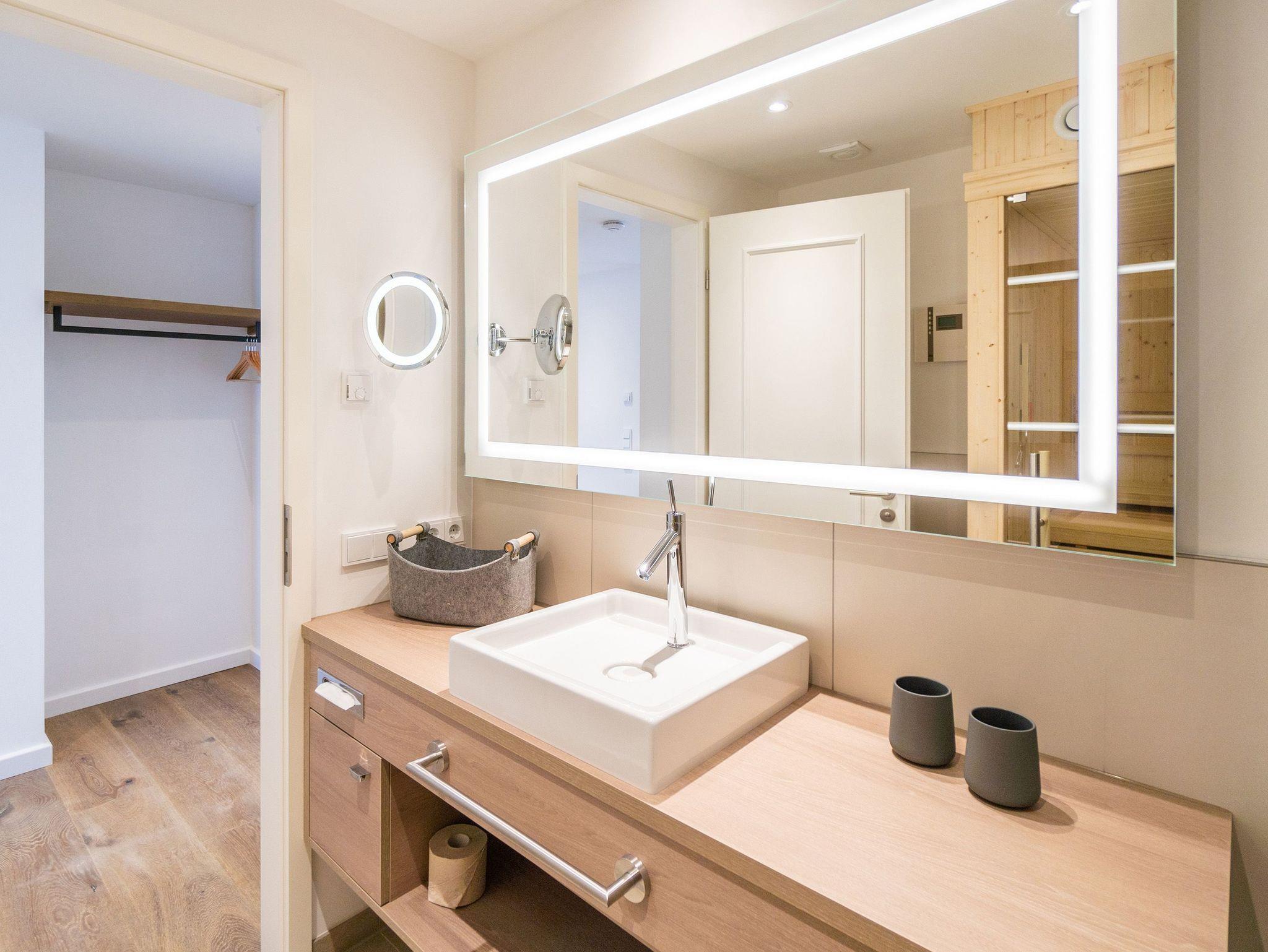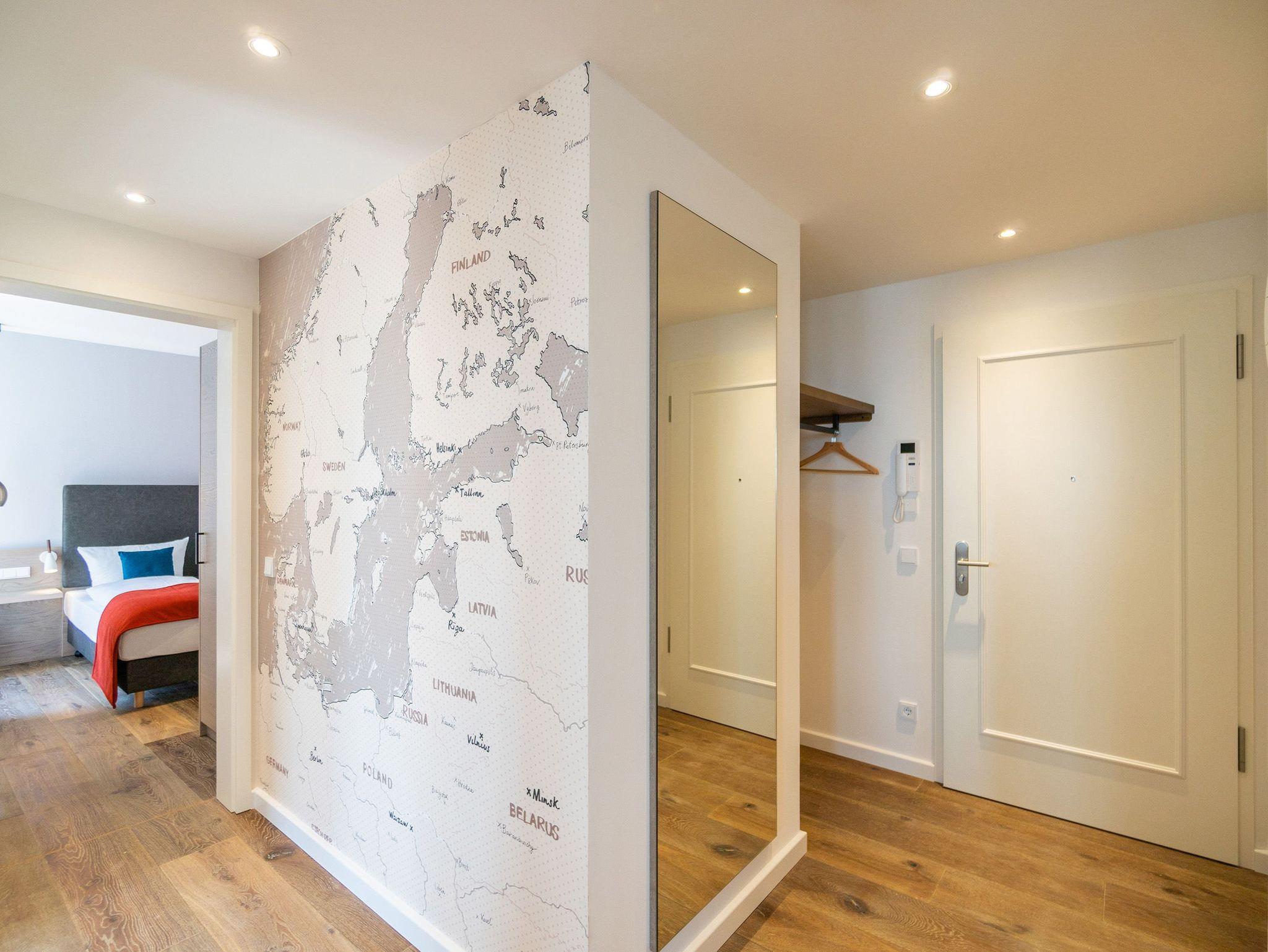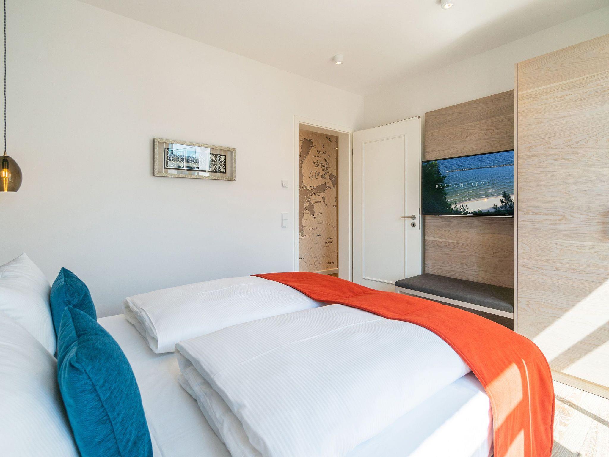 Von der Sonne verwöhnt wird dieses wunderschöne, 66 Quadratmeter große Appartement im 3. Obergeschoss. Schon direkt nach dem Aufstehen können Sie auf dem Balkon nicht nur die Morgensonne, sondern auch den Blick auf die glitzernde Ostsee genießen. Schöner kann der Urlaubstag doch nicht beginnen. Hell und sonnendurchflutet sind auch die drei Räume Ihres Urlaubsdomizils. Exklusivität und modernes Wohndesign treffen hier auf Leichtigkeit und Behaglichkeit. Ausgesuchte Design-Möbel, ein Bose-Soundsystem, das über das Handy bedienbar keine Klangwünsche offen lässt, ein Gas-Kamin, der auf Knopfdruck eine wohlige Kuschelatmosphäre verbreitet die Liste an besonderen Annehmlichkeiten, die dieses Appartement zu bieten hat, ist lang. Das offene Wohn-Esszimmer verfügt über einen riesigen Flat-TV, eine gemütliche Sofa-Sitzgruppe mit Schaukelstuhl, einen schönen, großen Esstisch und eine voll ausgestattete Küche. In dieser werden begeisterte Kochherzen höher schlagen. Denn hochwertige Markengeräte, edles Geschirr von ASA, eine von drei Seiten zugängige Kochinsel alles in modernem und zeitlos schlichtem Design warten nur darauf, dass sie damit ihre kreativen Gaumenfreuden in die Tat umsetzen. Die beiden Schlafzimmer sind mit bequemen Boxspringdoppelbetten (1,60 x 2,00), ablagefreudigen Schränken, Flat-TV und einem Zugang zum umlaufenden Süd-Ost-Balkon ausgestattet. Lassen Sie sich einfach fallen. Den Rest erledigt die wunderbare Wohlfühlatmosphäre. In zwei Bädern können sich Auszeithungrige frisch machen. Beide Badezimmer besitzen geräumige Regen-Duschen, einen großzügigen Waschtisch und ein WC. Wellness-Highlight des Masterbades ist eine Panoramasauna, die eine ganz private Entspannungsauszeit an kühlen Tagen oder Abenden erlaubt. In der Wohnung gibt es einen kleinen Abstellraum mit einem Waschtrockner. Bei uns wird Rundum-sorglos groß geschrieben. Darum sind bei Ihrer Anreise die Betten bezogen und Handtücher liegen für Sie bereit. Zudem ist das WLAN in der Wohnung kostenfrei. In der hochmodernen Tiefgarage ist für Sie der Pkw-Stellplatz Nr. 21 reserviert.