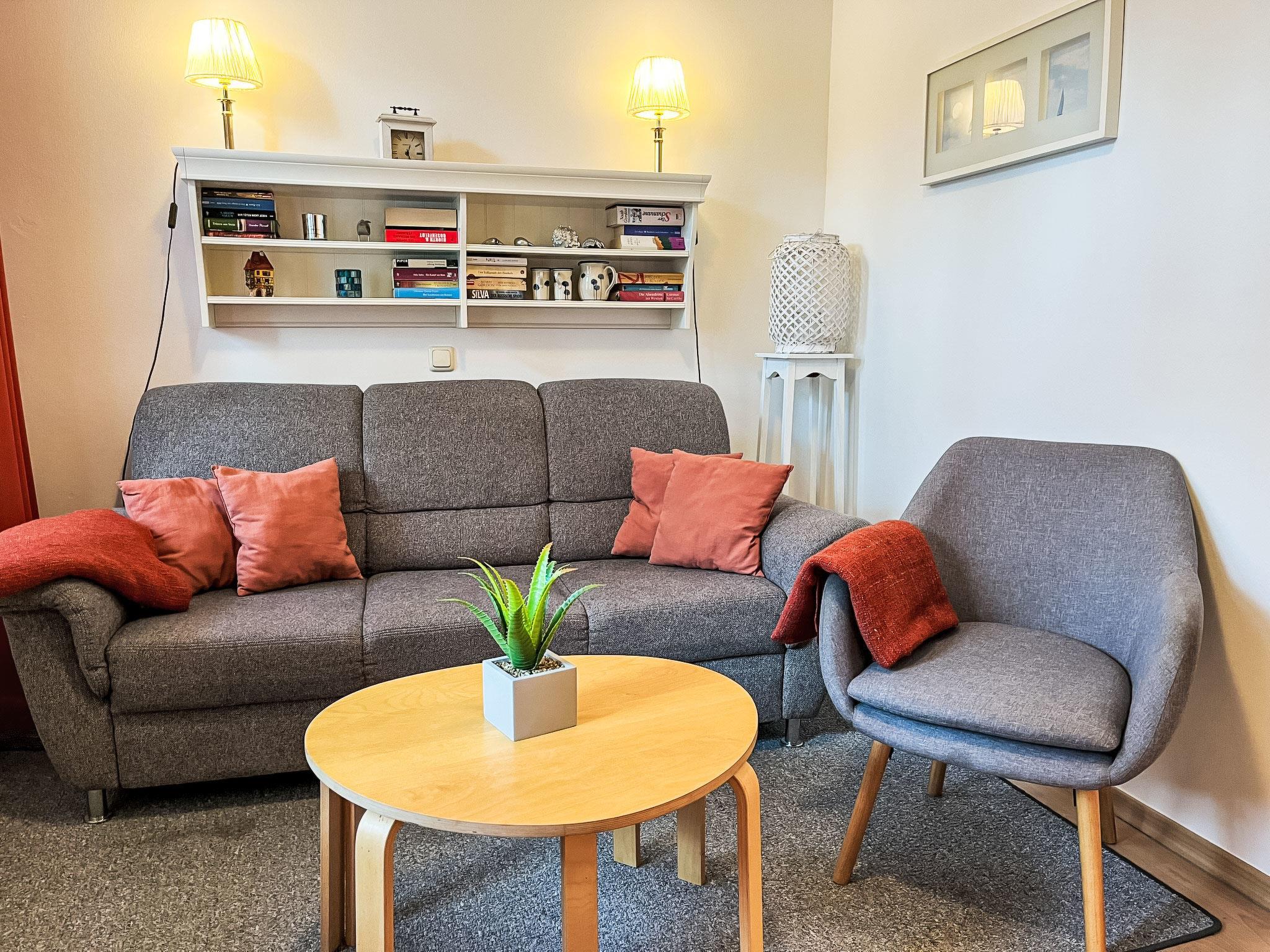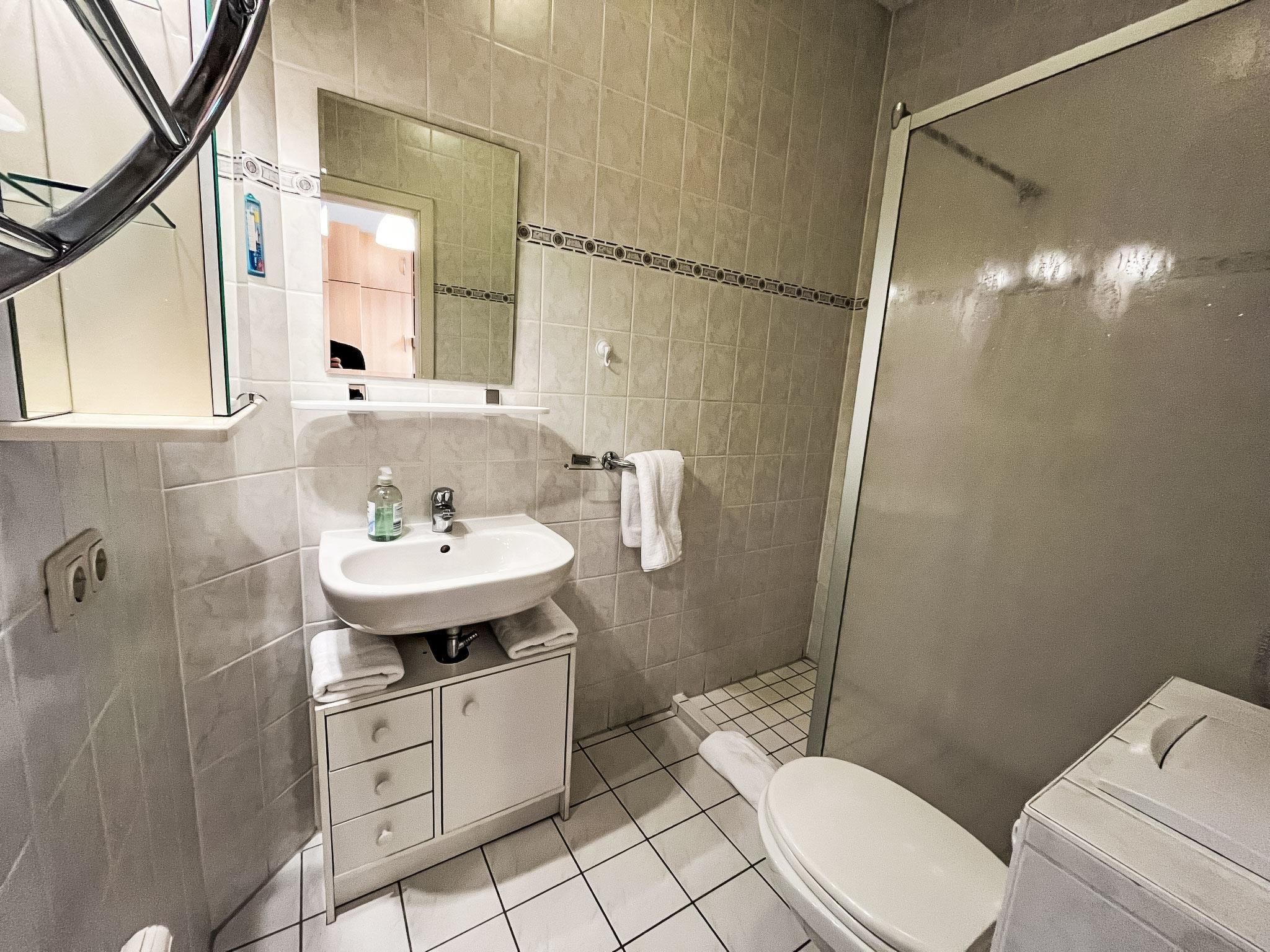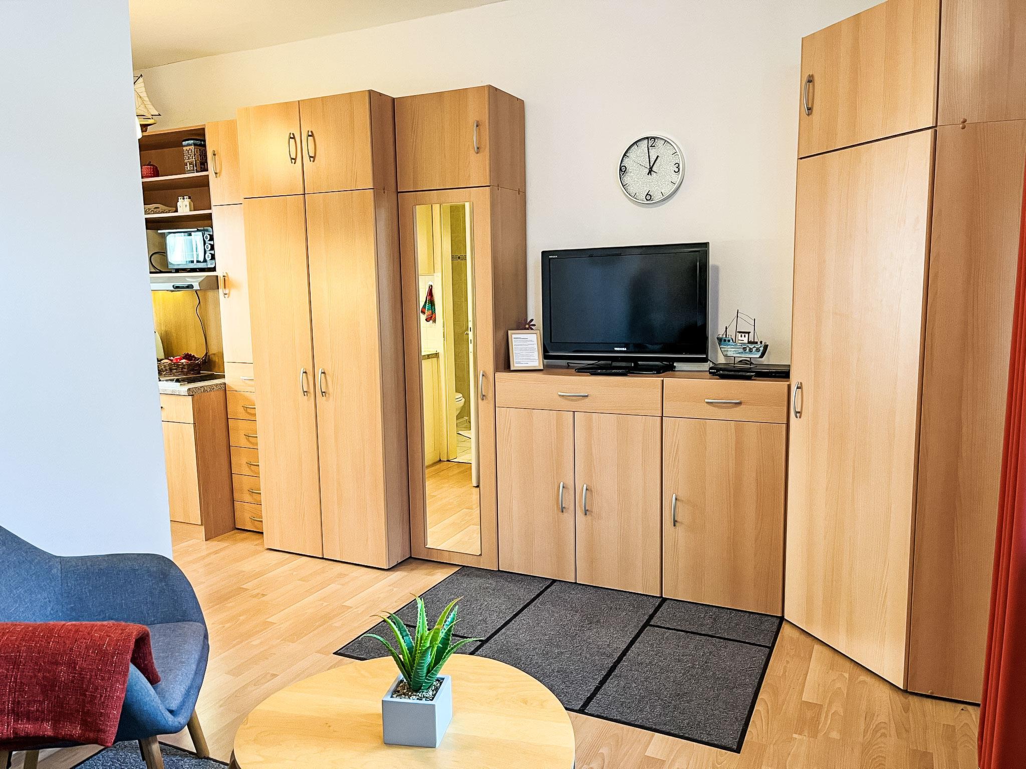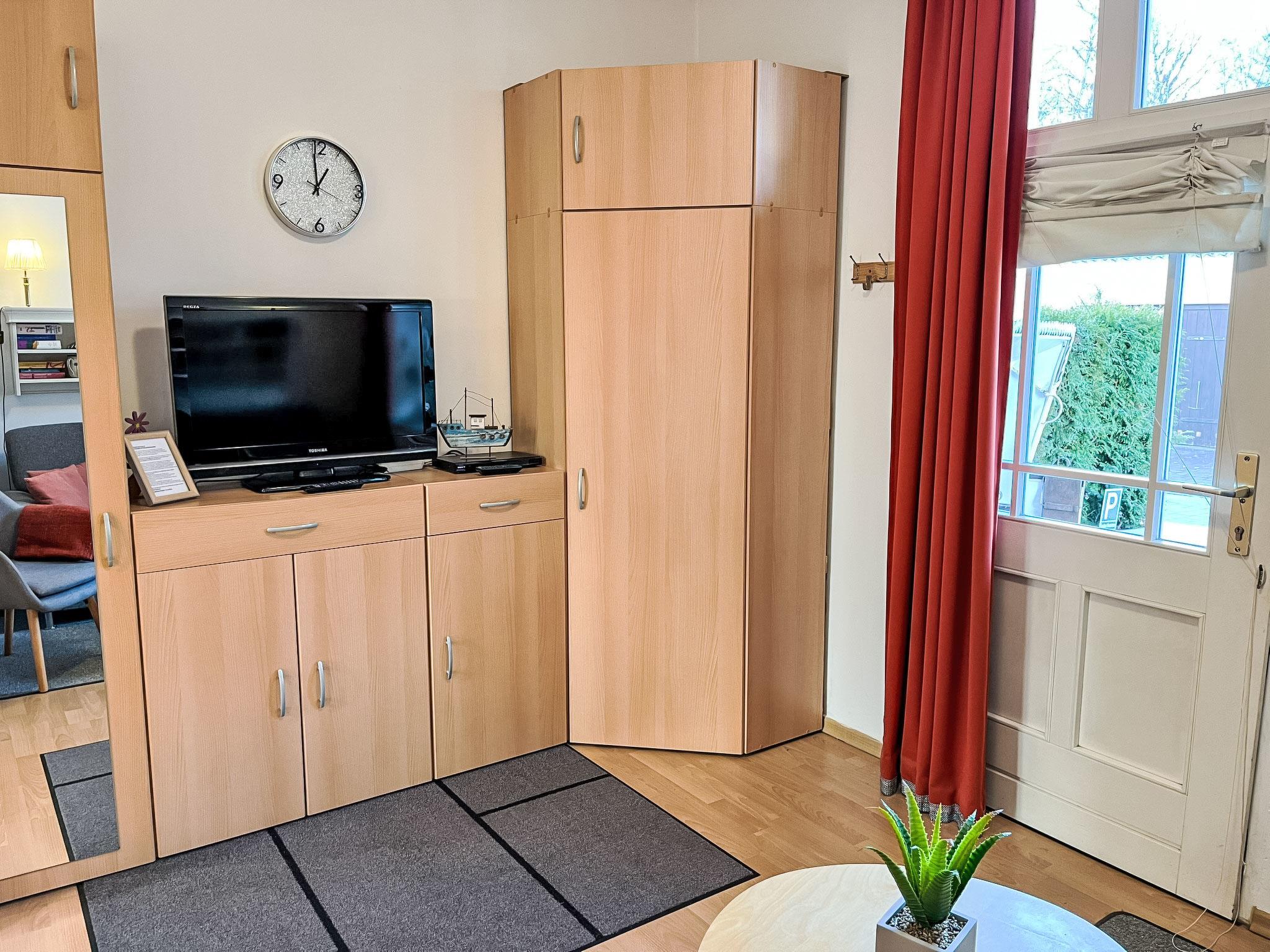 "Bergstraße", 1-room apartment 32 m2, on the ground floor. Bright, renovated in 2022, modern and cosy furnishings: living room with satellite TV, radio and DVD. Exit to the terrace. 1 open small room with 1 double bed (2 x 80 cm, length 200 cm). Open kitchen (mini-oven, dishwasher, 2 ceramic glass hob hotplates, toaster, kettle, microwave, electric coffee machine) with dining table. Shower/WC. Heating. Terrace partly roofed. Terrace furniture. Facilities: children's high chair, baby cot. Internet (WiFi, free). Parking (1 car). Please note: non-smokers only. Maximum 2 pets/ dogs allowed. Smoke alarm.