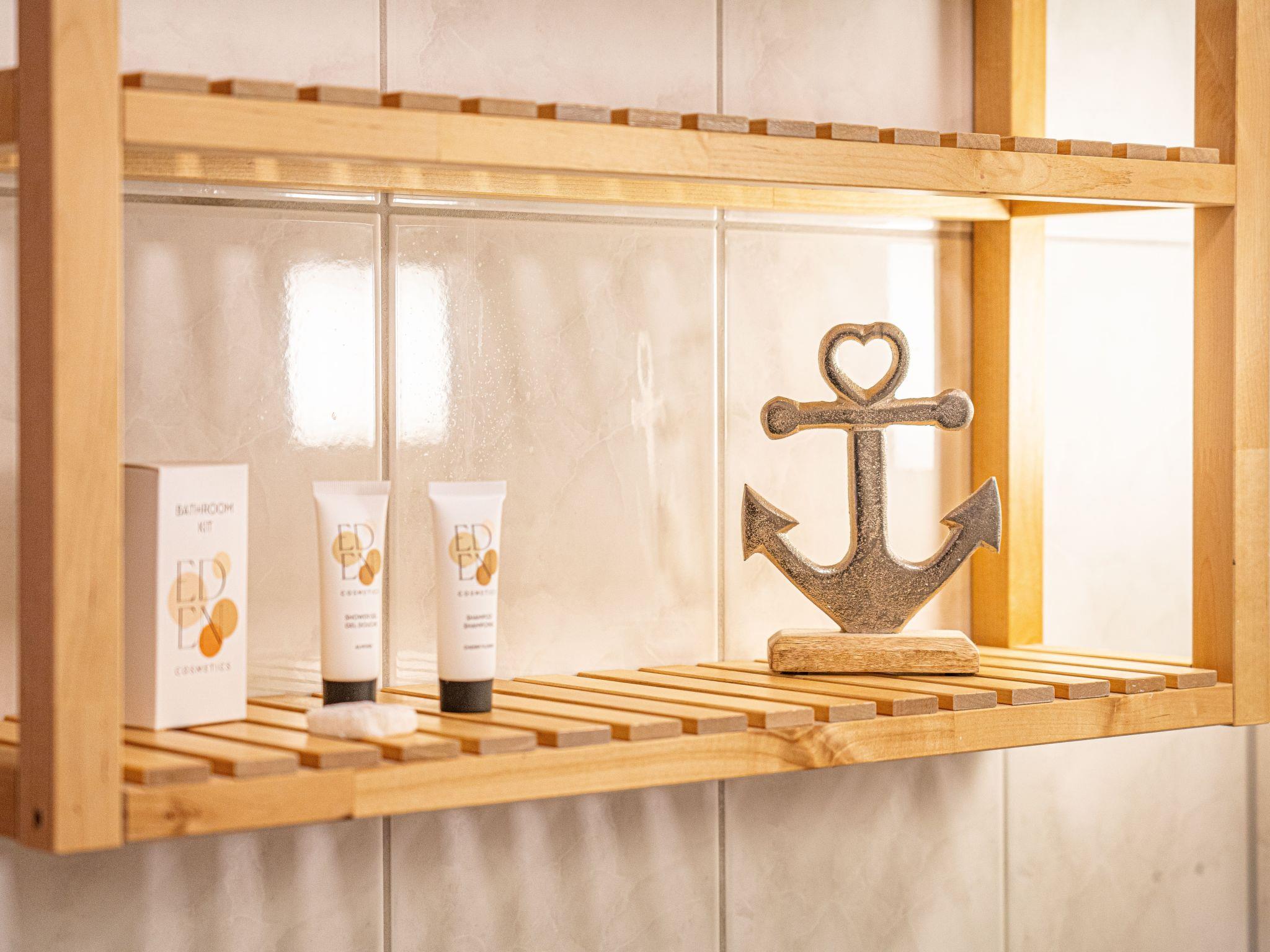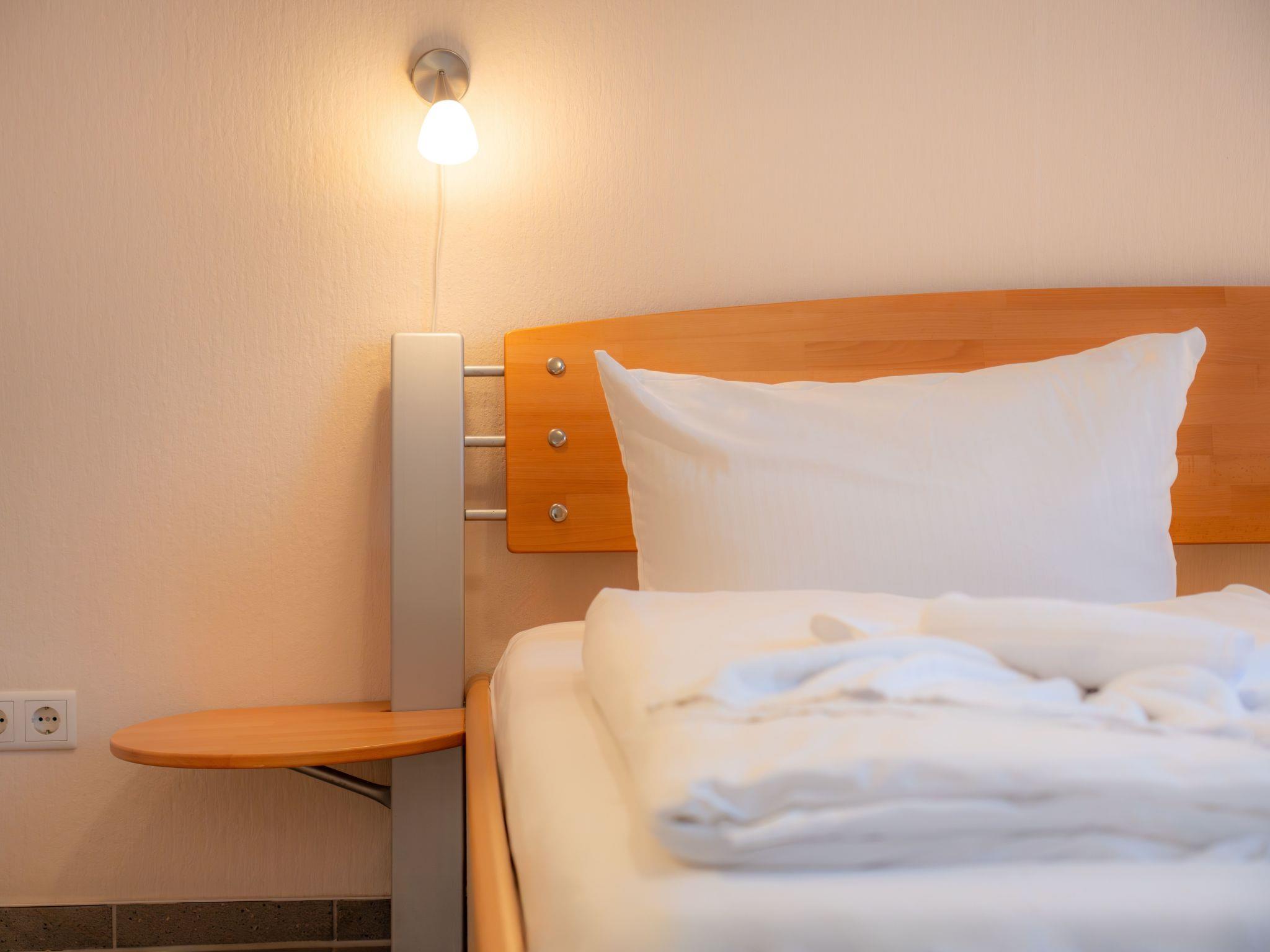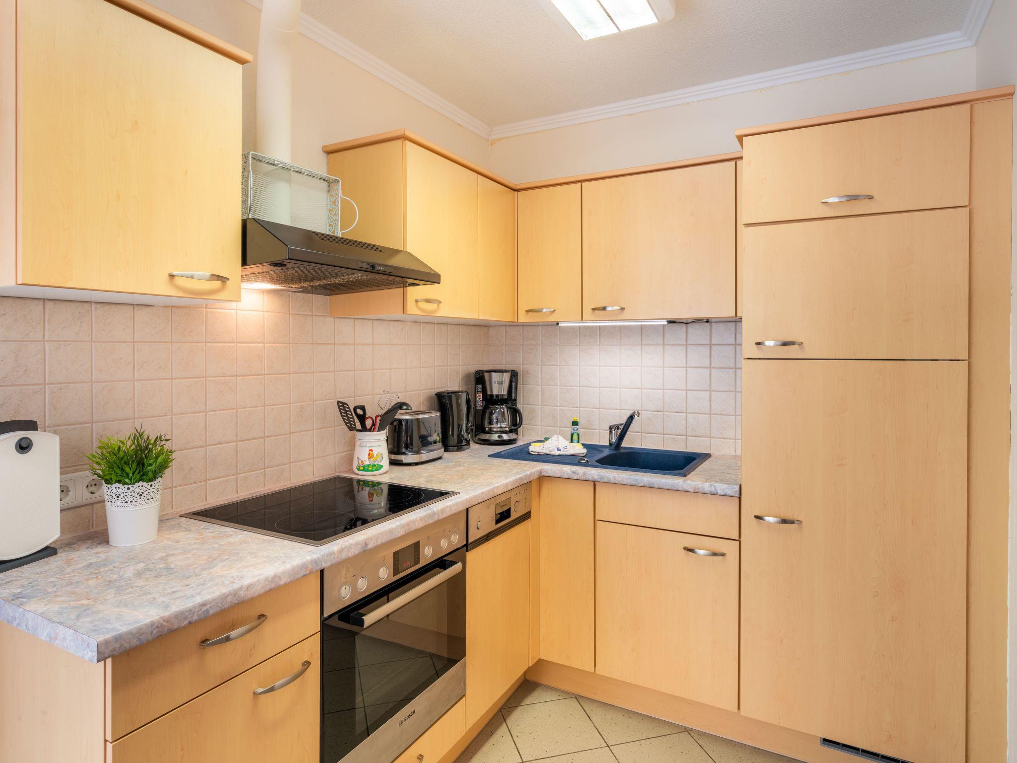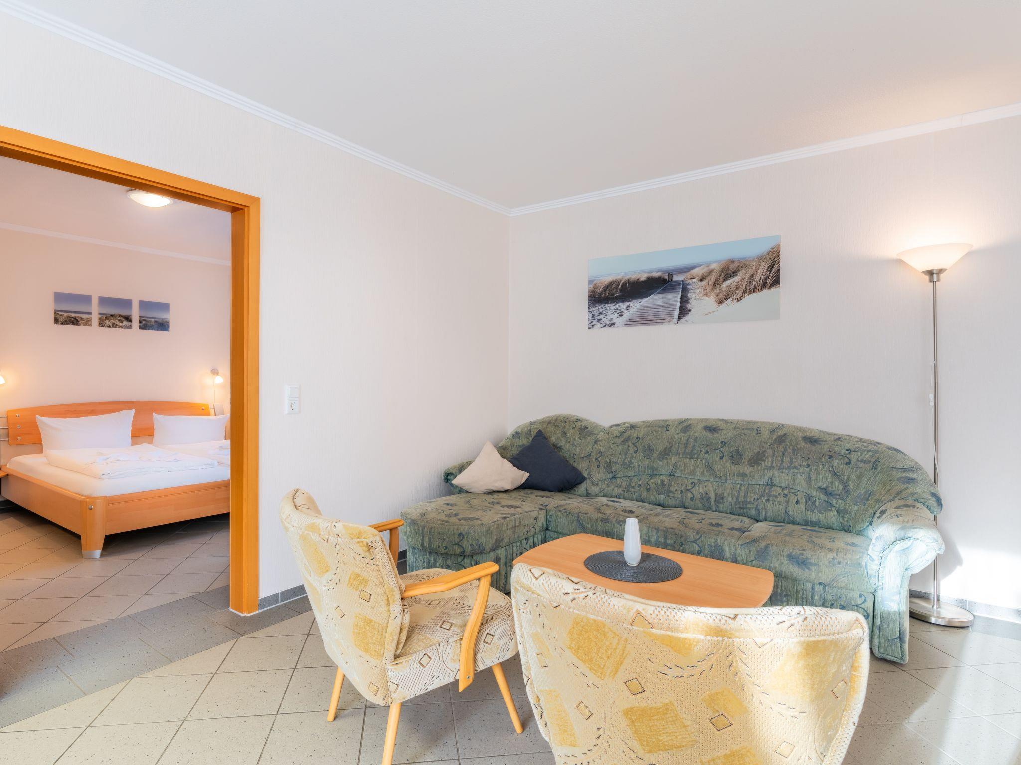 Inside, you will find a practical yet cosy interior. The centrepiece of the flat is a lovingly designed living and dining area with a sofa bed that invites you to linger. An open-plan kitchen, fully equipped with hob, oven, coffee machine, kettle, fridge and dishwasher, leaves nothing to be desired. The bedroom has a comfortable 180 cm wide double bed and a large wardrobe with a mirrored door. The barrier-free bathroom boasts a spacious, floor-level shower, which provides cosy warmth even on cooler days thanks to underfloor heating.
