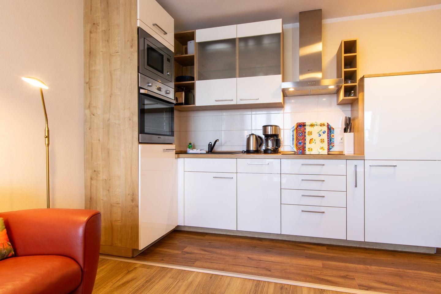 Das Nichtraucherapartment beinhaltet eine voll ausgestattete offene Küche mit Wasserkocher, Kaffeemaschine, Toaster, Hochbackofen mit Induktionskochfeld, Mikrowelle, Eierkocher, Geschirrspüler und Tiefkühlfach.