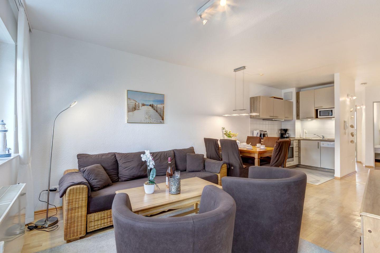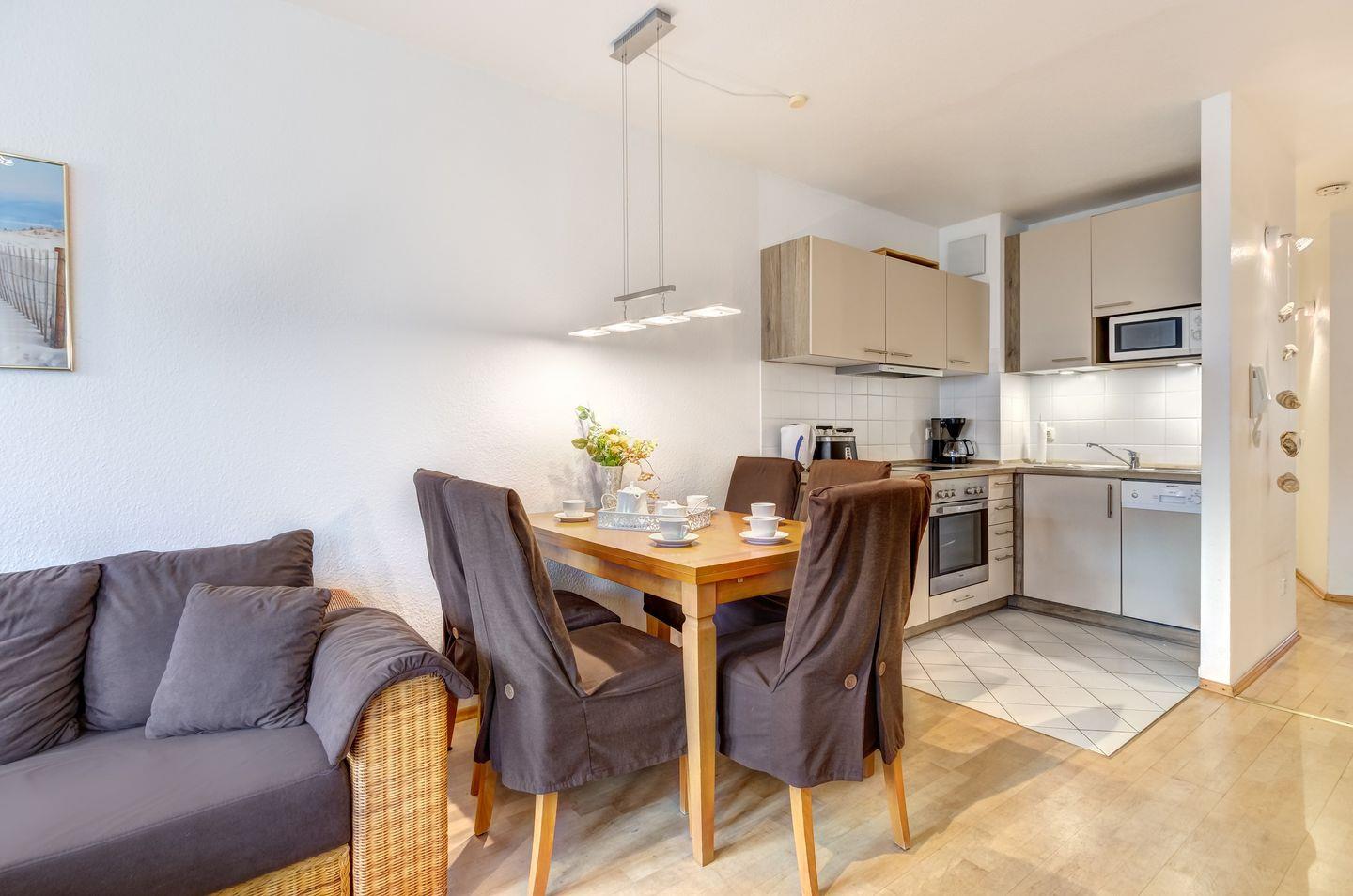 Die helle und freundliche 3-Zimmer-Wohnung liegt im Erdgeschoss und bietet ausreichend Platz für 4 Erwachsene und maximal 1 Kleinkind. Verbringen Sie Ihre Urlaubszeit in einem gemütlichen Wohn- und Essbereich mit TV/DVD/Blu-ray Player sowie auf einer großzügigen Sonnenterrasse. Hier können Sie morgens das Frühstück an frischer Luft oder abends den Tagesausklang bei einem Glas Wein mit weitläufigem Blick ins Grüne genießen.