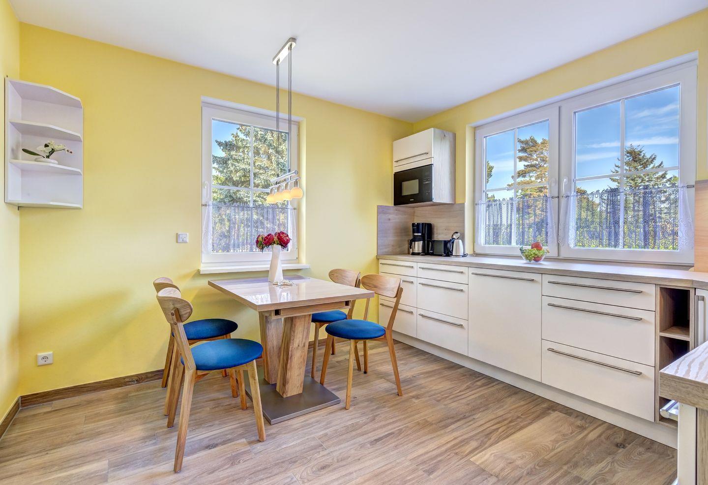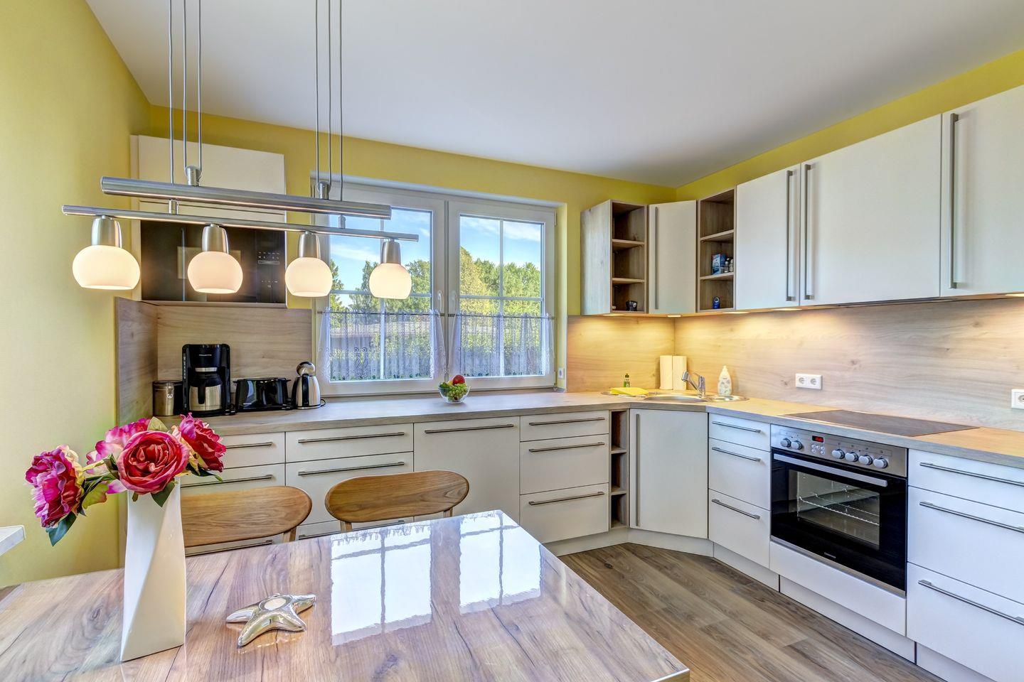 Die separate und modern ausgestattete Küche lässt keine Wünsche mehr offen. Zwei vollwertige Schlafräume in der oberen Etage bieten erholsame Nächte. Für Ihren Komfort sind die Betten bei der Anreise bezogen und Handtücher liegen bereit (Erstausstattung).