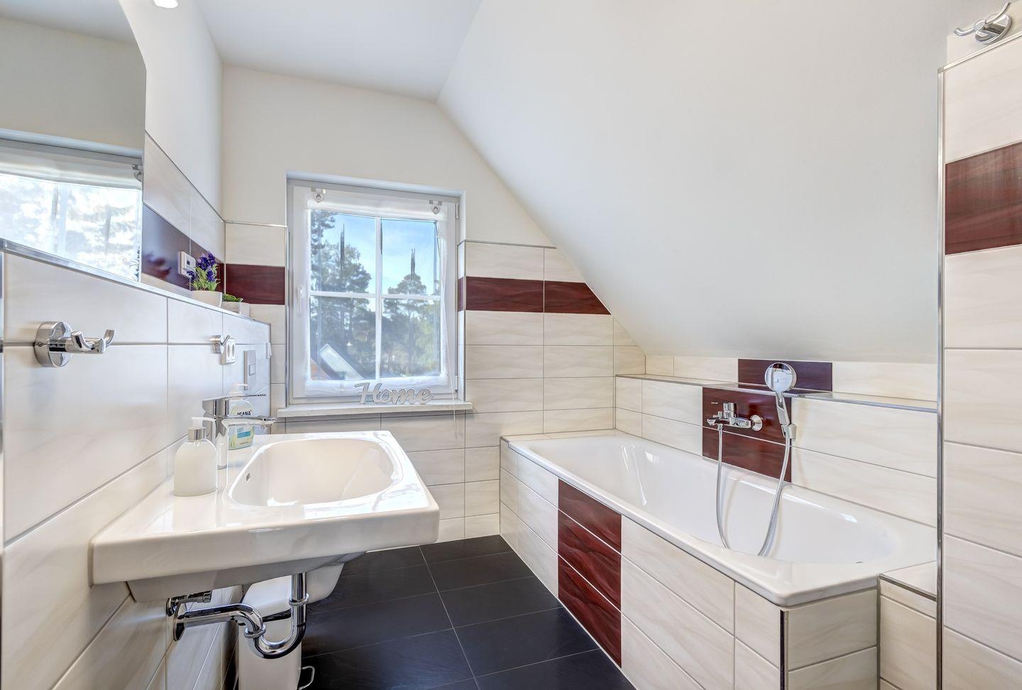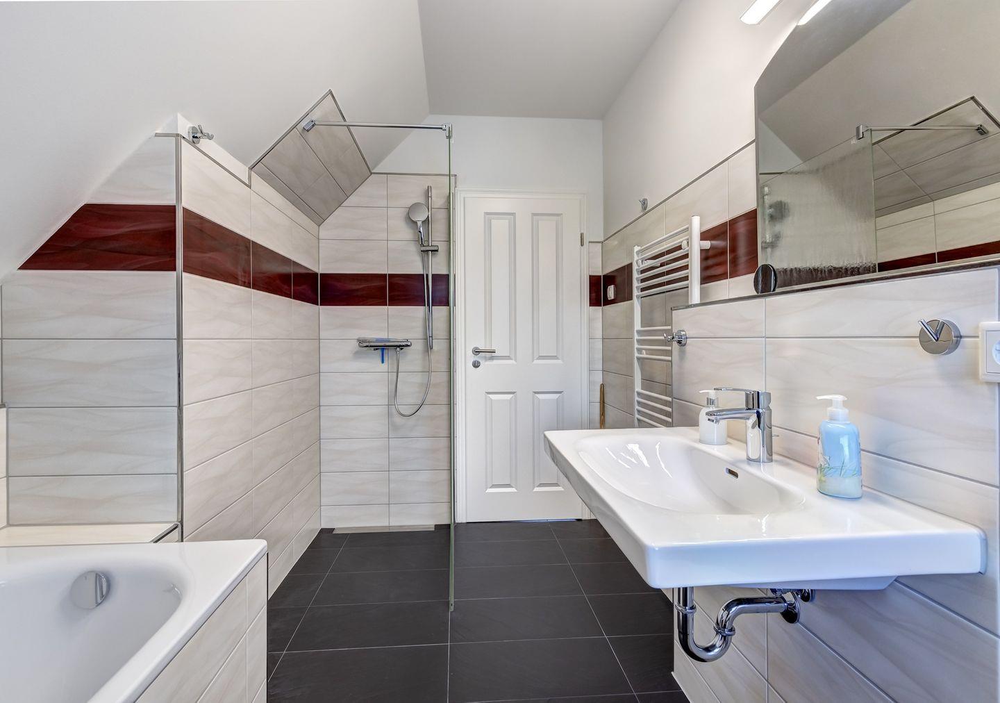 Das Ferienhaus verfügt über zwei Badezimmer (in der unteren Etage befindet sich ein Bad mit Dusche, in der oberen Etage ein Bad mit Dusche und Badewanne).