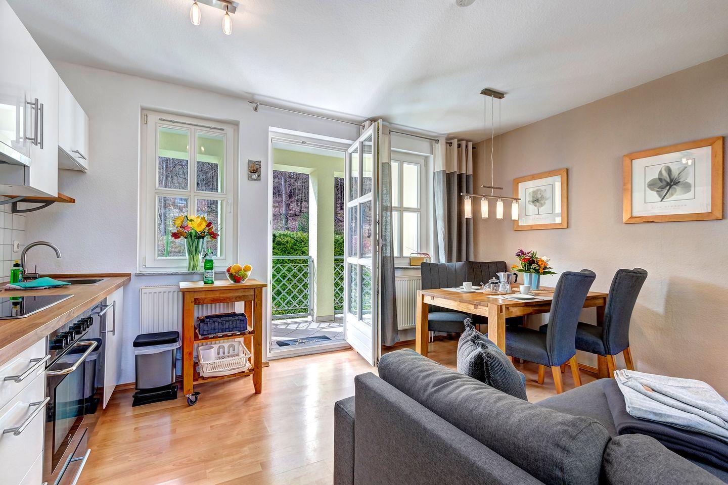 Diese im 1 Stock der Wohnanlage gelegene 2 Zimmer Wohnung hat eine absolut seltene Besonderheit. Durch die Architektur des Gebäudes verfügt das Wohnzimmer über eine Fensterfront mit einem kleinen Balkon in Nordrichtung (Ostsee) wie auch gleichzeitig über eine Fensterfront und einen großen Balkon in südlicher Ausrichtung (Sonnenseite).Die Einrichtung mit eleganten und hochwertigen Möbeln, einer komplett ausgestatteten Einbauküche lässt keine Urlaubswünsche an ein modernes Ferienappartement offen.