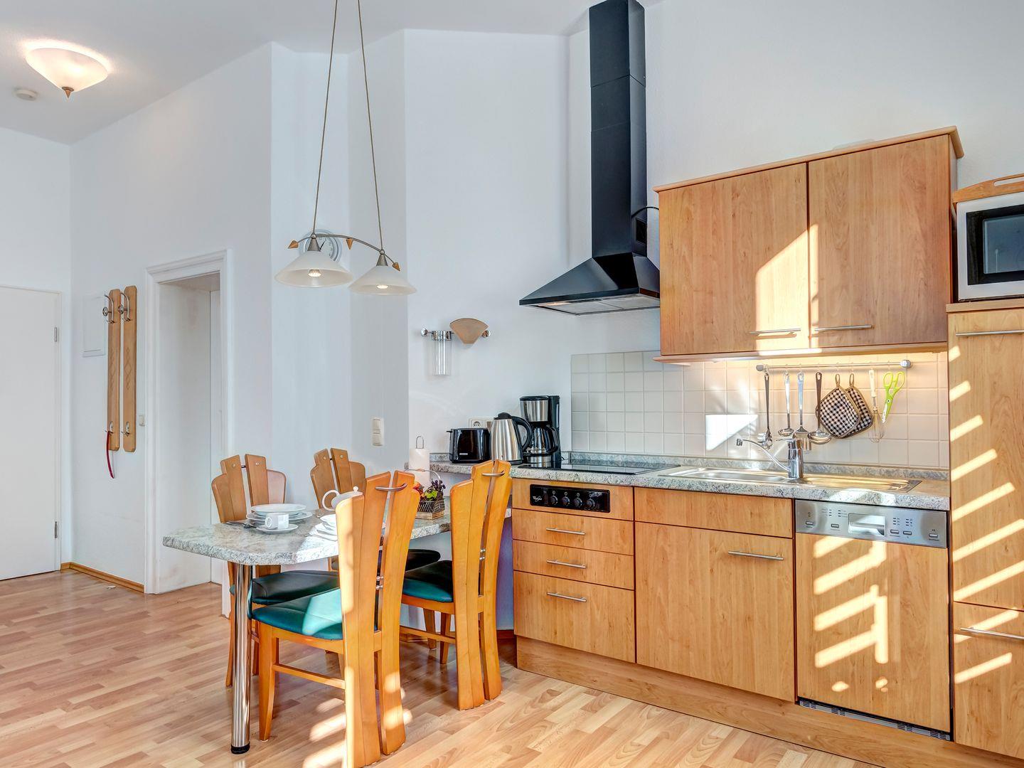 In der offenen, vollausgestatteten Küche mit Essbereich können Sie bequem für sich und Ihre Lieben kochen. Ein modernes Duschbad vervollständigt das hochwertige Interieur und garantiert Komfort und Wohlfühlatmosphäre.