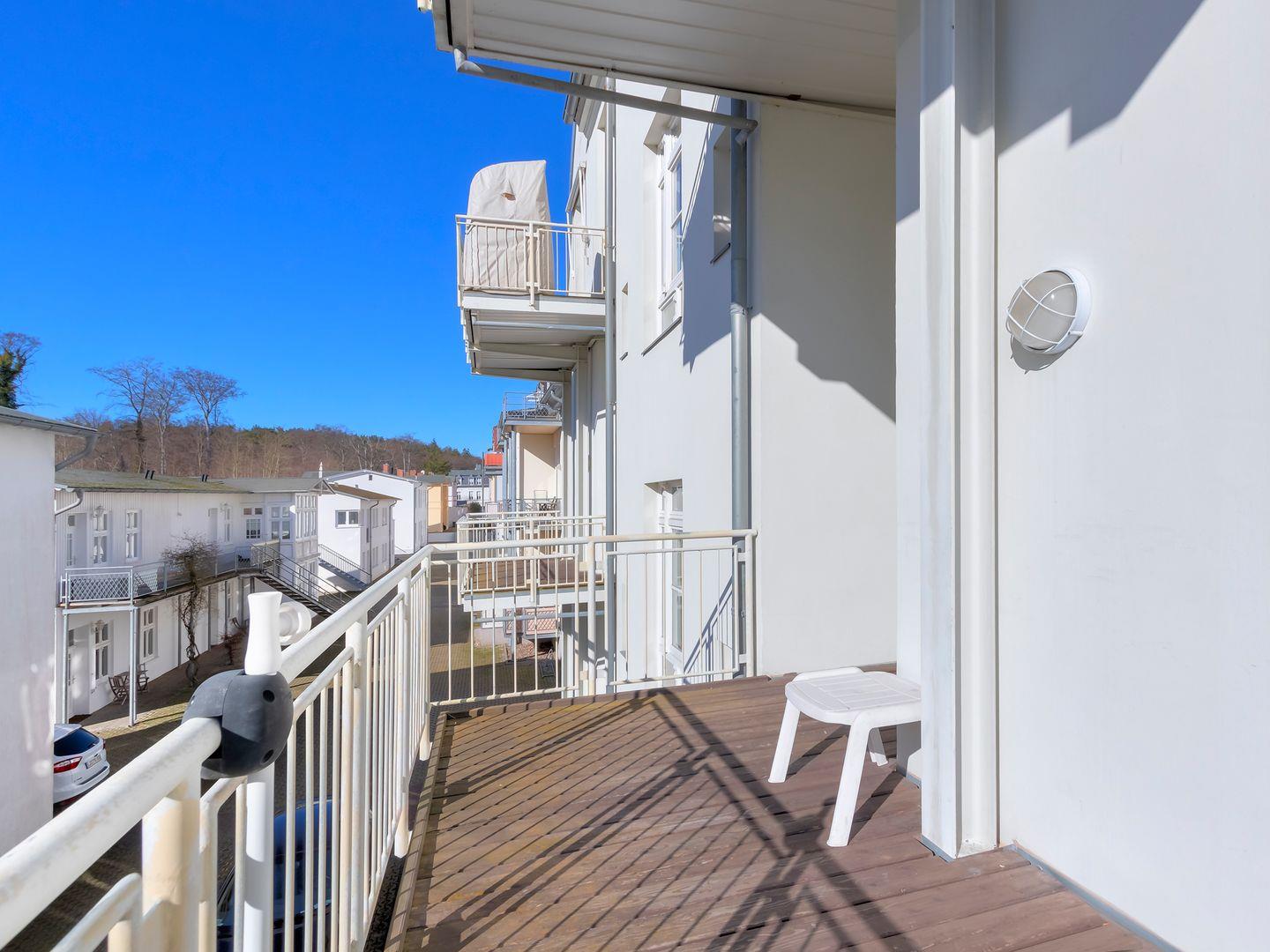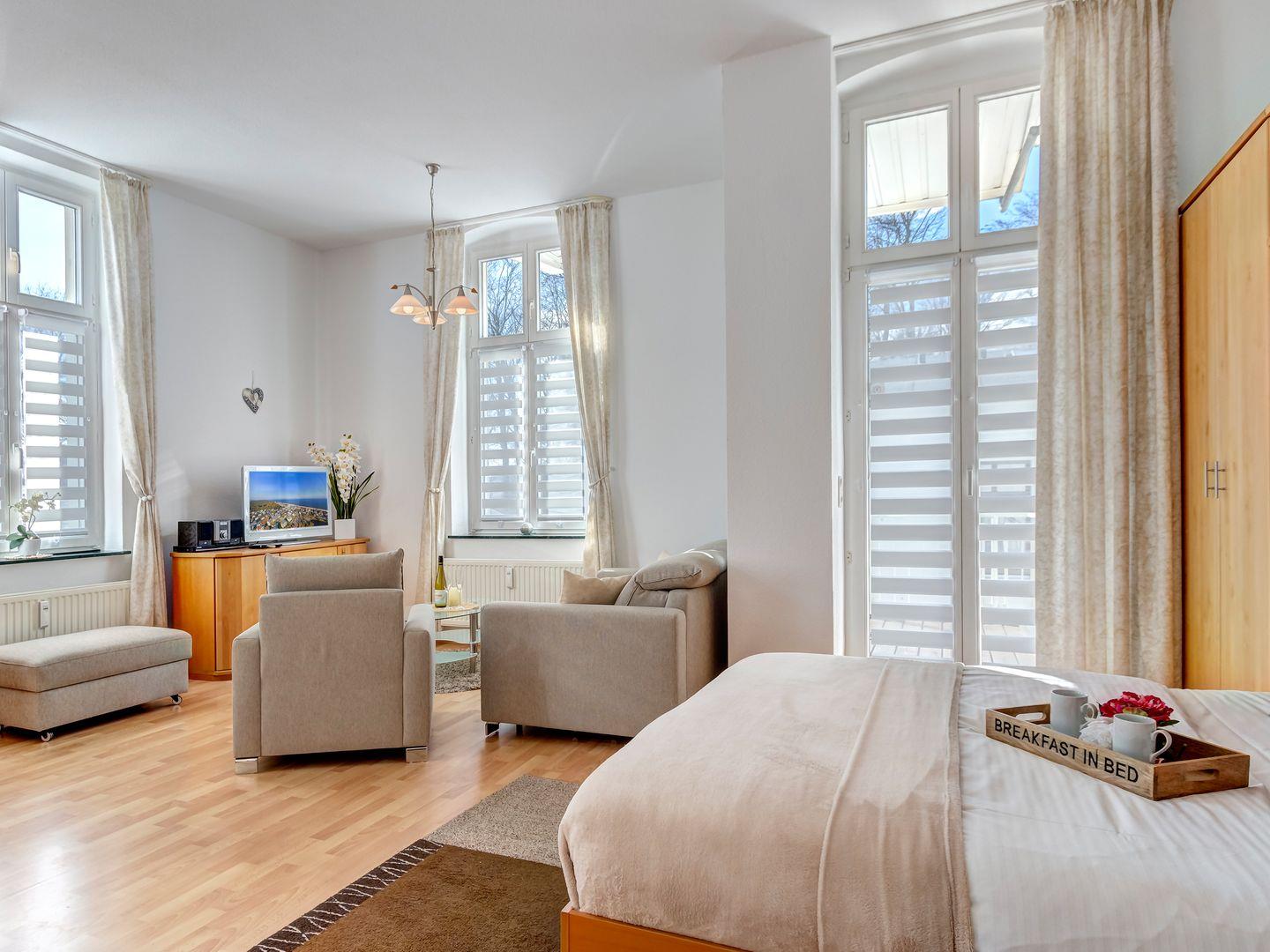 Der Wohn-Schlafbereich ist komfortabel eingerichtet und sorgt mit einem Balkon in sonniger Süd-West-Lage für entspannte Stunden in der Meeresluft.