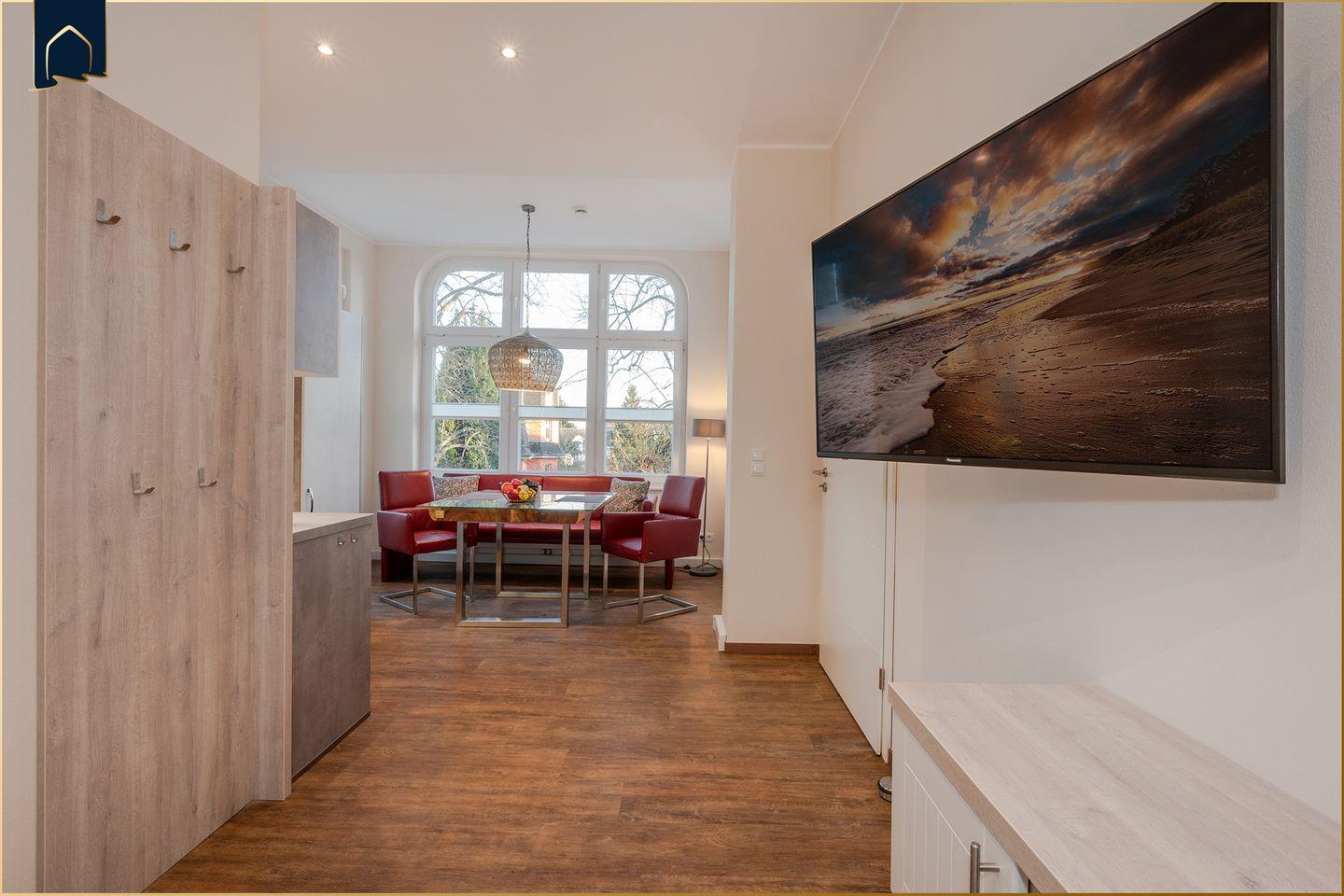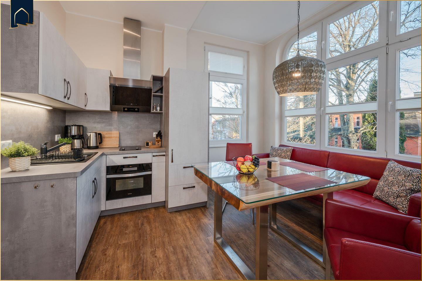 Im offenen Wohn- und Essbereich erwartet Sie eine wohnliche Atmosphäre. Der Wohnraum ist mit einem gemütlichen Sofa und zwei Fernsehern ausgestattet, sodass ein angenehmer Aufenthalt an Regentagen oder am Abend gewährleistet ist. Der Essbereich mit Esstisch ist offen in die modern ausgestattete Küche integriert. Hier finden Sie alles, was Sie für Ihren Aufenthalt benötigen: Herd, Spülmaschine, Mikrowelle, Kühlschrank mit Gefrierfach, Kaffeemaschine, Toaster, Wasserkocher sowie ausreichend Geschirr und Besteck. Auch ein Abfalleimer und ein Esstisch gehören selbstverständlich zur Ausstattung.