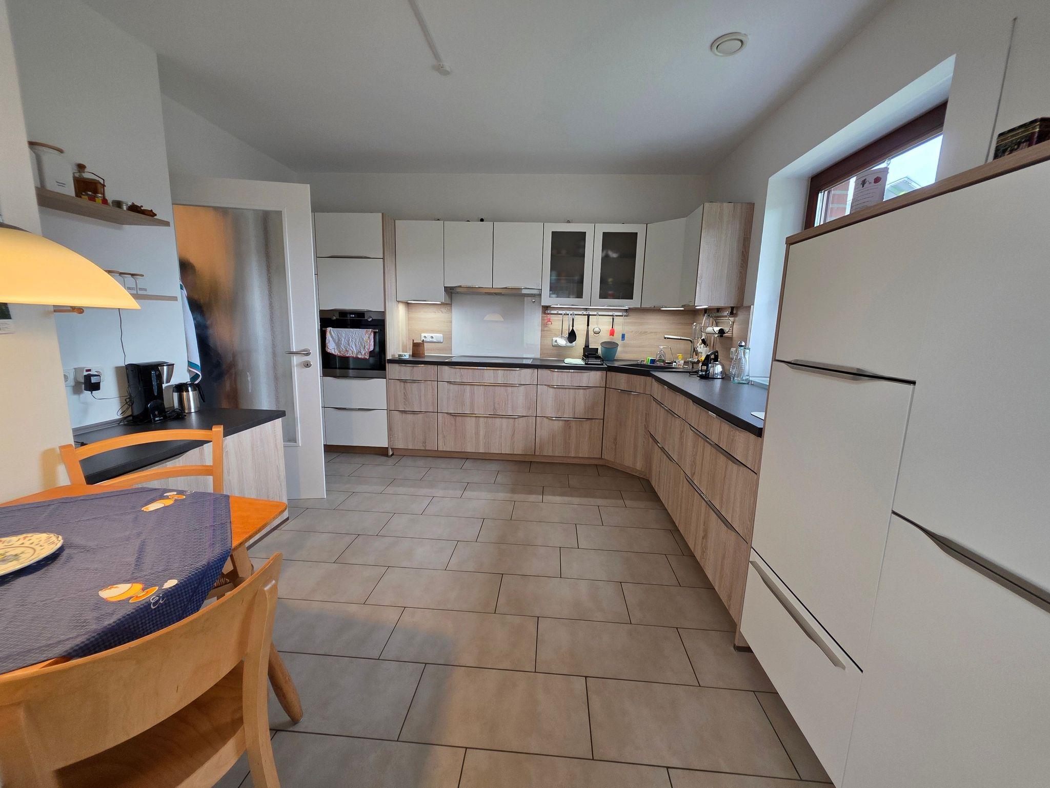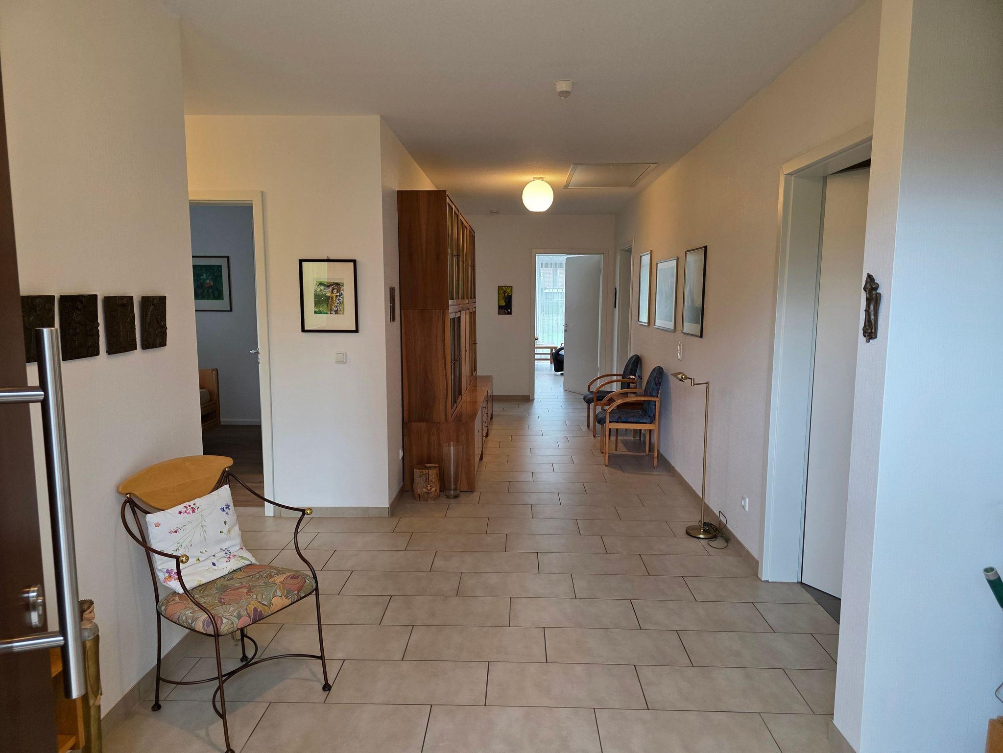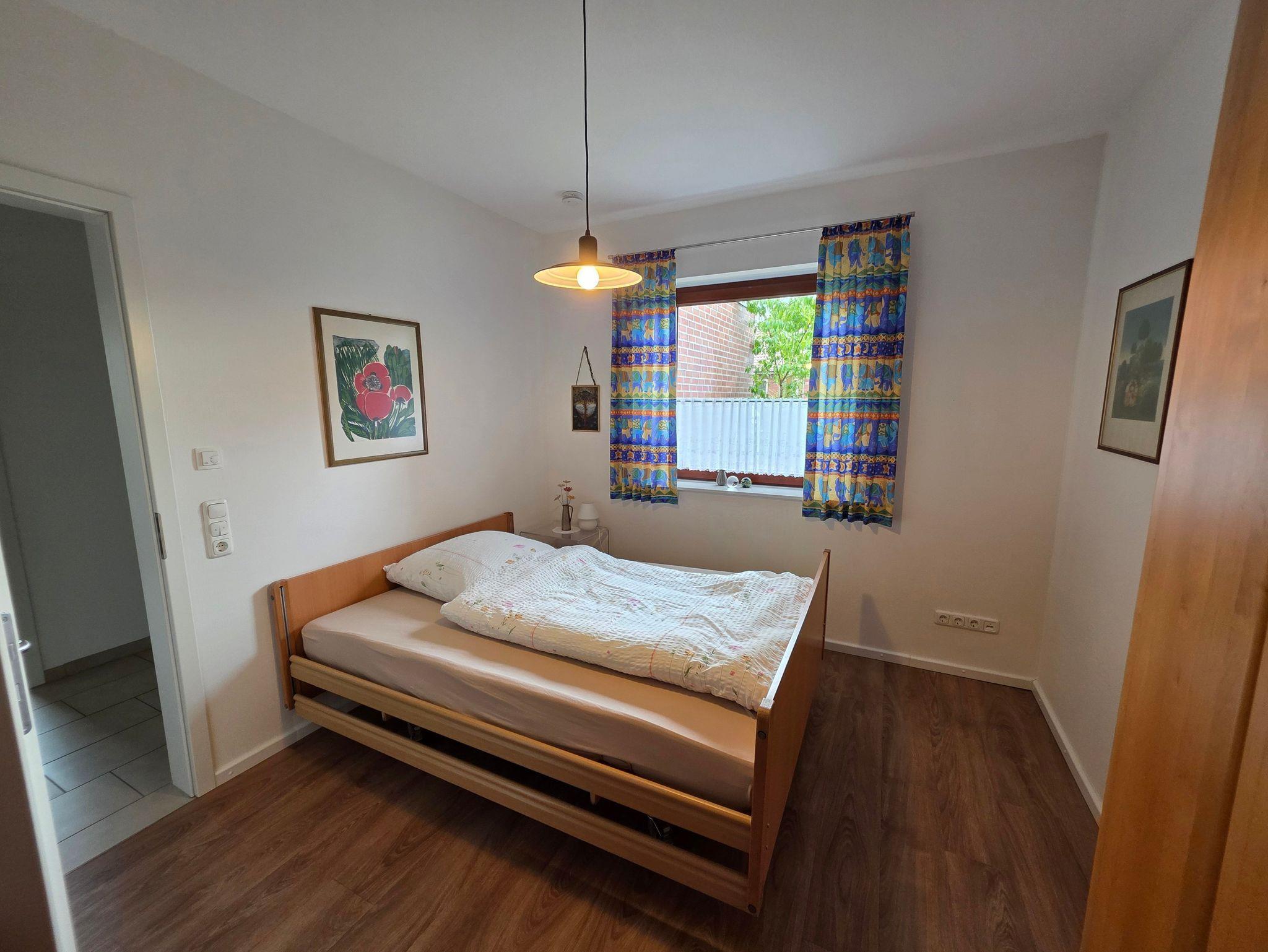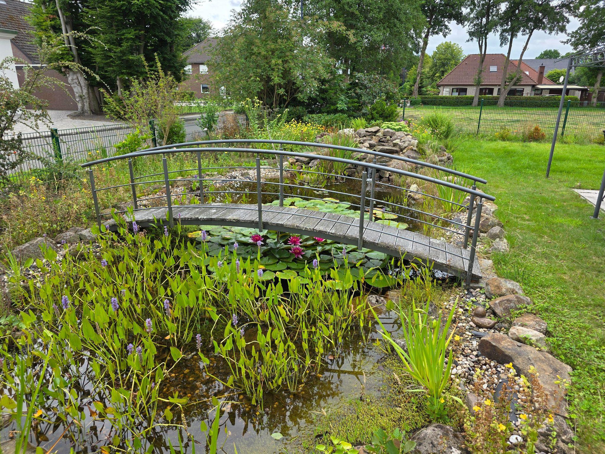 Unser barrierefreier Ferienbungalow (150 qm, Baujahr 2019) verfügt über 3 Zimmer und 2 Badezimmer sowie eine vollständig eingerichtete Küche. In Schlafzimmer 1 befindet sich ein Doppelbett (180x200 cm) und ein großzügiger Kleiderschrank. An dieses Zimmer schließt sich ein Badezimmer mit Badewanne (nach Absprache mit aufblasbarem Wannenlift), barrierefreier Dusche mit Duschhocker und unterfahrbarem Waschbecken an. Schlafzimmer 2 verfügt über ein voll funktionsfähiges Pflegebett mit den Maßen 140 x 200 cm (auch als Kinderbett geeignet), Schreibtisch und Regal. Gegenüber liegt ein weiteres Badezimmer mit ebenfalls barrierefreier Dusche. In der voll ausgestatteten Küche gibt es einen kleinen Esstisch, reichlich Geschirr und Töpfe sowie eine Grundausrüstung mit Ölen und Gewürzen. Im wunderbar lichtdurchfluteten Wohnzimmer finden sich eine Sitzecke mit Schlafcouch und eine Essecke mit ausziehbarem Tisch für bis zu acht Personen. Von hier aus können Sie auf die große Terrasse gelangen. Draußen lauschen Sie dem Plätschern des Wassers vom Bachlauf oder betrachten die Seerosen und Fische im Teich von der kleinen Brücke aus. Andere Sitzgelegenheiten im Garten laden zum Verweilen ein. Hier können Sie sich an den vielfältigen Blumen, Pflanzen und vorbeikommenden Schmetterlingen und Vögeln erfreuen. Nutzen Sie die große Rasenfläche für Spiele. Das Haus kann auf befestigten Wegen komplett umrundet werden. Es gibt einen überdachten Wäscheplatz und eine geschützte Abstellmöglichkeit für Fahrräder. Vor dem Haus besteht eine Parkmöglichkeit. Alle Türen und Eingänge sind stufenlos, die Zimmertüren haben eine Breite von 100 cm. Das Haus hat in allen Räumen eine Fußbodenheizung, der Belag sind entweder Fliesen oder Laminat.