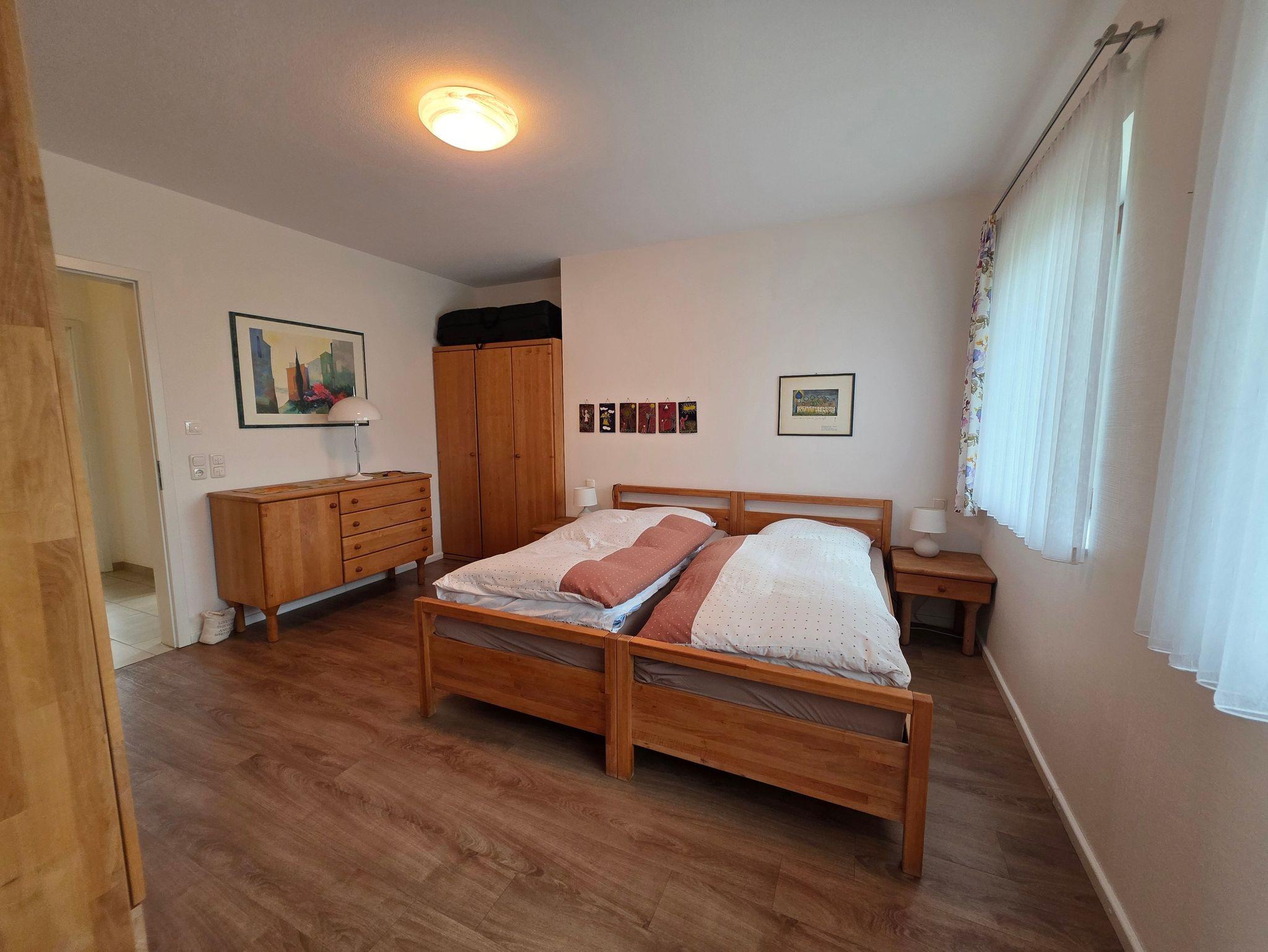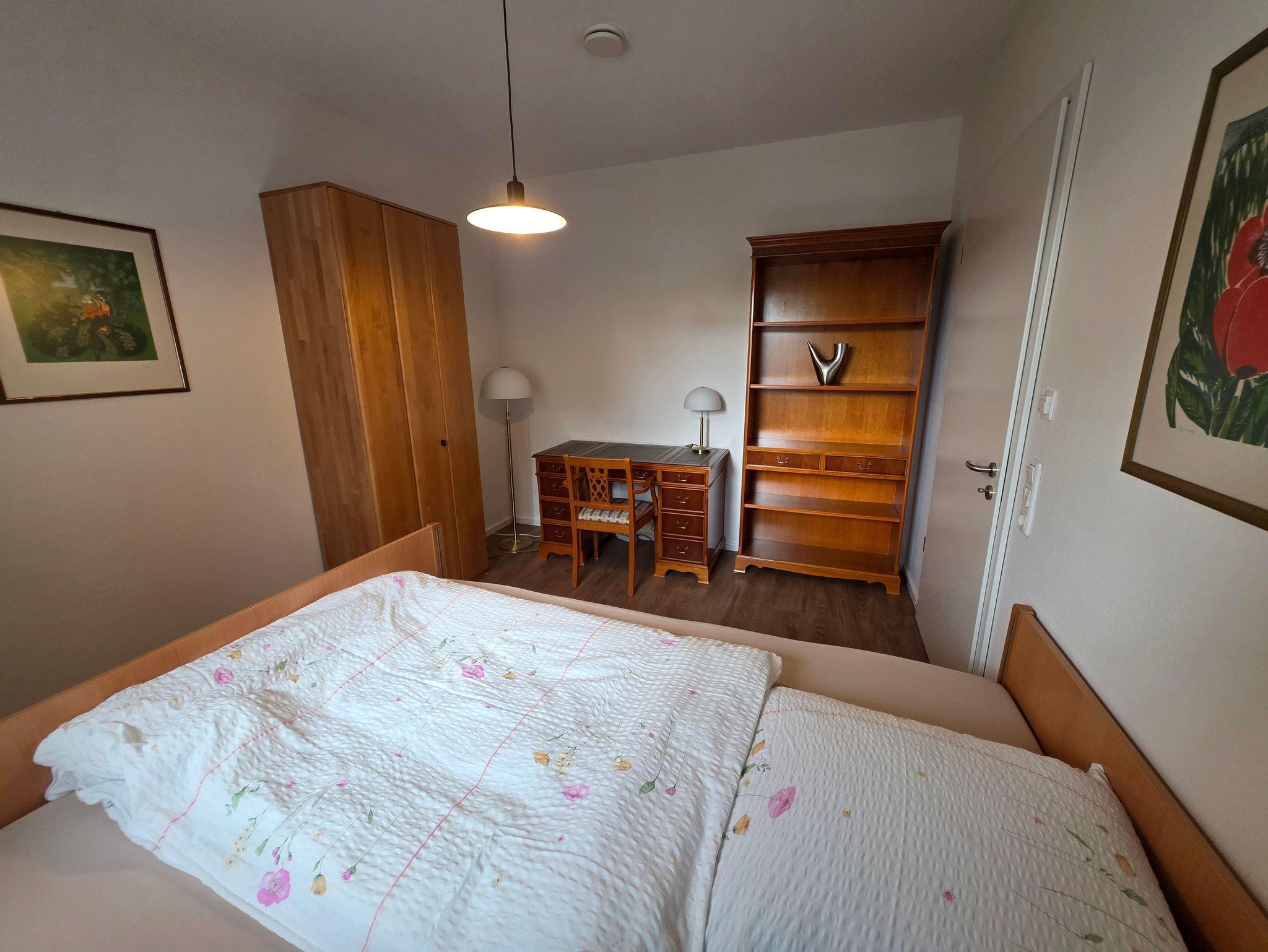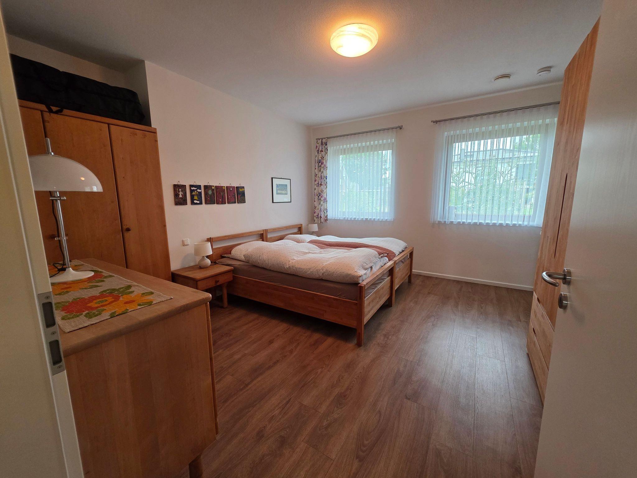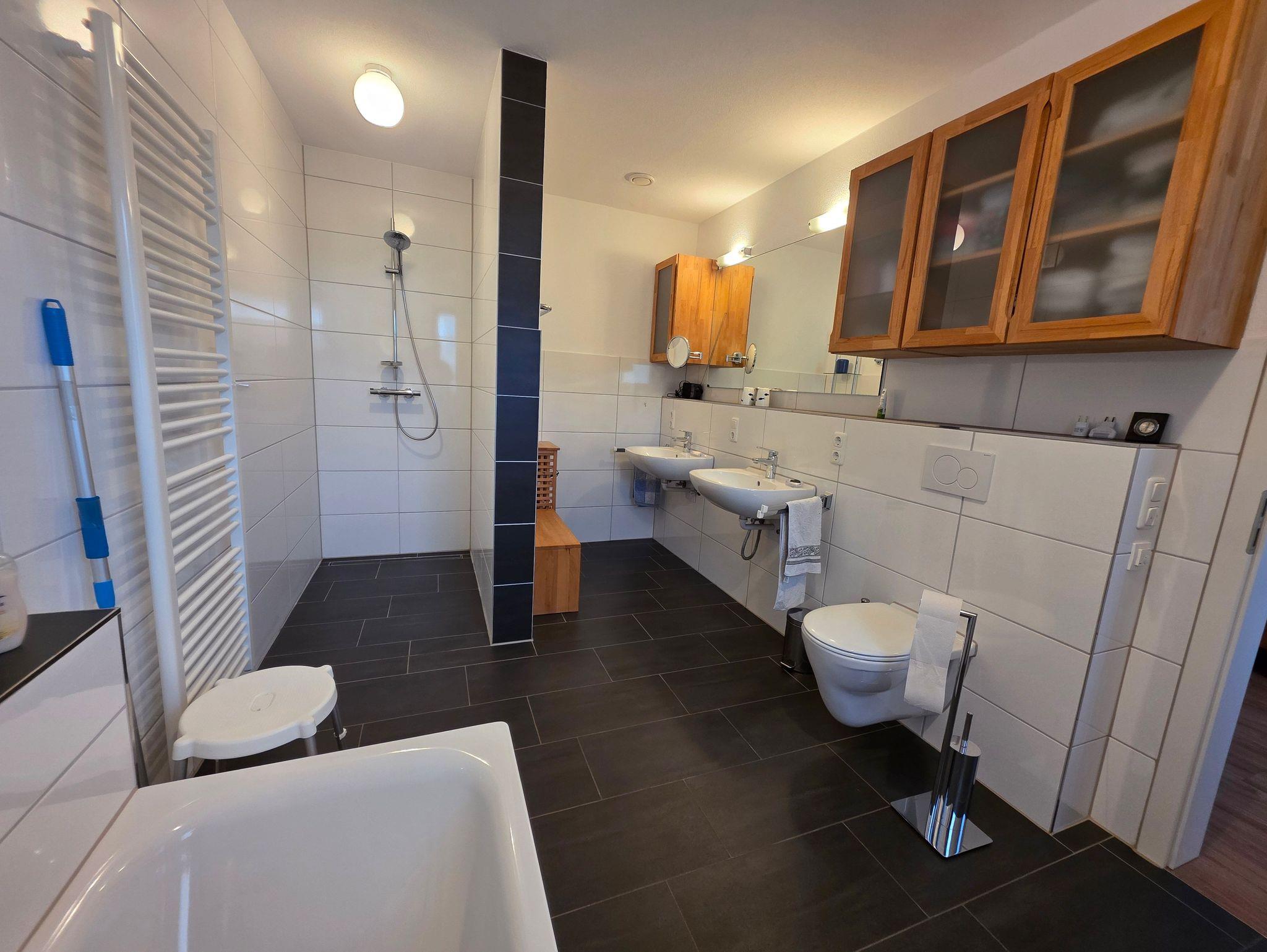 Unser barrierefreier Ferienbungalow (150 qm, Baujahr 2019) verfügt über 3 Zimmer und 2 Badezimmer sowie eine vollständig eingerichtete Küche. In Schlafzimmer 1 befindet sich ein Doppelbett (180x200 cm) und ein großzügiger Kleiderschrank. An dieses Zimmer schließt sich ein Badezimmer mit Badewanne (nach Absprache mit aufblasbarem Wannenlift), barrierefreier Dusche mit Duschhocker und unterfahrbarem Waschbecken an. Schlafzimmer 2 verfügt über ein voll funktionsfähiges Pflegebett mit den Maßen 140 x 200 cm (auch als Kinderbett geeignet), Schreibtisch und Regal. Gegenüber liegt ein weiteres Badezimmer mit ebenfalls barrierefreier Dusche. In der voll ausgestatteten Küche gibt es einen kleinen Esstisch, reichlich Geschirr und Töpfe sowie eine Grundausrüstung mit Ölen und Gewürzen. Im wunderbar lichtdurchfluteten Wohnzimmer finden sich eine Sitzecke mit Schlafcouch und eine Essecke mit ausziehbarem Tisch für bis zu acht Personen. Von hier aus können Sie auf die große Terrasse gelangen. Draußen lauschen Sie dem Plätschern des Wassers vom Bachlauf oder betrachten die Seerosen und Fische im Teich von der kleinen Brücke aus. Andere Sitzgelegenheiten im Garten laden zum Verweilen ein. Hier können Sie sich an den vielfältigen Blumen, Pflanzen und vorbeikommenden Schmetterlingen und Vögeln erfreuen. Nutzen Sie die große Rasenfläche für Spiele. Das Haus kann auf befestigten Wegen komplett umrundet werden. Es gibt einen überdachten Wäscheplatz und eine geschützte Abstellmöglichkeit für Fahrräder. Vor dem Haus besteht eine Parkmöglichkeit. Alle Türen und Eingänge sind stufenlos, die Zimmertüren haben eine Breite von 100 cm. Das Haus hat in allen Räumen eine Fußbodenheizung, der Belag sind entweder Fliesen oder Laminat.