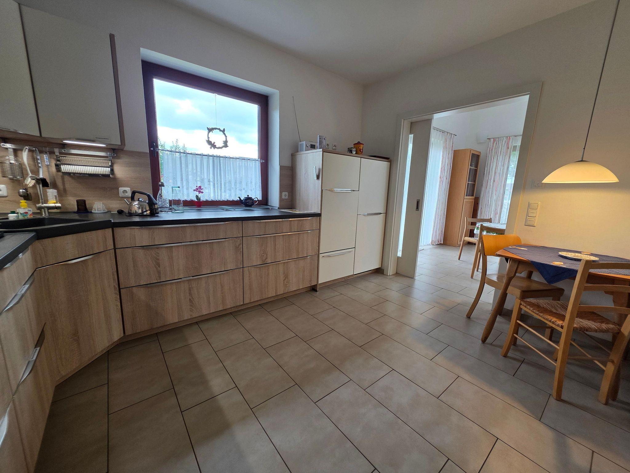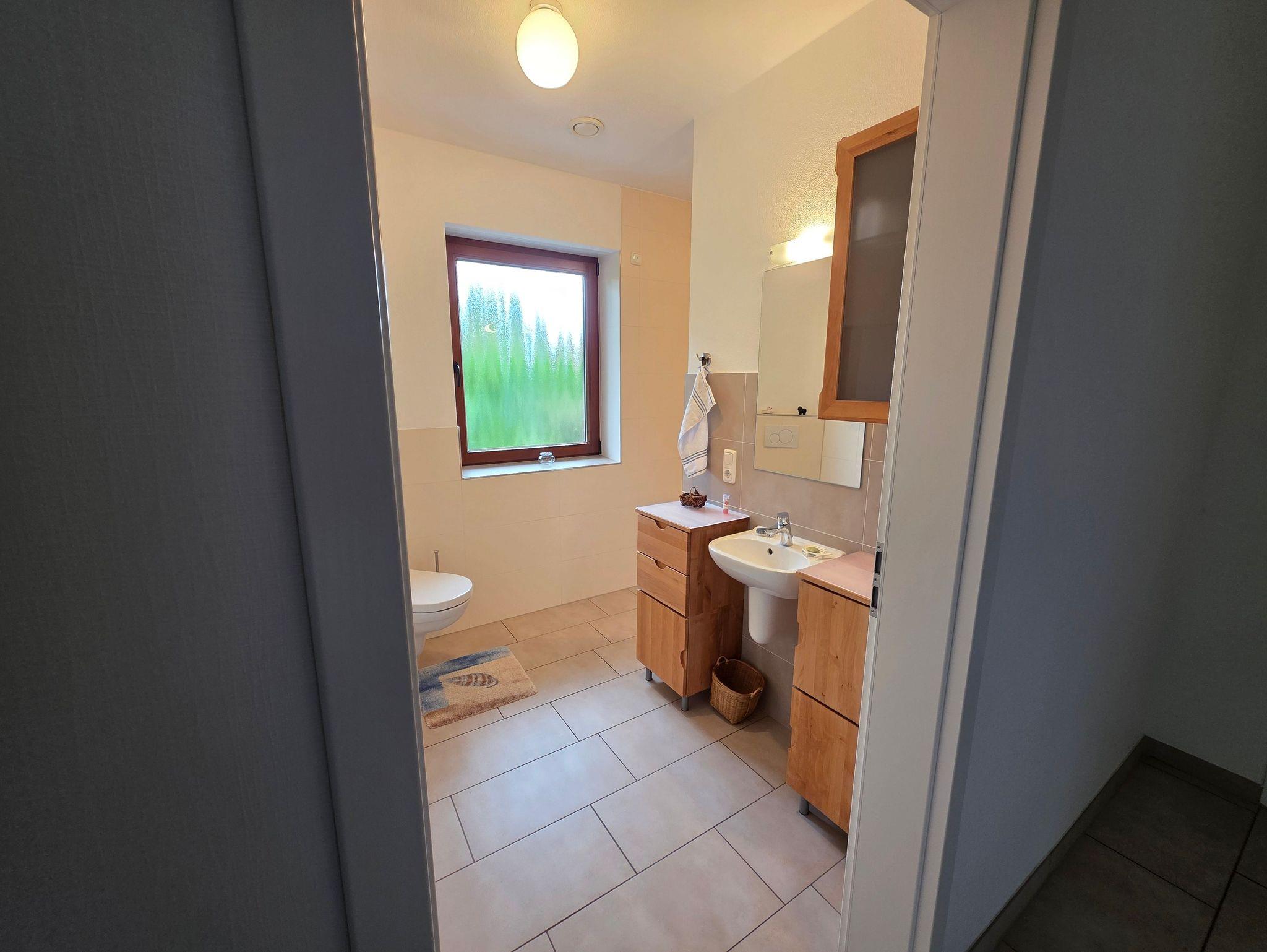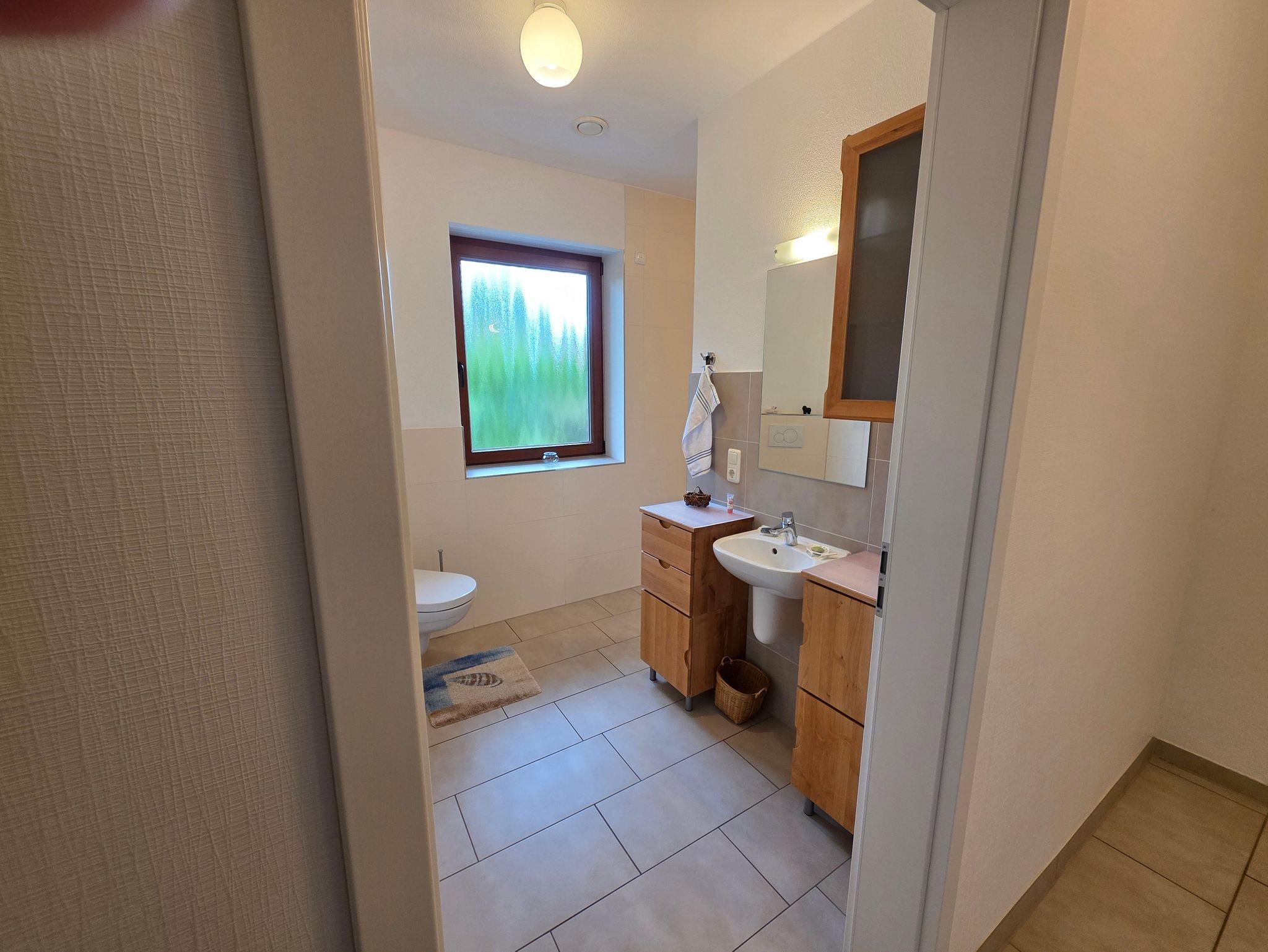 Unser barrierefreier Ferienbungalow (150 qm, Baujahr 2019) verfügt über 3 Zimmer und 2 Badezimmer sowie eine vollständig eingerichtete Küche. In Schlafzimmer 1 befindet sich ein Doppelbett (180x200 cm) und ein großzügiger Kleiderschrank. An dieses Zimmer schließt sich ein Badezimmer mit Badewanne (nach Absprache mit aufblasbarem Wannenlift), barrierefreier Dusche mit Duschhocker und unterfahrbarem Waschbecken an. Schlafzimmer 2 verfügt über ein voll funktionsfähiges Pflegebett mit den Maßen 140 x 200 cm (auch als Kinderbett geeignet), Schreibtisch und Regal.Gegenüber liegt ein weiteres Badezimmer mit ebenfalls barrierefreier Dusche. In der voll ausgestatteten Küche gibt es einen kleinen Esstisch, reichlich Geschirr und Töpfe sowie eine Grundausrüstung mit Ölen und Gewürzen. Im wunderbar lichtdurchfluteten Wohnzimmer findet sich eine Sitzecke mit Schlafcouch und eine Essecke mit ausziehbarem Tisch für bis zu acht Personen. Von hier aus können Sie auf die große Terrasse gelangen. Draußen lauschen Sie dem Plätschern des Wassers vom Bachlauf oder betrachten die Seerosen und Fische im Teich von der kleinen Brücke aus. Andere Sitzgelegenheiten im Garten laden zum Verweilen ein. Hier können Sie sich an den vielfältigen Blumen, Pflanzen und vorbeikommenden Schmetterlingen und Vögeln erfreuen. Nutzen Sie die große Rasenfläche für Spiele. Das Haus kann auf befestigten Wegen komplett umrundet werden. Es gibt einen überdachten Wäscheplatz und eine geschützte Abstellmöglichkeit für Fahrräder. Vor dem Haus besteht eine Parkmöglichkeit. Alle Türen und Eingänge sind stufenlos, die Zimmertüren haben eine Breite von 100 cm. Das Haus hat in allen Räumen eine Fußbodenheizung, der Belag sind entweder Fliesen oder Laminat.
