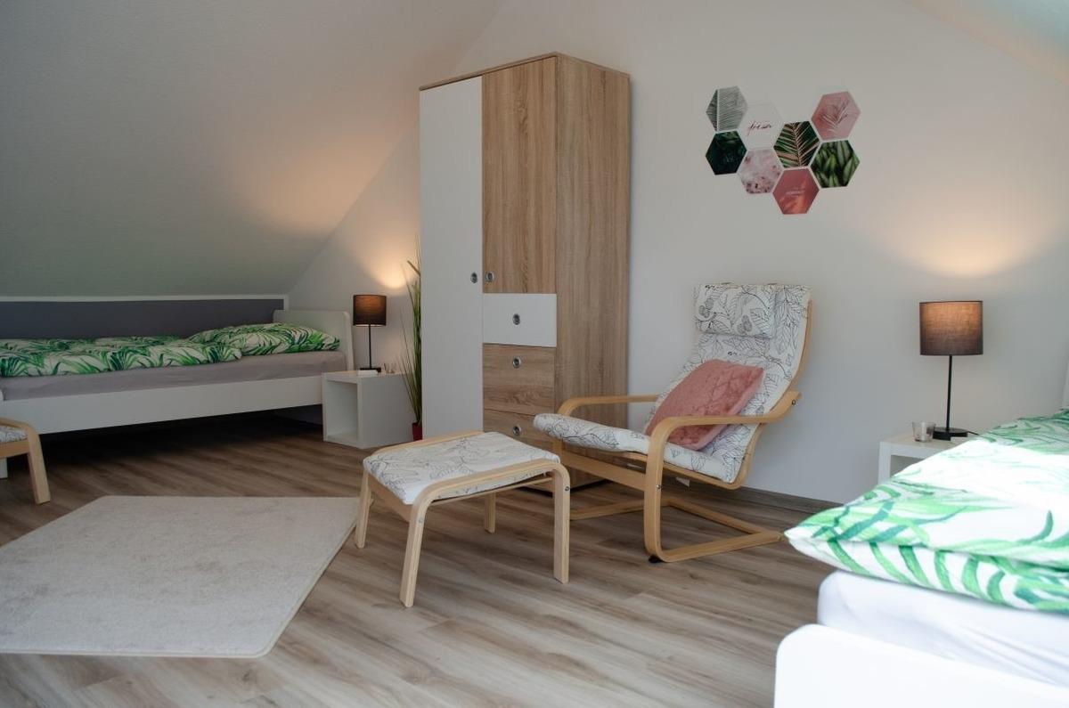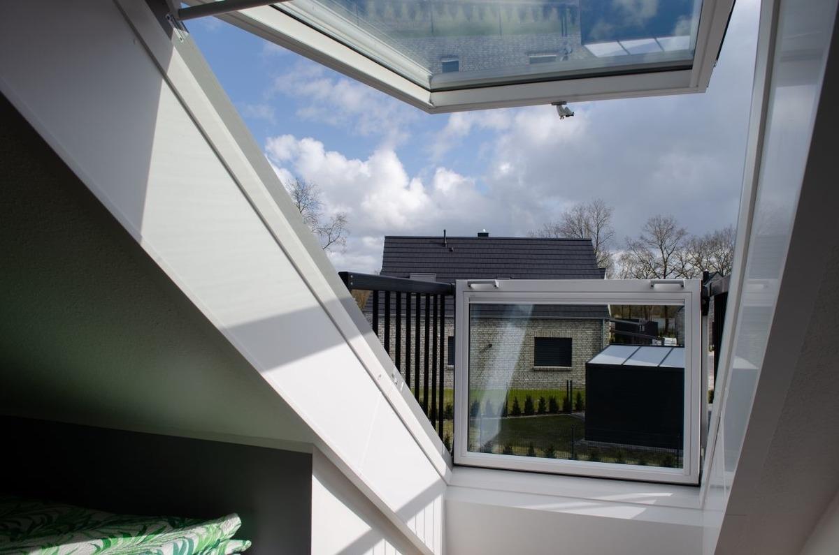 Weiter finden Sie im Obergeschoss ein helles, großzügiges weiteres Schlafzimmer mit zwei Einzelbetten (0,9 x 2 m) vor, welches die Jüngsten der Familie zum ausgiebigen Spielen einlädt. Durch das VELUX CABRIO™-Dachfenster entsteht im Handumdrehen ein balkonähnlicher Dachaustritt und bietet somit einen wunderschönen Blick über die Dächer der benachbarten Häuser in Richtung Badesee. Auch finden Sie hier einen Smart-TV vor. Bei Bedarf kann noch eine weitere Schlafmöglichkeit durch ein hochwertiges Gästeklappbett (90 x 200 cm) hergerichtet werden.