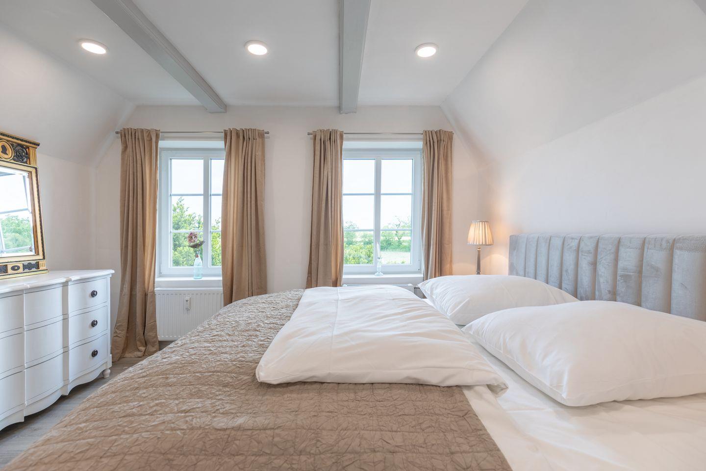 Das offene Wohnzimmer lädt mit einem Flachbild-TV zum Verweilen ein. Die Wohnung verfügt über insgesamt drei Schlafzimmer, wovon zwei mit einem bequemen Boxspring-Bett ausgestattet sind, eines mit einem ausziehbaren Kojenbett (160 x 200) . Das gemütliche Schlafzimmer im Obergeschoss ist in einer Art Galerie (Spitzboden) und Sie erreichen es über eine Holztreppe. Allen Schlafräume sind mit Fenster-Verdunkelungen ausgestattet.