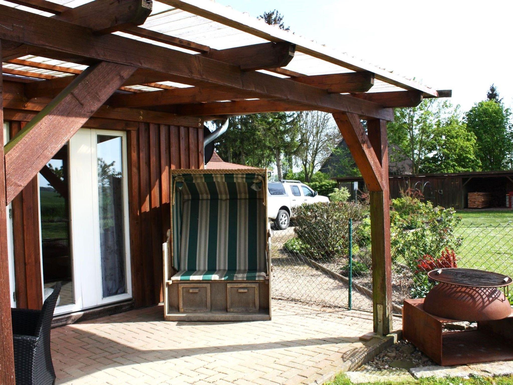 Vor dem Ferienhaus befindet sich eine überdachte Sonnenterrasse mit Gartenmöbeln und Strandkorb, eine seperate Wiese und ein Grill. Der kostenfreie Autostellplatz ist direkt auf dem Grundstück.