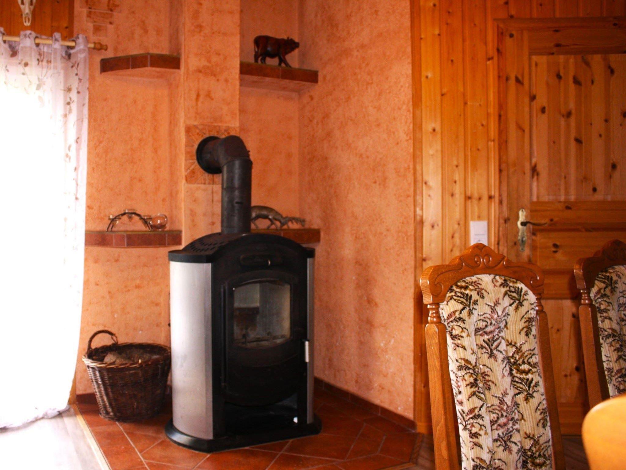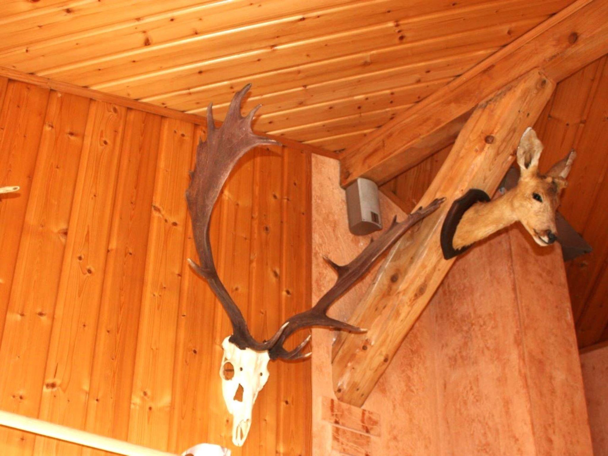 Es erwartet Sie ein im Jagdstil eingerichteter Wohnraum mit Kamin , offener Küche und Essbereich.