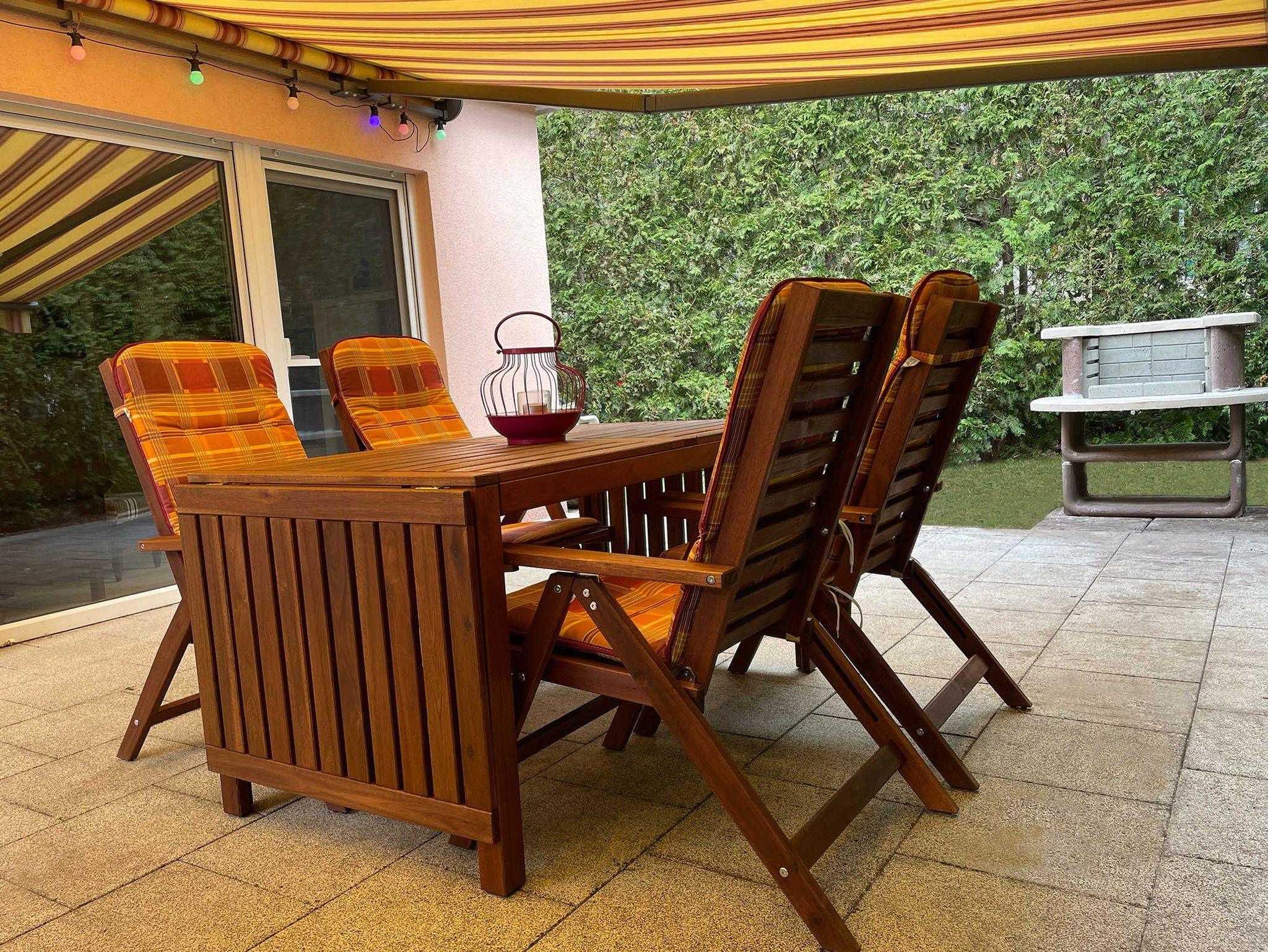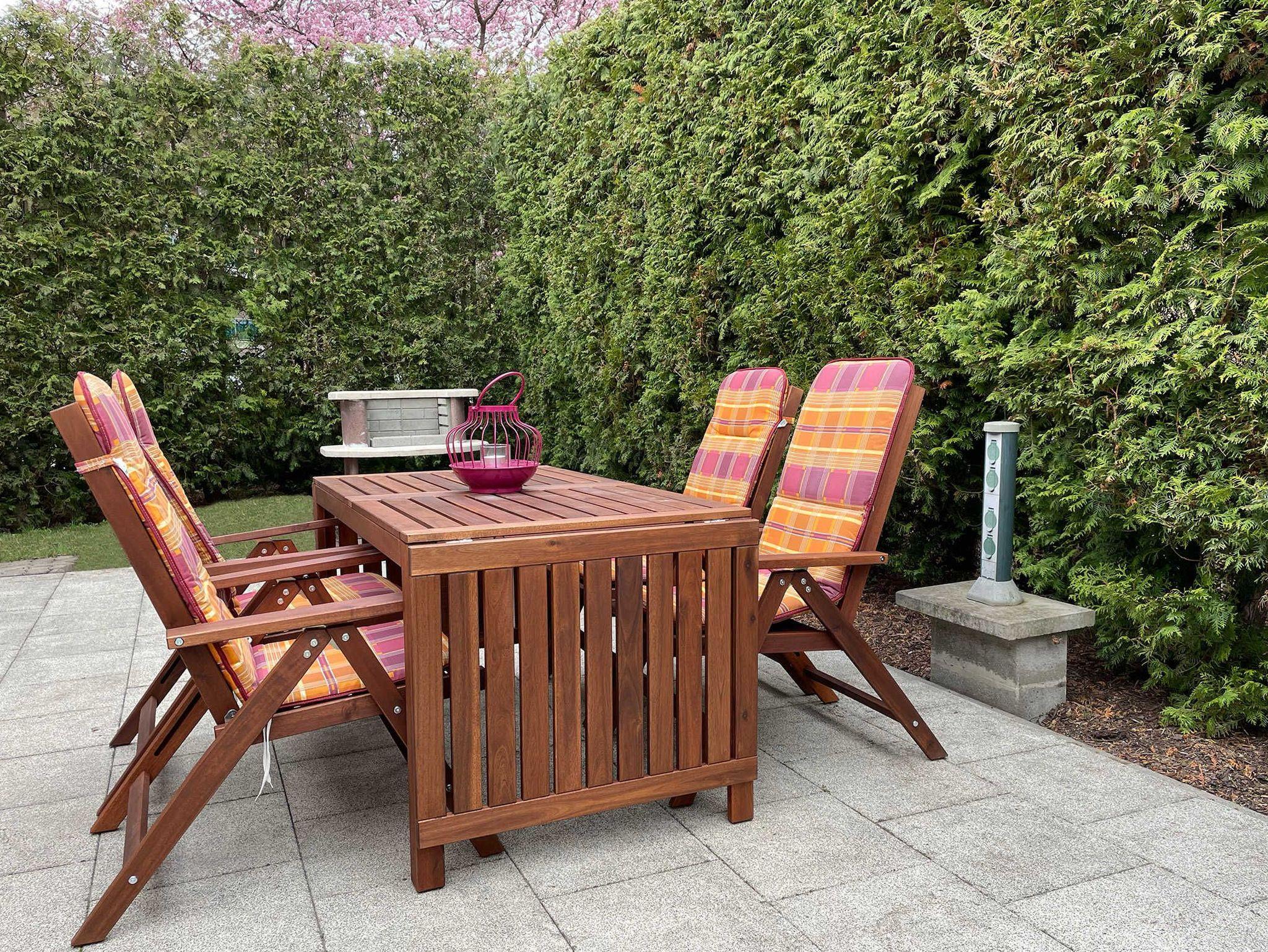 Smart-TV/Radio/Satellit, Kaffeemaschine, Toaster, Elektro-Herd mit Backofen, Mikrowelle, Kühl-Gefrierkombination, Staubsauger, Waschmaschine, Haartrockner, Bügeleisen, Bügelbrett, optional 1 Kinderhochstuhl, Gartenmöbel, Grill.