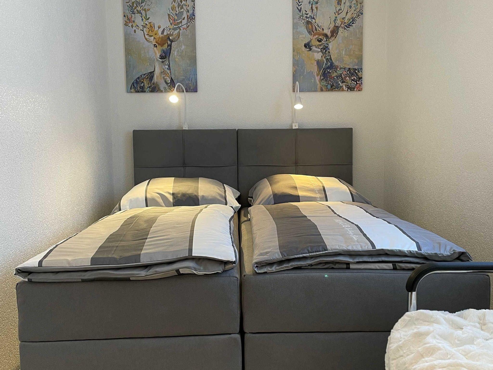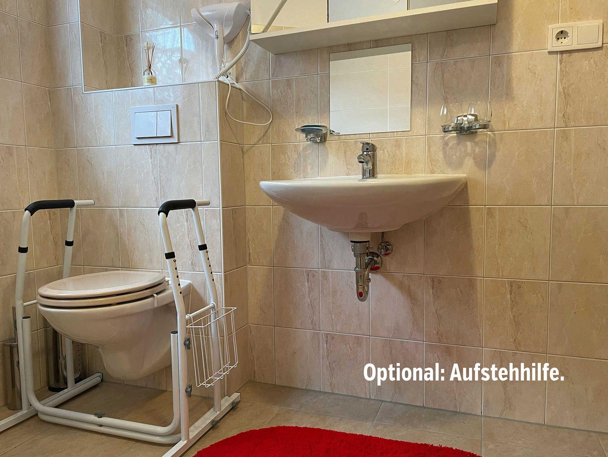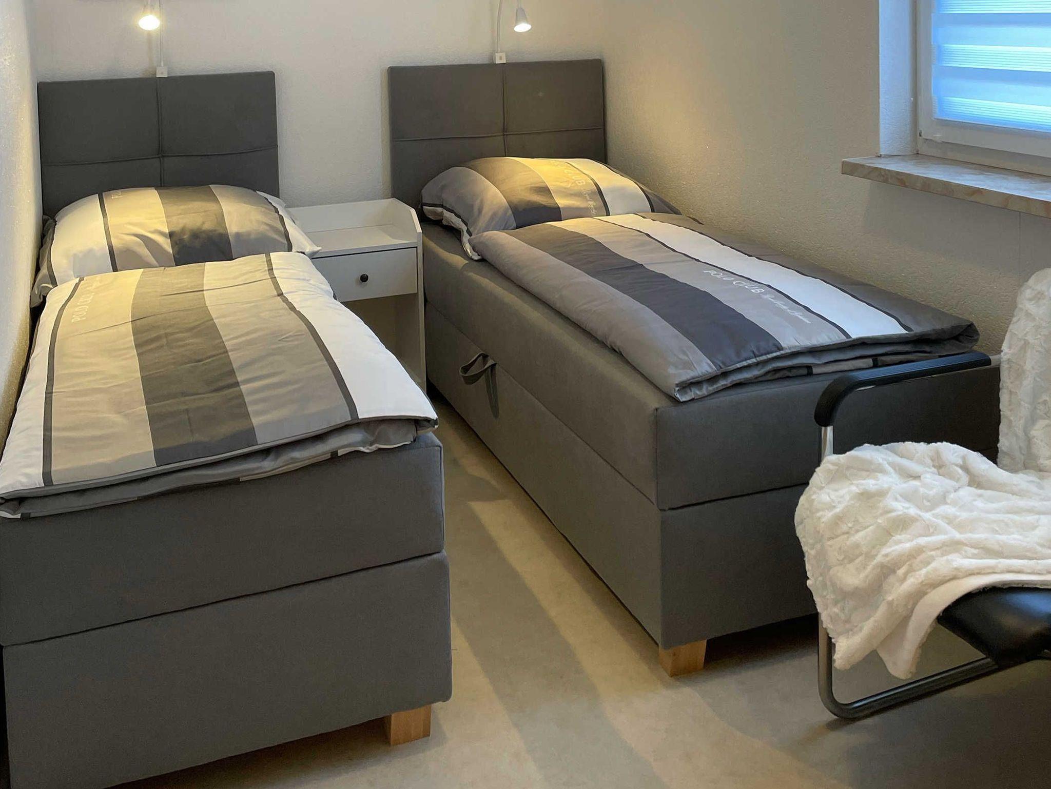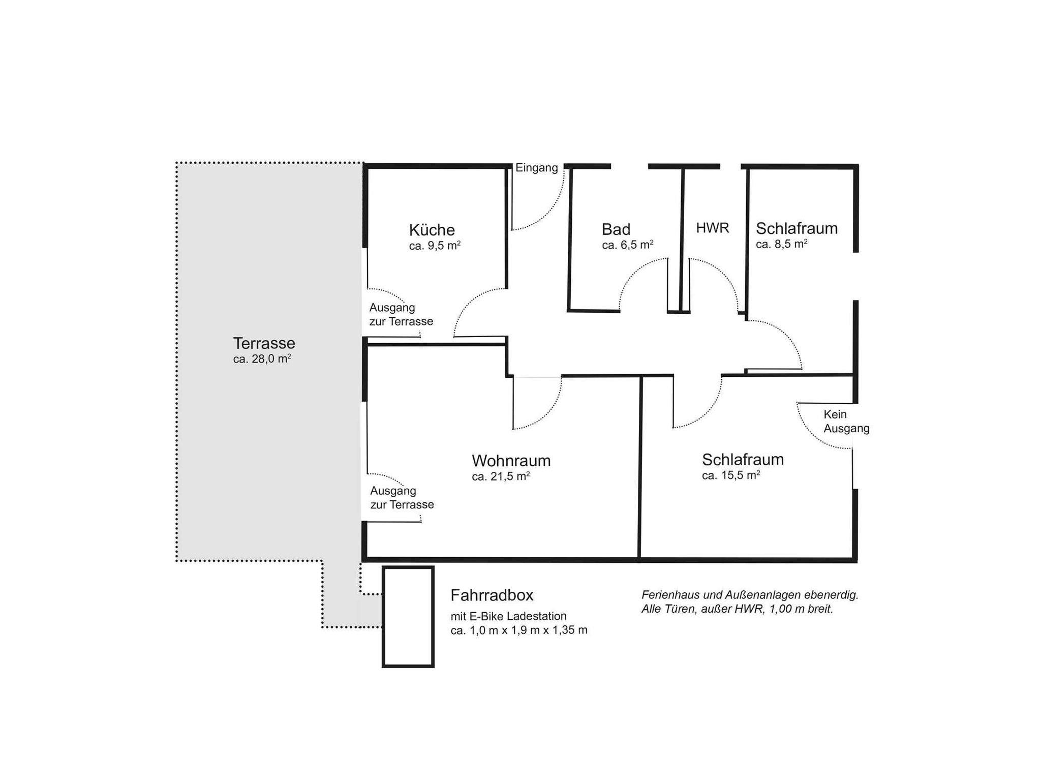 1 Wohn-/Esszimmer, 1 separate Küche, 2 Schlafzimmer 1 Doppelbett 180×190 cm, 1 Doppelbett 150×200 cm ? auch als Einzelbetten nutzbar, alle Betten bequem mit Topper, optional 1 Babybett (65×120 cm), 1 Badezimmer/Dusche/WC, optional mit Aufstehhilfe, 1 Terrasse mit Grill, Stellplatz für 2 PKW oder ein Wohnmobil ? die maximale Höhe beträgt 3,50 Meter und die Breite 2,60 Meter, 1 abschließbare Fahrradgarage für zwei Fahrräder mit Steckdose zum Aufladen von E-Bikes.