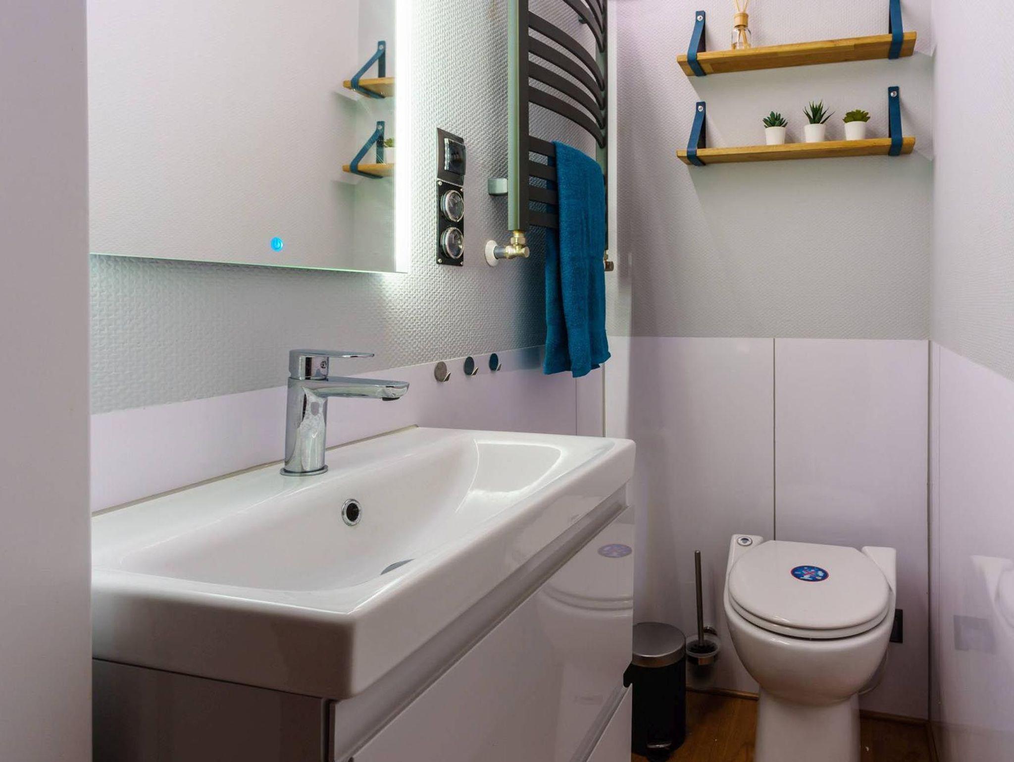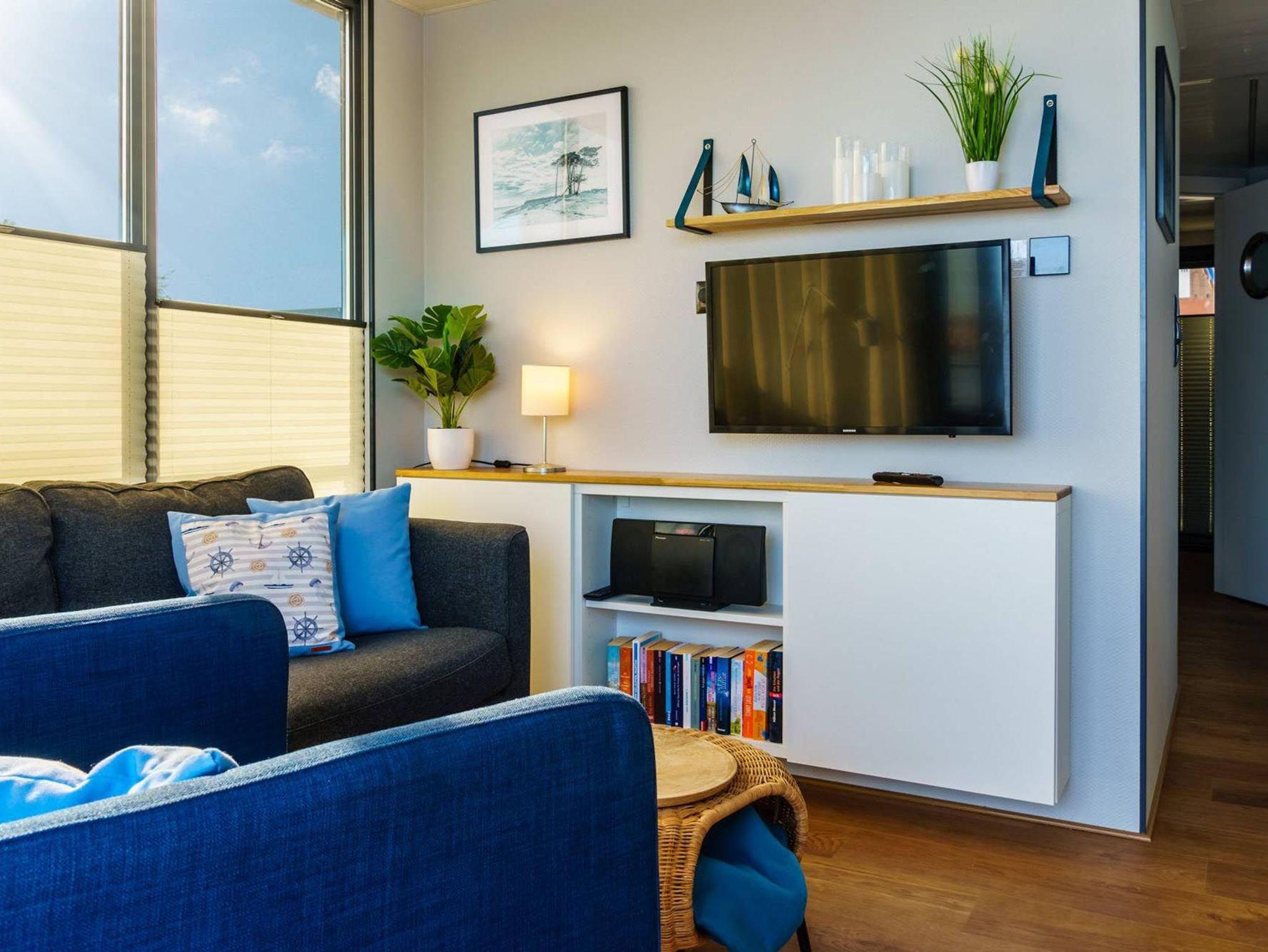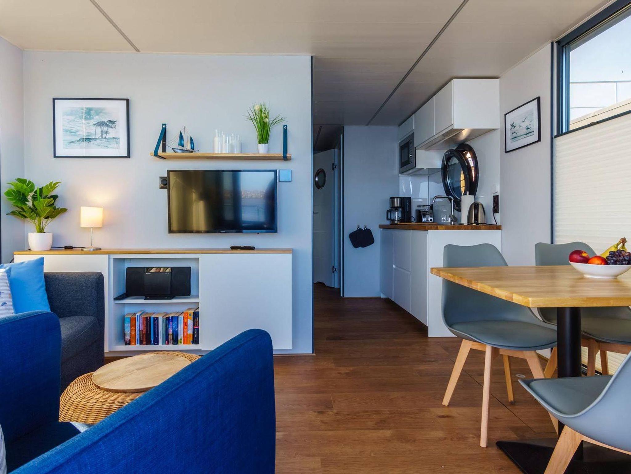 Im Inneren des Hausbootes finden Sie neben dem Wohnraum mit Fußbodenheizung für kalte Tage zwei Schlafräume mit je einem Doppelbett sowie ein modernes Duschbad. Genügend Stauraum finden Sie in den Schränken sowie in den Schubladen unter den Betten.