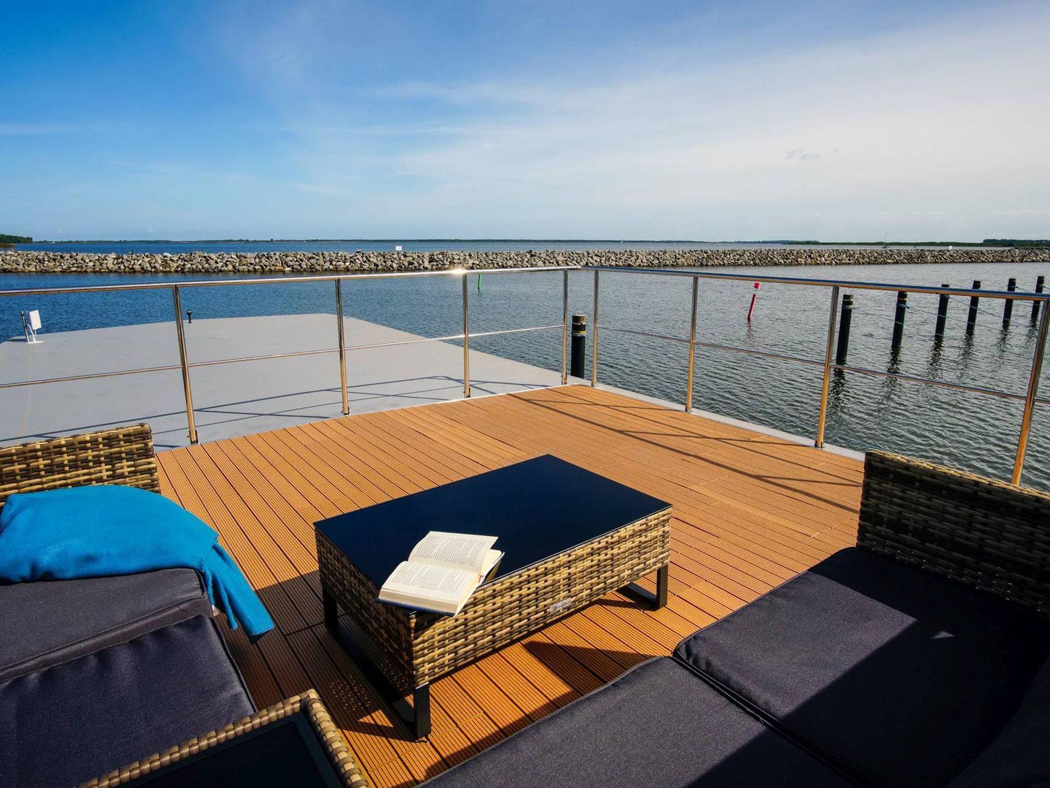 An warmen Tagen laden sowohl die zwei Sonnenterrassen vor und hinter dem Wohnaufbau als auch die Dachterrasse zum Entspannen und Sonnenbaden ein. Auf dieser haben Sie einen atemberaubenden Blick über den Barther Bodden bis zur vorgelagerten Halbinsel Fischland ? Darß - Zingst und können wunderbare Sonnenuntergänge genießen.