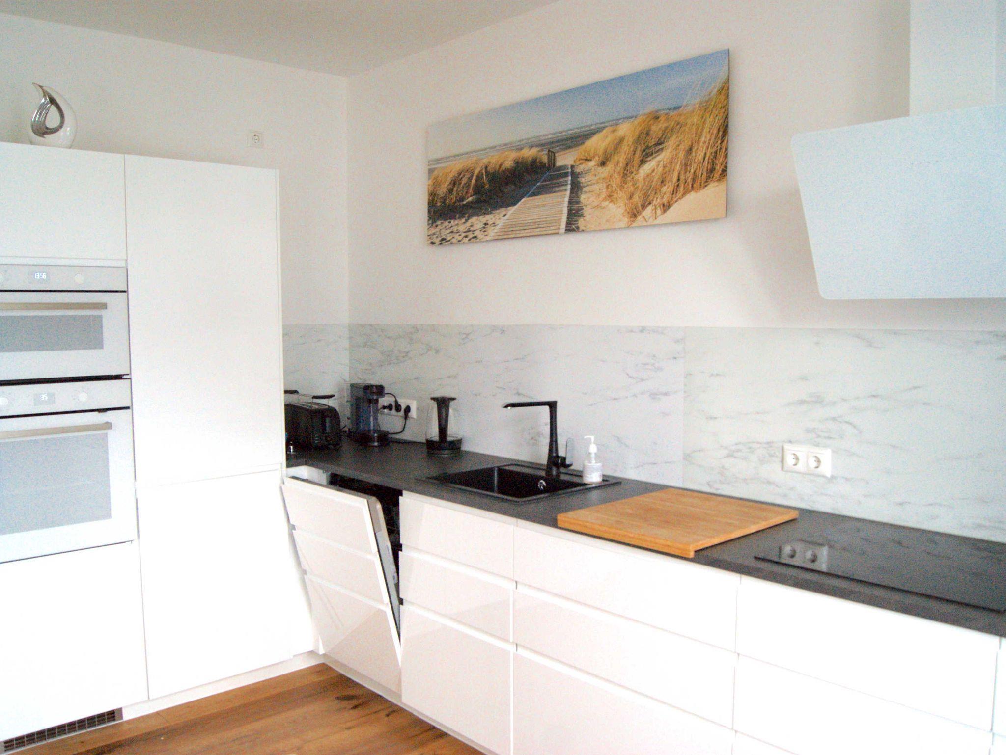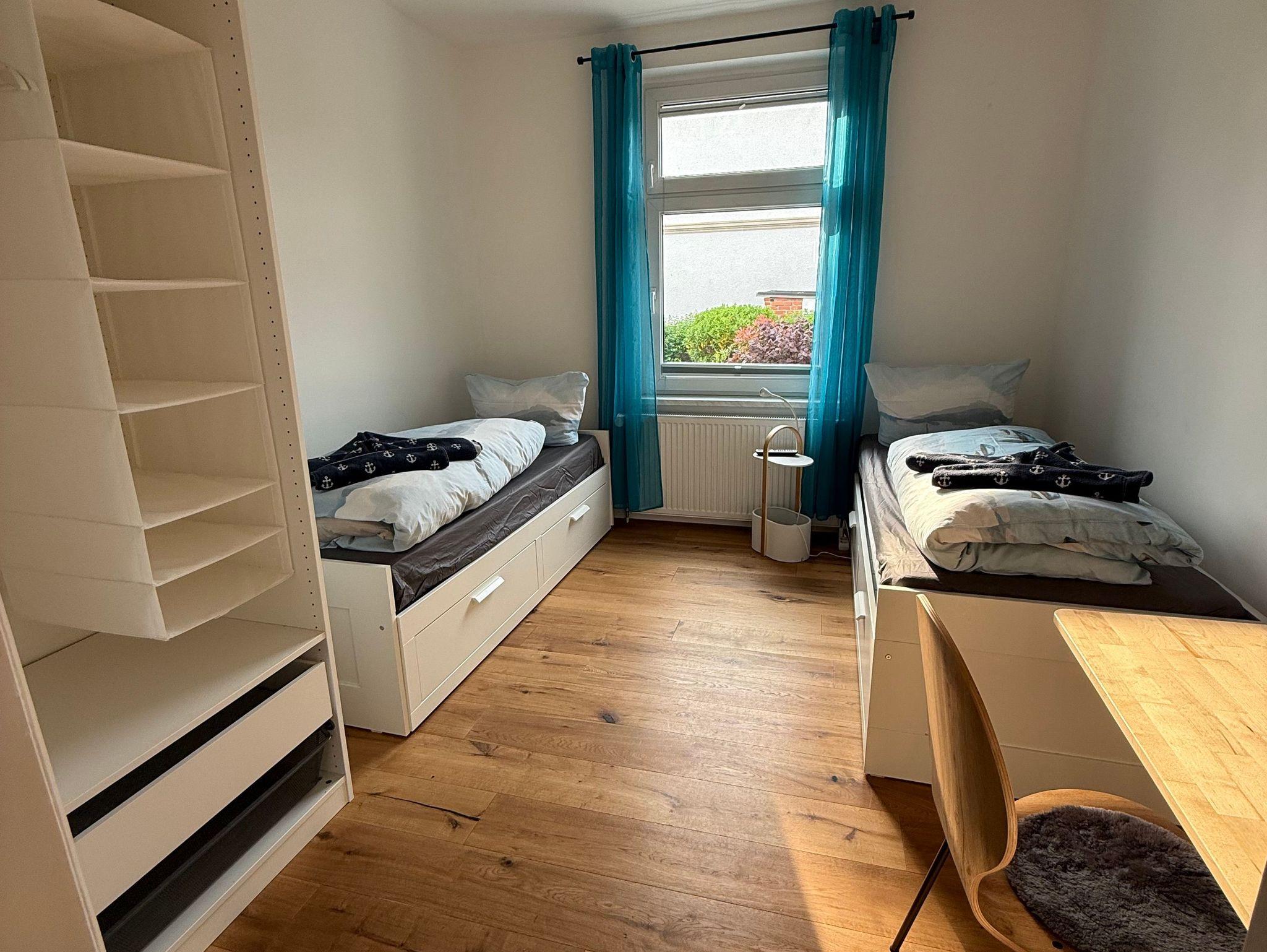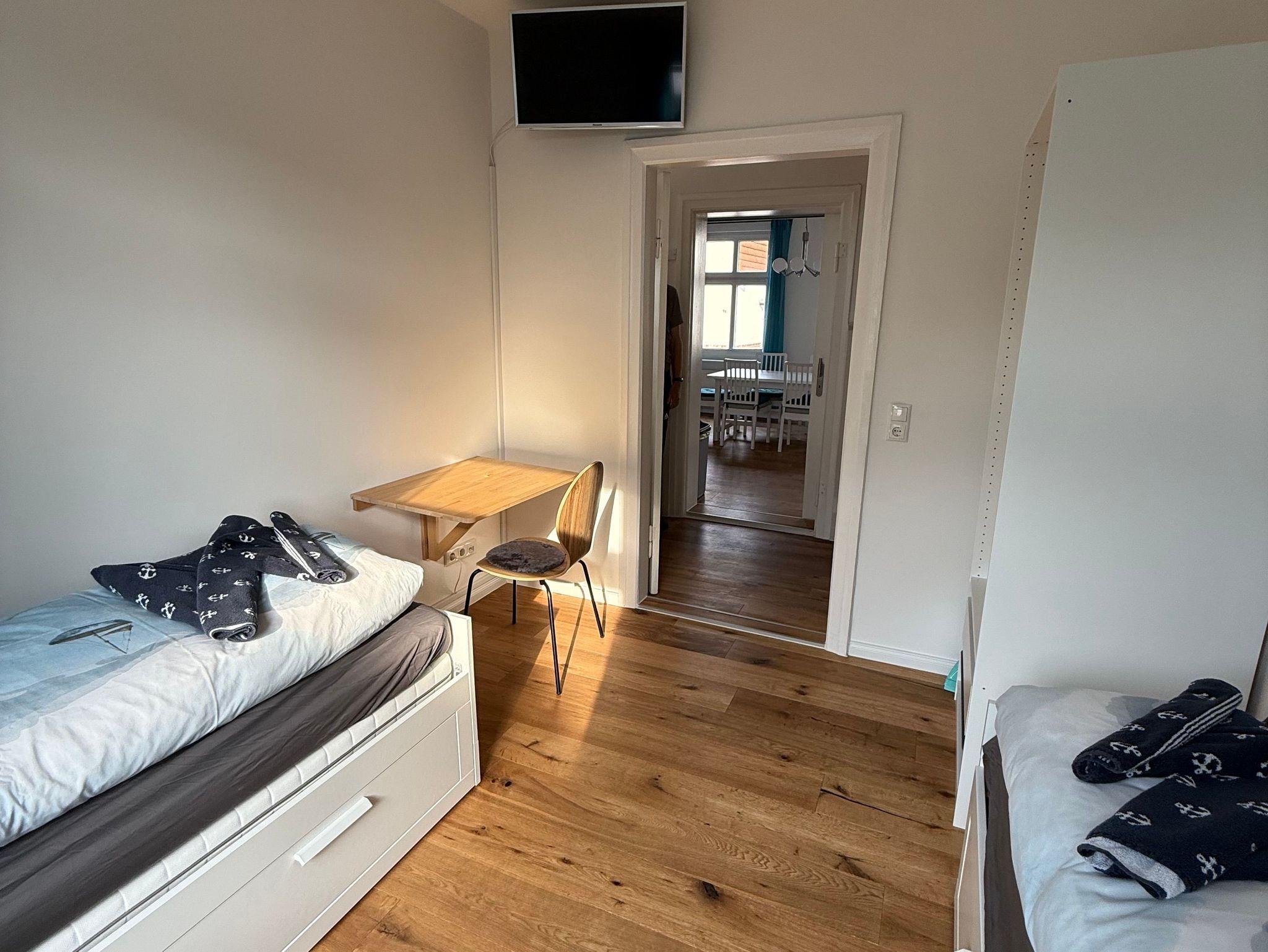 Gesellschaftsspiele, Krimis und Romane liegen bereit. Im Hauptschlafzimmer befindet sich ein 1,80 x 2,00 m großes Boxspringbett und ein begehbarer Kleiderschrank, sowie ein Bügelbrett und Bügeleisen. Im zweiten Schlafzimmer befindet sich ein 0,90 x 2,00 m Bett, welches optional zu einem 1,80 x 2,00 m Doppelbett ausziehbar ist, sowie ein Kleiderschrank und ein kleiner Schreibtisch mit Stuhl. Alternativ kann das dort vorhandene Schlafsofa als zweites Bett genutzt werden. Im Wohnzimmer befindet sich neben dem großen L-förmigen Sofa, auch ein Ohrensessel mit Beinhocker. Das Tageslichtbad ist ausgestattet mit einer 0,86 x 1,30 m großen Dusche mit niedriger Einstiegshöhe und Handtuchheizkörper. Außerdem befindet sich dort auch ein WC, sowie ein großer Waschtisch mit Spiegel und Föhn. Die einzelnen Räume sind über den zentralen Wohnungsflur erreichbar. Die gesamte Wohnung ist (außer Bad) mit einem hellen Parkettboden ausgestattet und eine Nichtraucherwohnung. Die Wohnräume sind nach Westen ausgerichtet und verfügen über sehr viel Tageslicht.