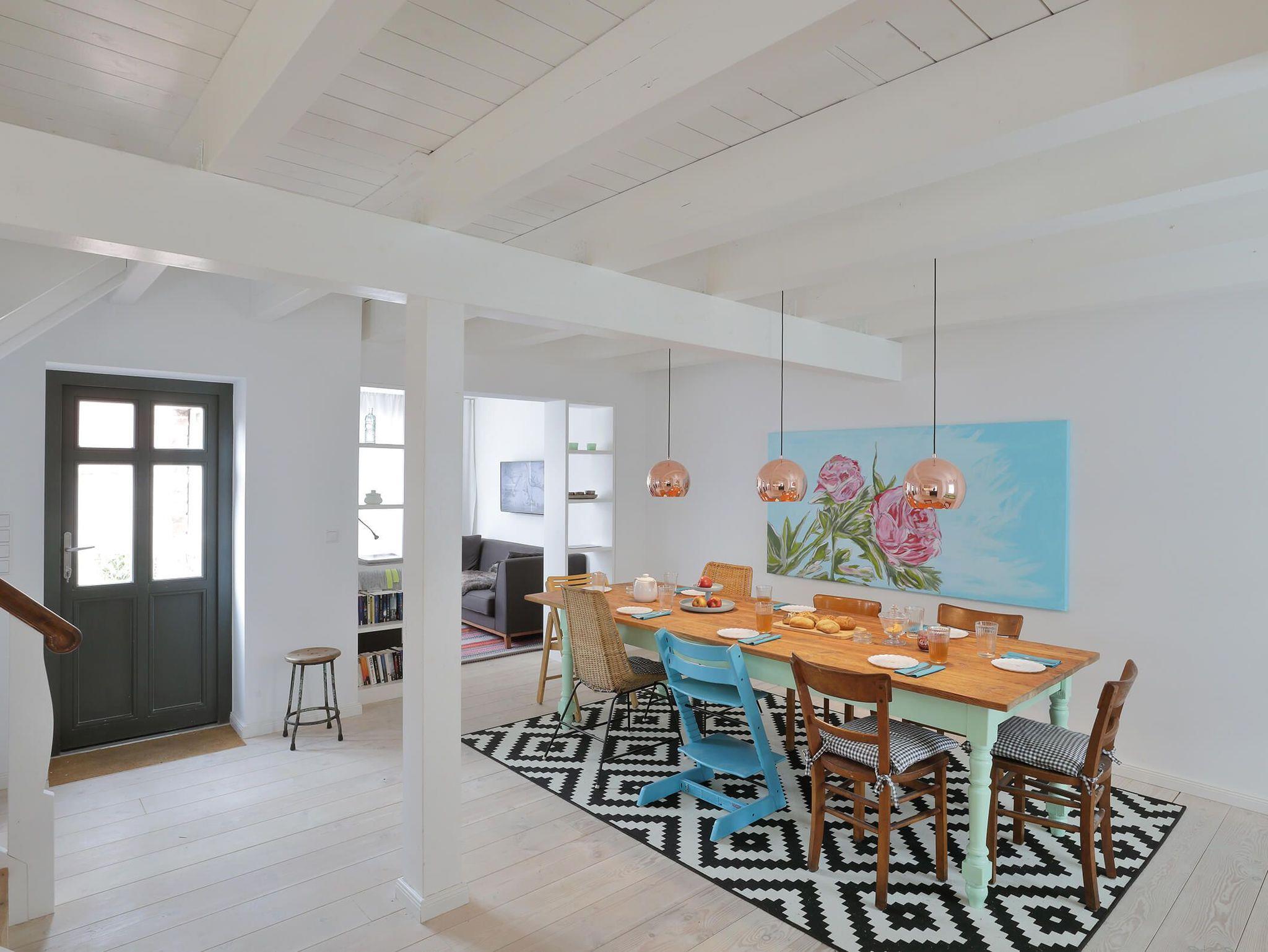 Die offene Wohnküche ist ein Ort, an dem kreative Köpfe an einer großen Tafel zusammenkommen können. Der Kamin sorgt für gemütliche Abende und eine besondere Atmosphäre im Durchgangszimmer, das ebenfalls als Schlafzimmer genutzt werden kann.