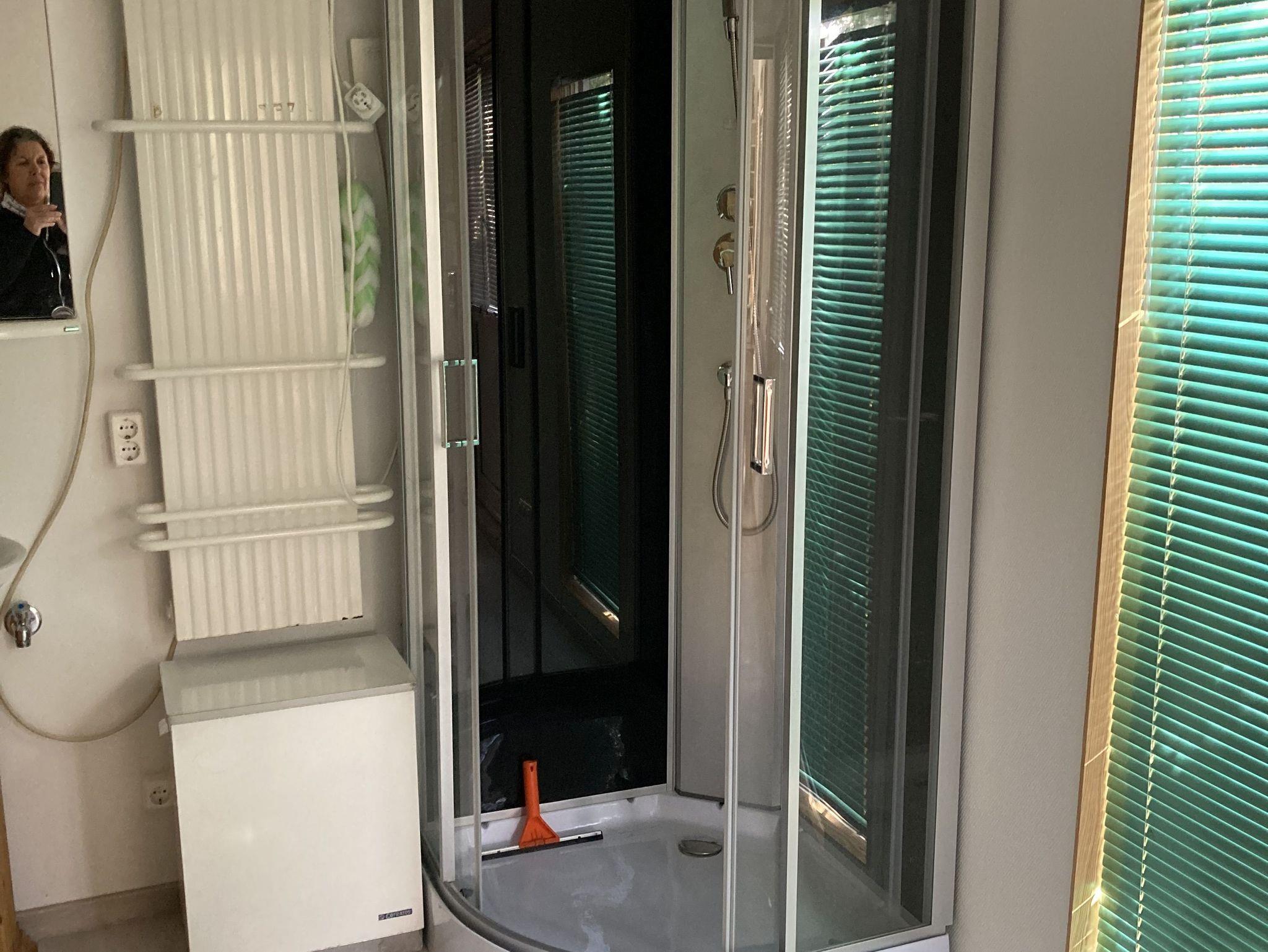 ebenerdig, hat jedoch eine kleine Schwelle (ca. 10 cm). Die Dusche hat eine Einstiegshöhe von etwa 18 cm.