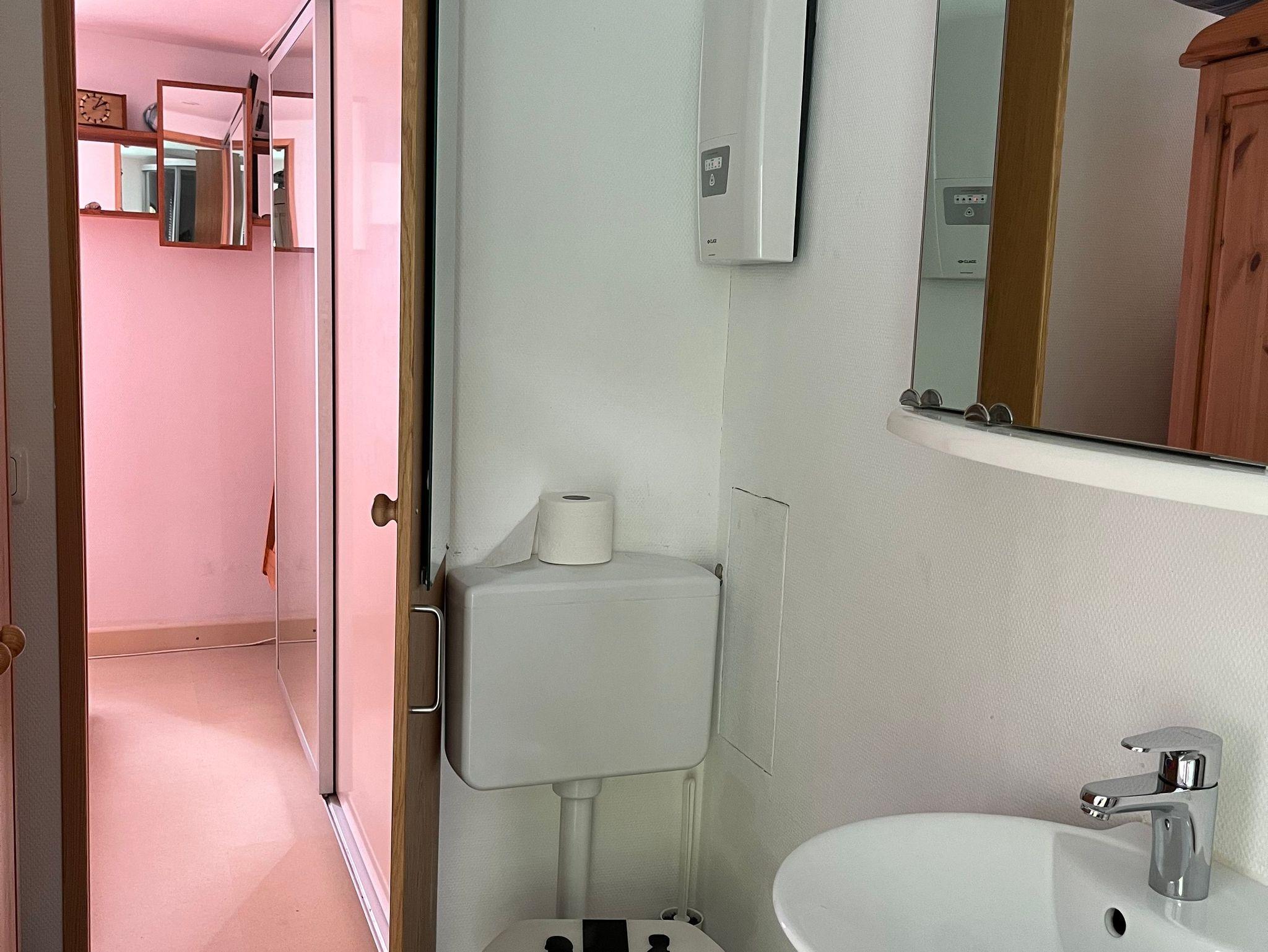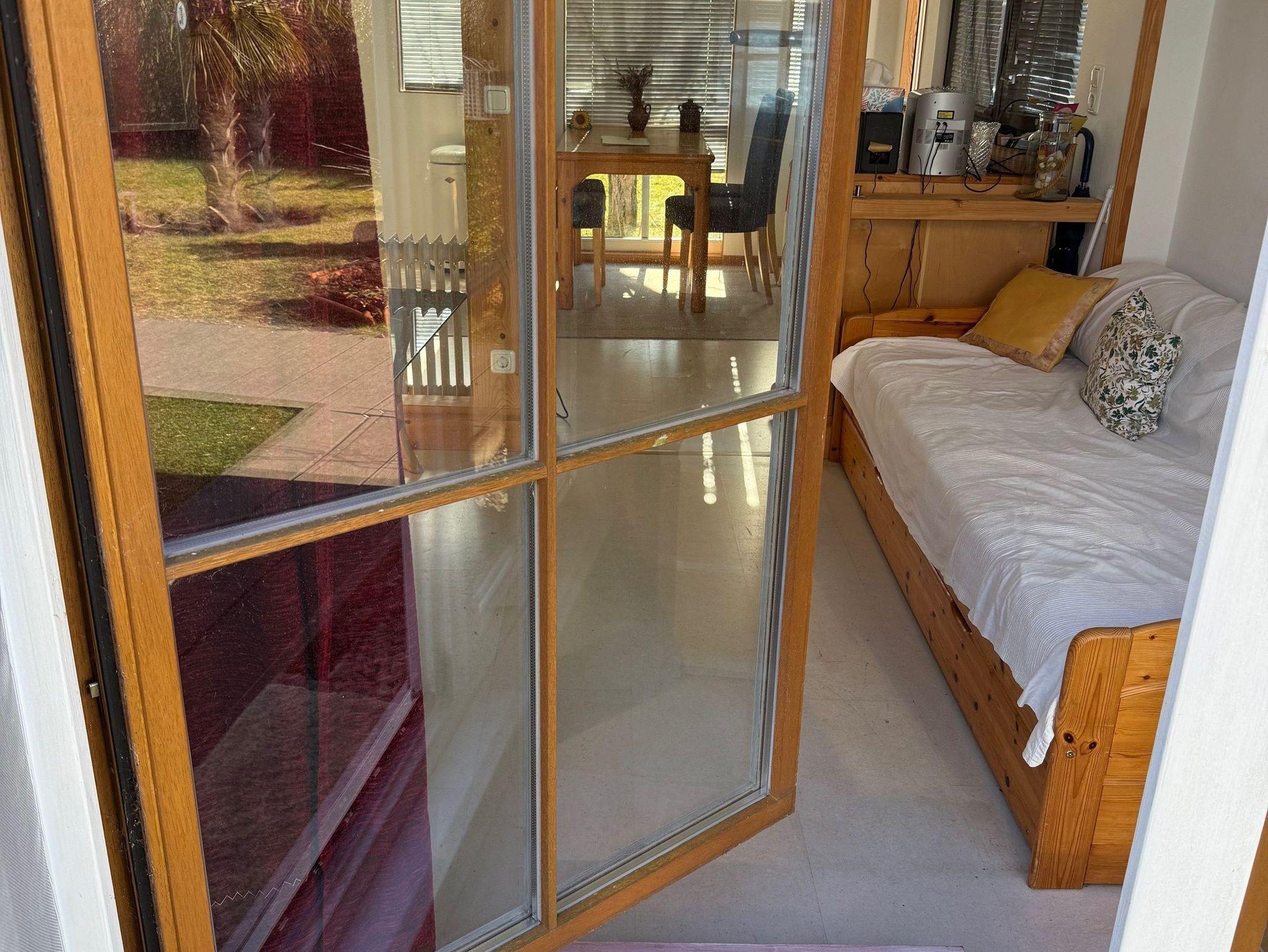 der Nähe des Dusch-/WC-Bereichs befindet sich ein Pflegebett (0,90 m x 2 m), das das durch eine