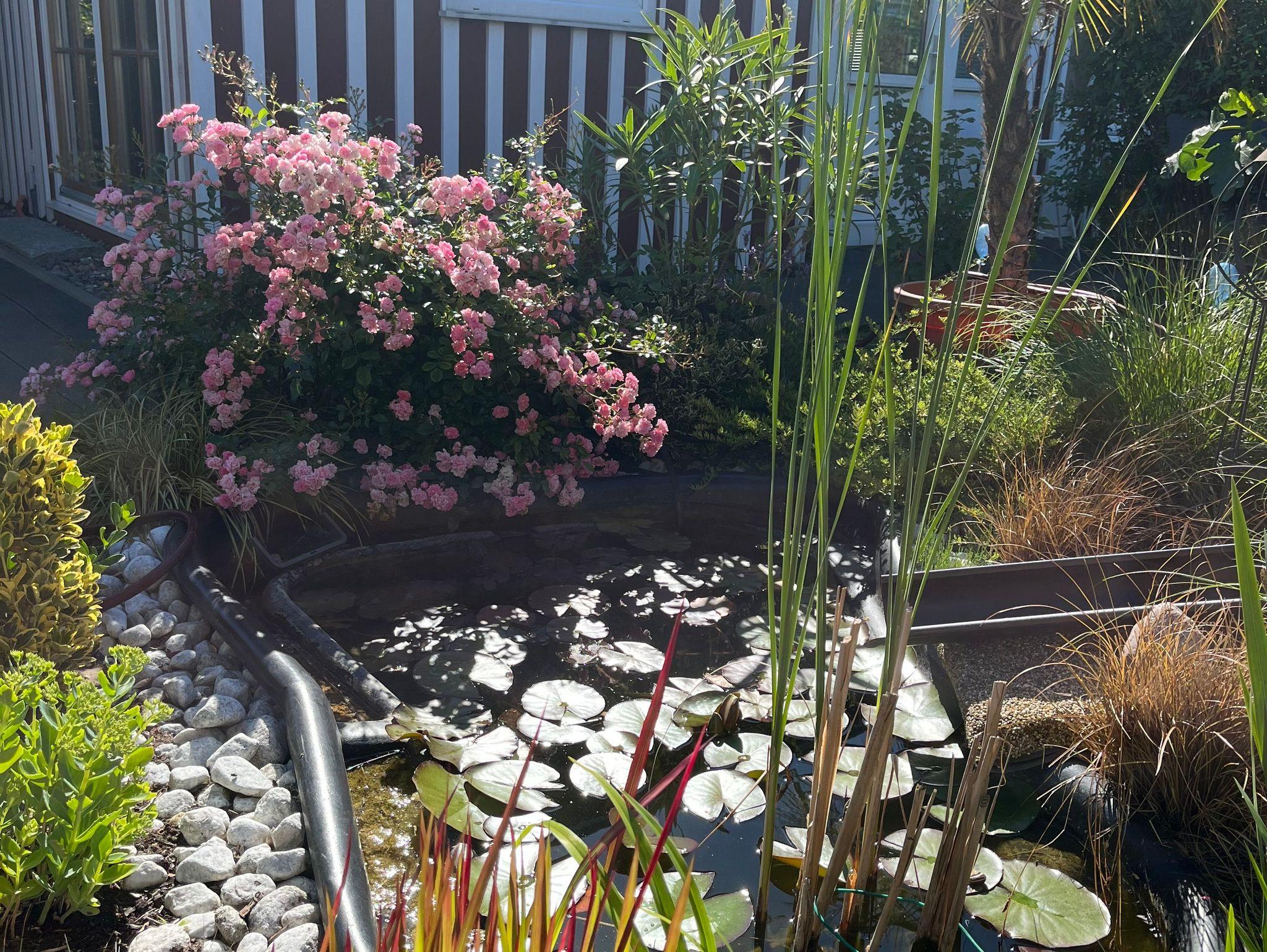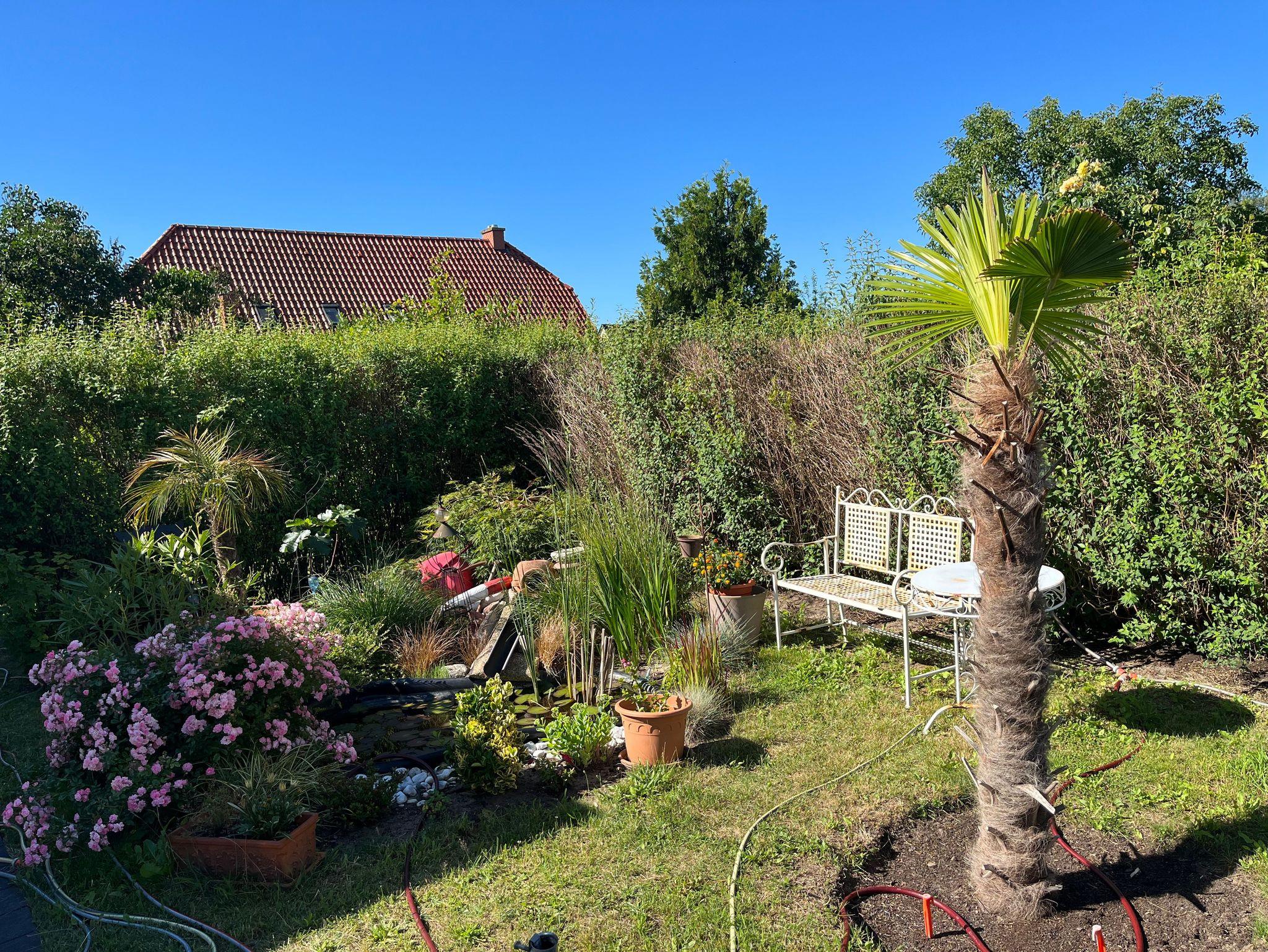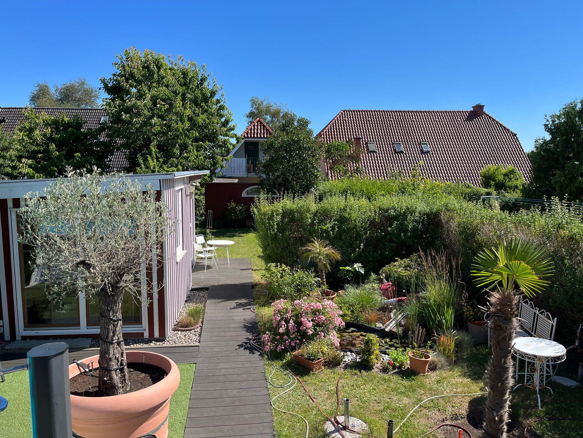 Vom Esstisch aus haben Sie einen schönen Blick in den von einer Hecke umgebenen Garten mit Gartenmöbeln und Sitzpolstern. Schräg gegenüber des Bungalow-Eingangs befindet sich ein kleiner Teich mit Goldfischen.