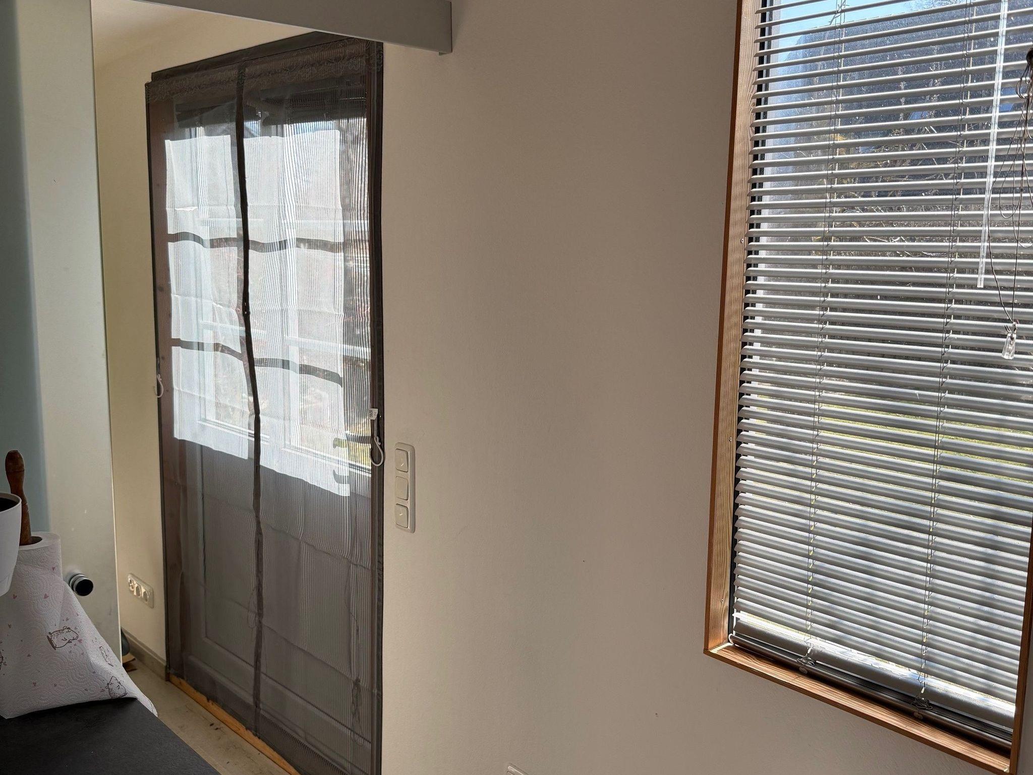Glas-Schiebetür vom Küchen- und Essbereich abgetrennt ist. Der Eingang zum Bungalow ist