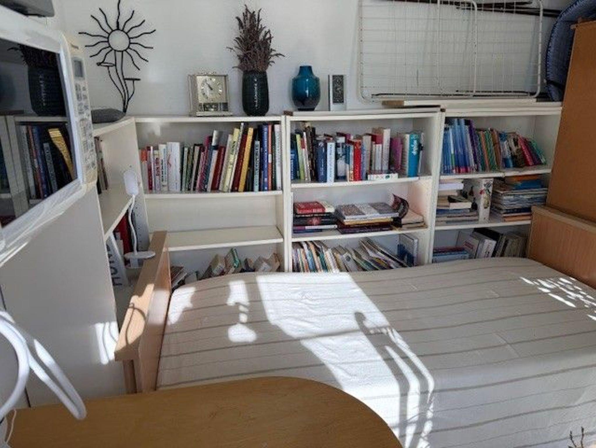 Im Schlafbereich steht ein Doppelbett aus Kiefernholz (2 m x 1,80m) mit 2 Matratzen à 90 cm. In