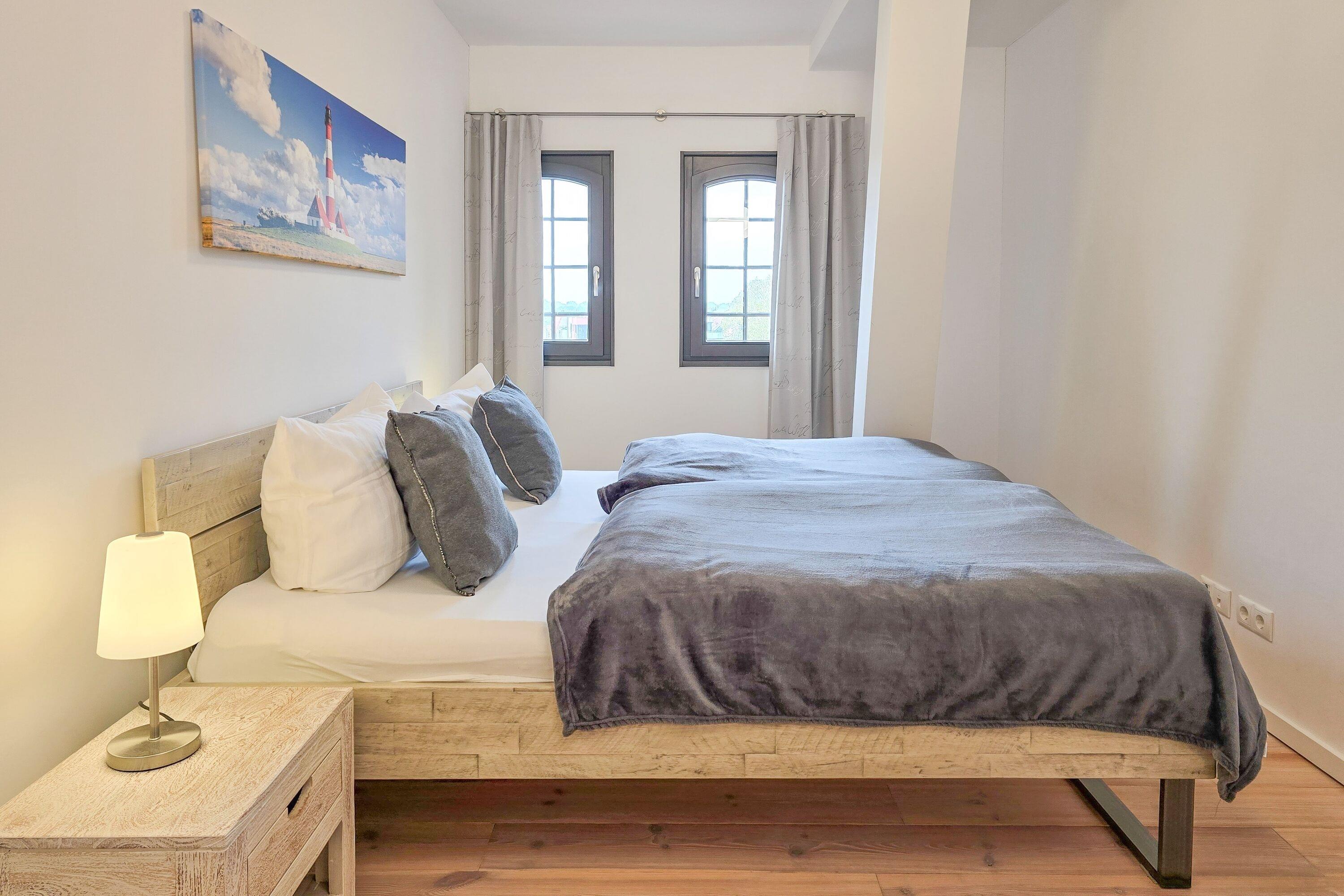 Die Speicherresidenz App. 4.10 empfängt Sie mit einer einladenden Atmosphäre. Der großzügige Wohnbereich mit Sitzgruppe und Essplatz lädt zu gemütlichen Abenden ein. In der voll ausgestatteten Küchenzeile können Sie Ihre Lieblingsgerichte zubereiten, die Sie anschließend auf dem Südbalkon genießen können. Die beiden Schlafzimmer bieten komfortable Ruhe, während das moderne Badezimmer mit ebenerdiger Regendusche zusätzlichen Komfort bietet.
