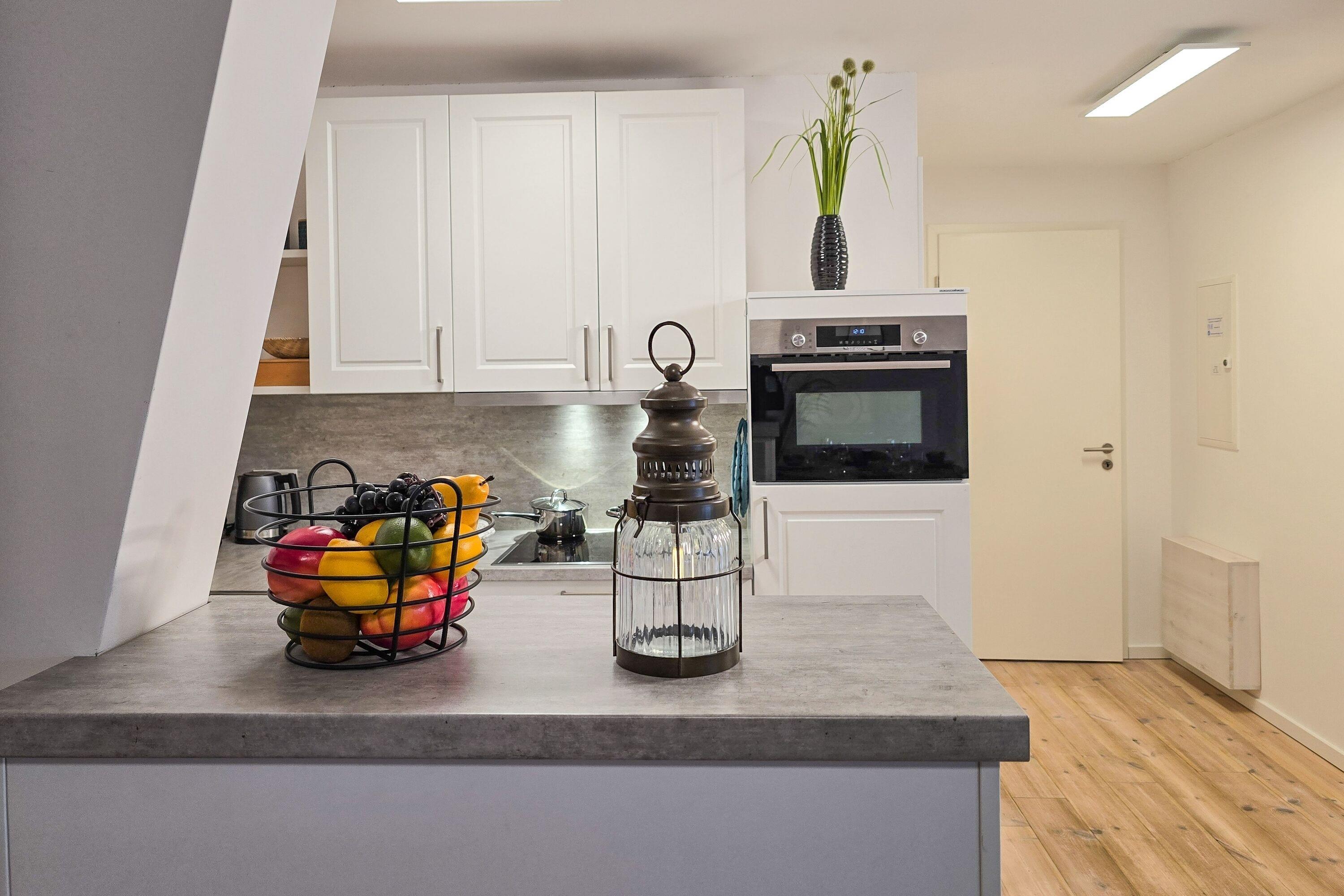 Küche: Voll ausgestattete Küchenzeile mit Backofen, Kochfeld, Mikrowelle, Kühlschrank, Gefriermöglichkeit, Geschirrspüler, Filterkaffeemaschine, Toaster und Wasserkocher