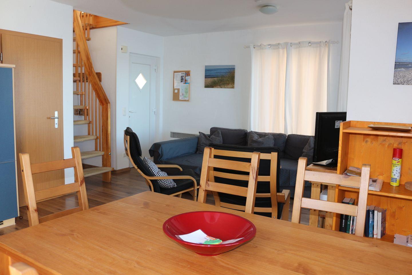Im 1. Deck befindet sich das geräumige Wohnzimmer mit Essecke und Küchenzeile. Das Wohnzimmer ist modern-maritim eingerichtet mit einem Sofa und Schwing-Sessel mit Hocker-Kombination. Der Esstisch bietet Sitzgelegenheiten für bis zu 6 Personen, ein Kinderhochstuhl steht Ihnen kostenlos zur Verfügung. An das Wohnzimmer schließt sich eine Terrasse an, hier stehen 4 Gartenstühle und ein Tisch für Sie bereit.
