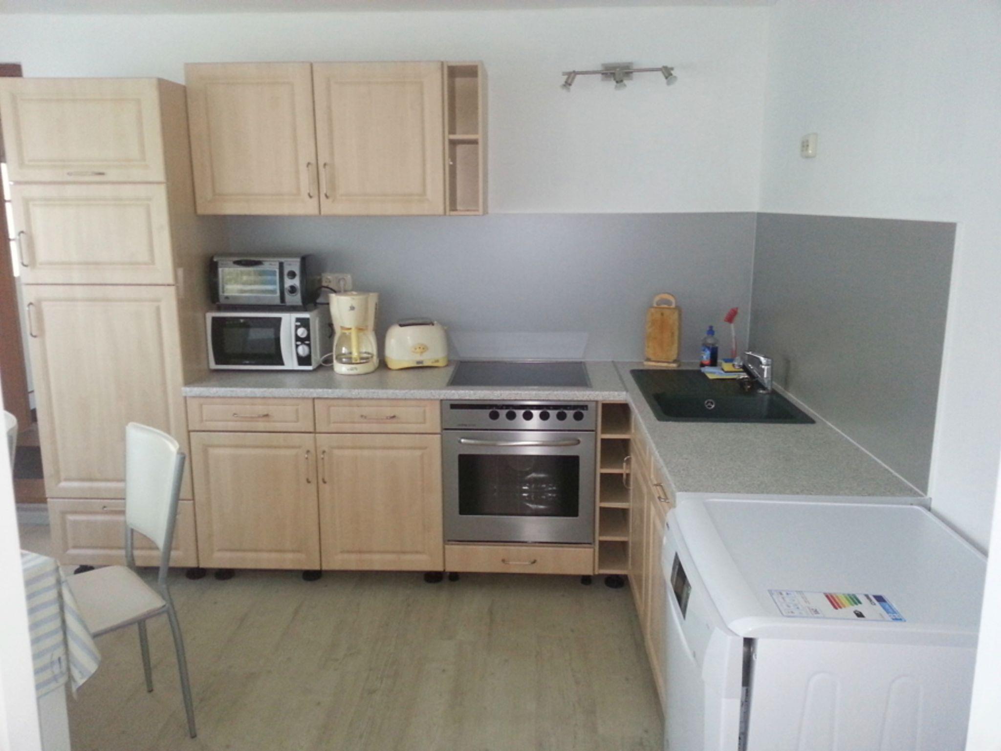 Die Küche der Ferienwohnung im Grünen ist voll ausgestattet mit Herd, Tiefkühlfach, Mikrowelle, Minibackofen, Wasserkocher und Kaffeemaschine sowie Toaster. Das Badezimmer bietet Ihnen eine Badewanne. In der Ferienwohnung befinden sich auch ein Kinderreisebett und ein Hochstuhl.