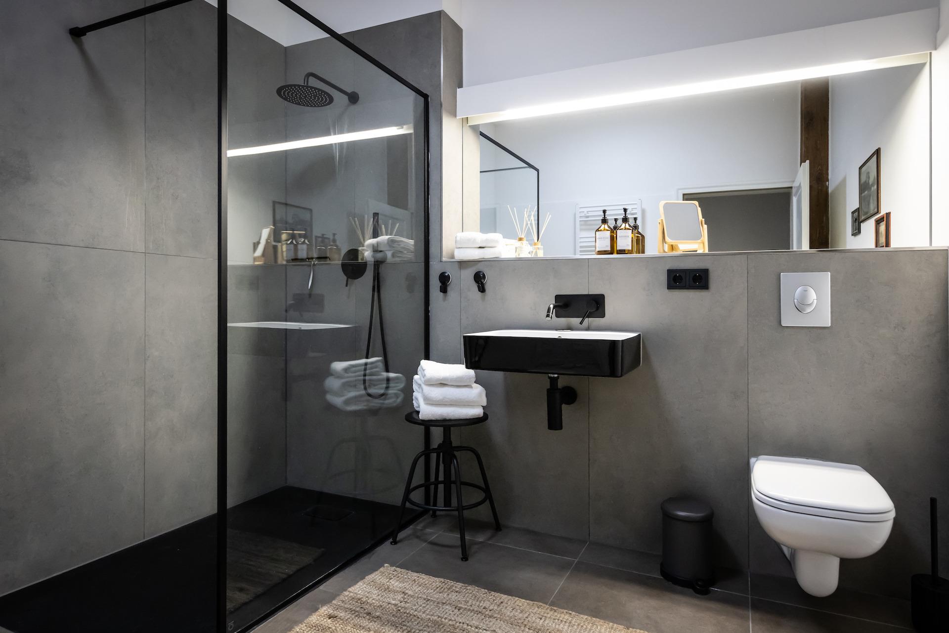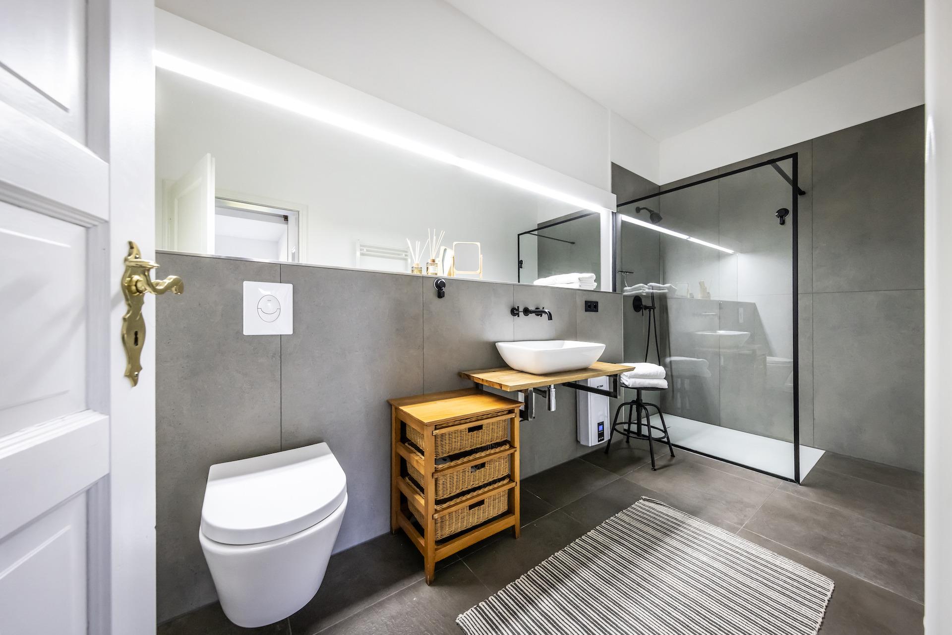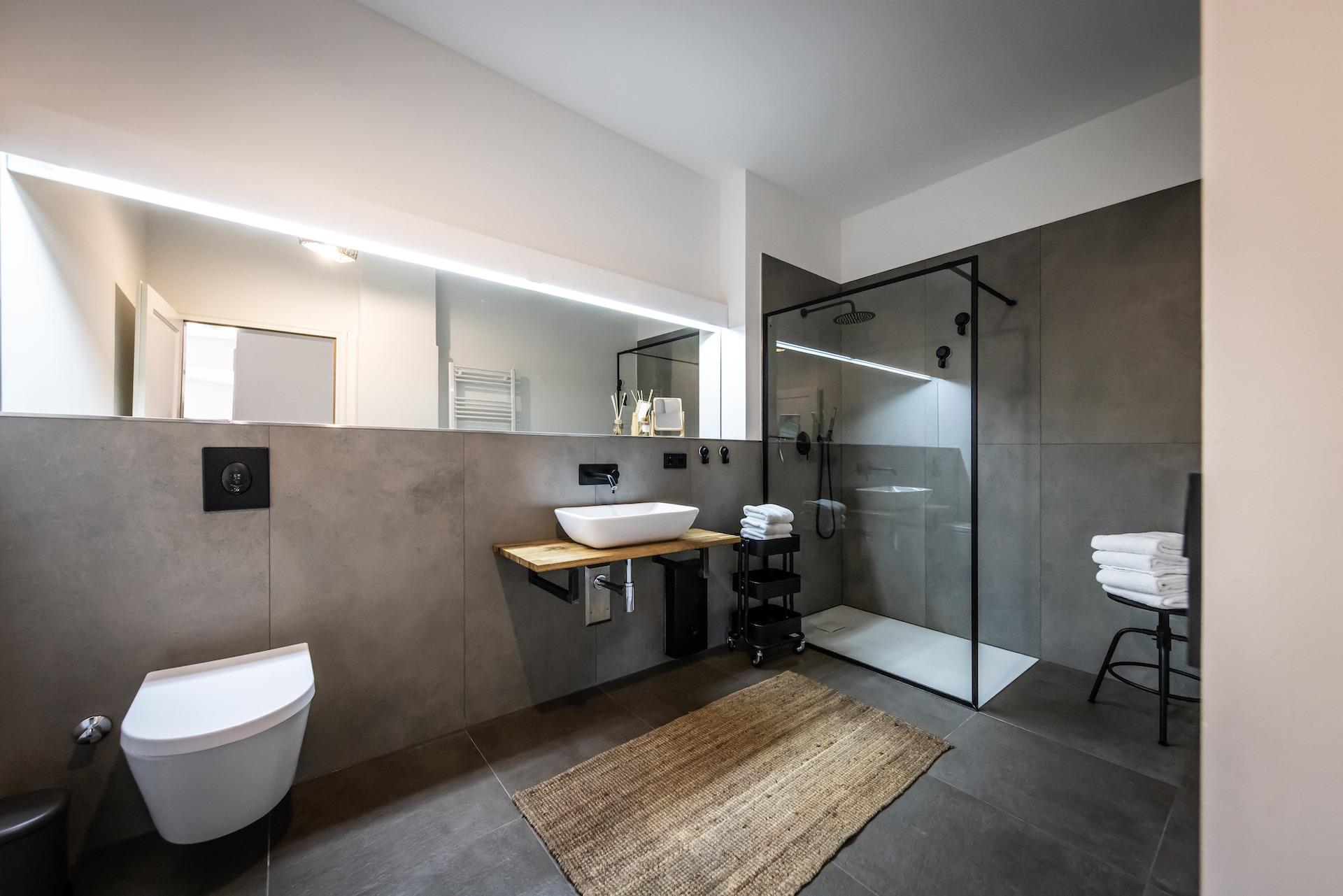 Große Wohnküche komplett ausgestattet, großes Duschbad (Dusche ebenerdig), Schlafcouch im Wohnbereich für zwei Personen und ein Schlafzimmer mit Doppelbett (Boxspring) und handgetischlerter Wandgarderobe, nahezu barrierefrei.