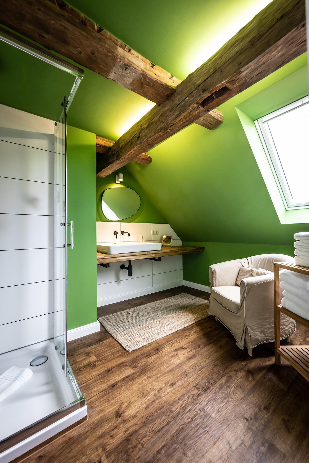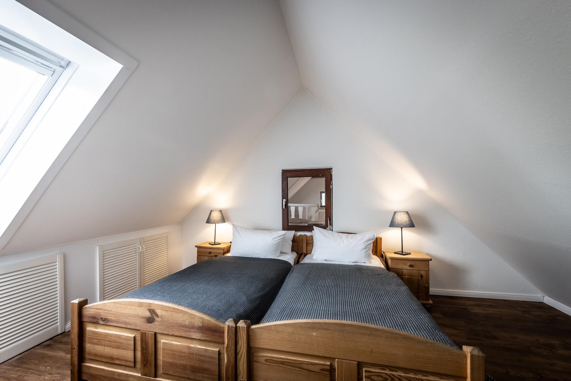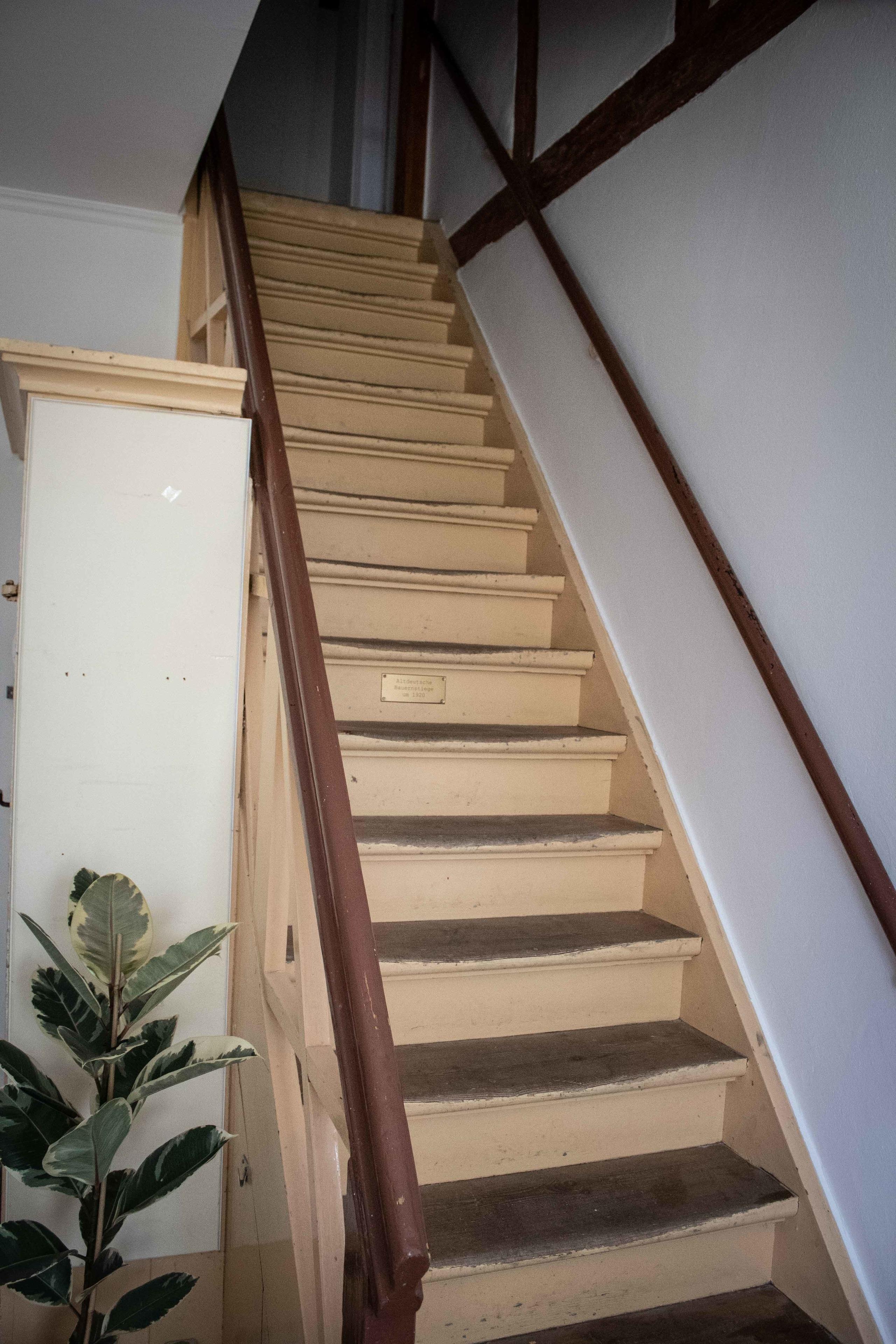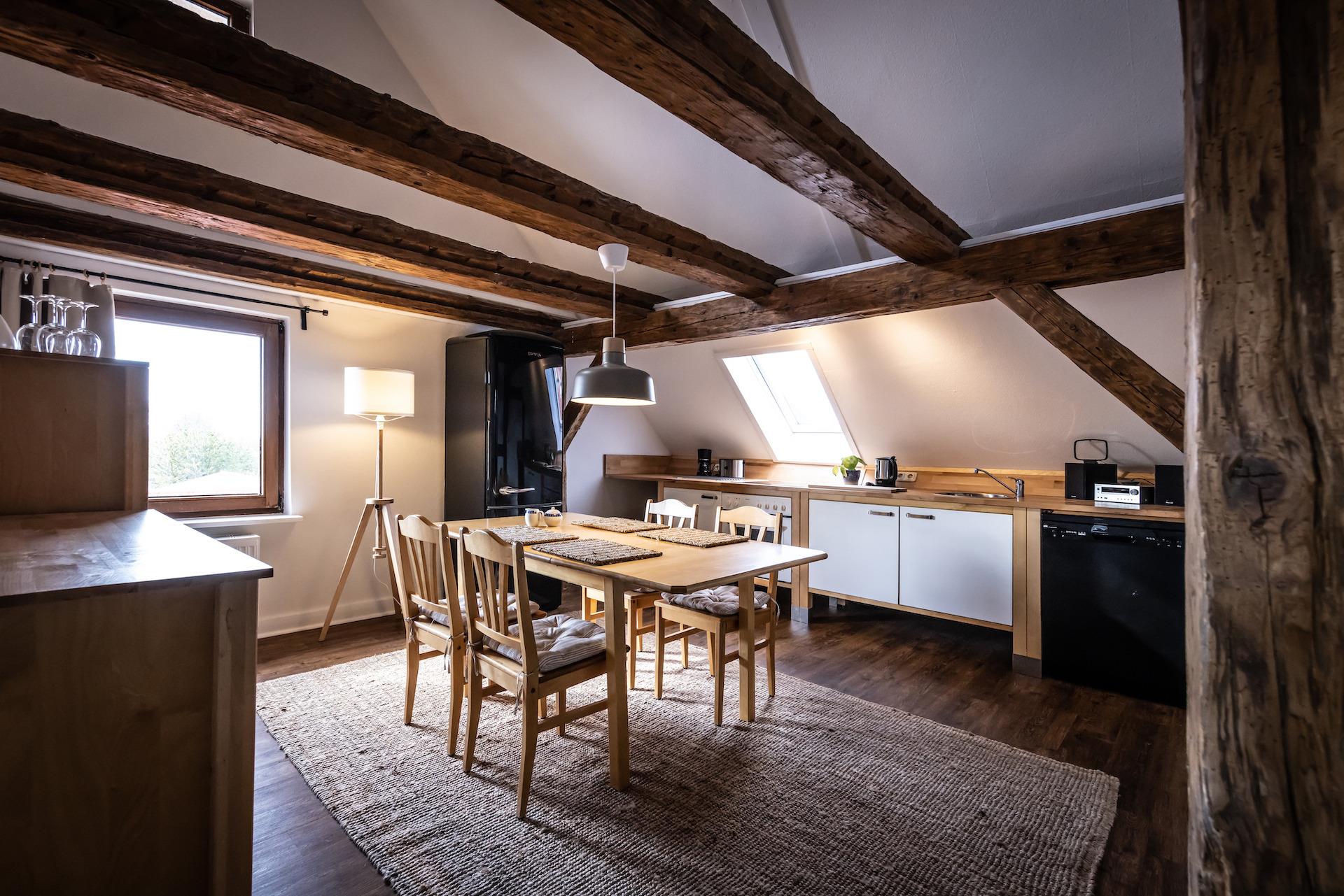 Komplette neu sanierte und renovierte (2023/24) Ferienwohnung im Haupthaus (Ausrichtung Hofmitte/ Dorfstraße) unterm Dach über zwei Ebenen (Dachschrägen, historische Balken, Treppensteigen notwendig)