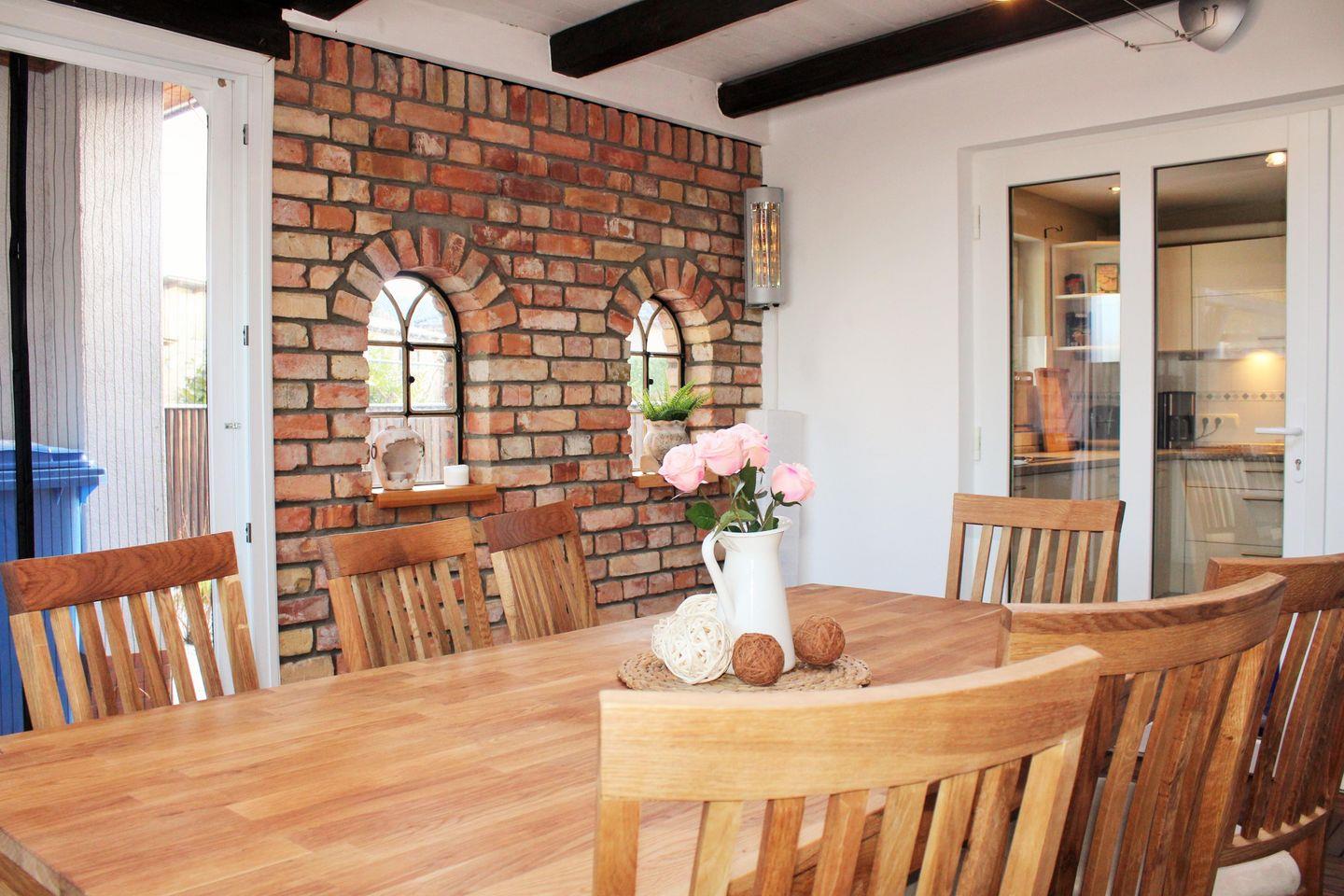Im separaten und beheizbaren Wintergarten befindet sich das rustikal und gemütlich eingerichtete Esszimmer mit einem großen massiven Holz-Esstisch mit 8 Stühlen. Von hier aus haben Sie direkten Zugang zu der ca. 10 m² großen und möblierten Terrasse - hier sitzen Sie entspannt und gemütlich und können gerne auch den hier vorhanden Kohlegrill nutzen.