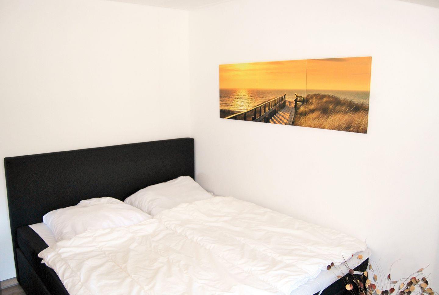 Das gemütliche 1. Schlafzimmer im Erdgeschoss ist mit einem bequemen Doppelbett (1,80 x 2,00 Meter), Nachttischen sowie einem geräumigen Kleiderschrank eingerichtet und verfügt über ein eigenes Flatscreen-TV-Gerät.