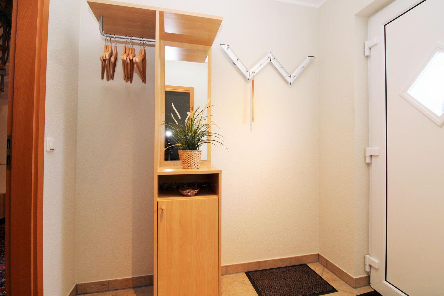 Vom der geräumigen Diele im Eingangsbereich der Wohnung mit Schrank, Garderobe, Spiegel und Schuhregal erreichen Sie bequem alle Räume Ihrer Ferienwohnung.