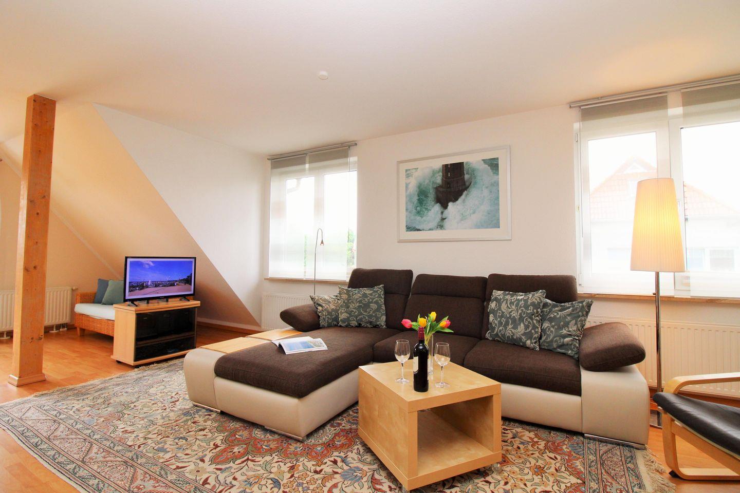 Das Obergeschoss der Fewo erreichen Sie über eine Wendeltreppe im Flur. Von hier aus gelangen Sie in den offen gestalteten Wohnbereich (Galerie) im Dachgeschoss. Dieser ist mit einer weiteren bequemen Sitzecke mit Couch, Sessel und Couchtisch sowie 2 kleinen Kommoden ausgestattet. Hier können Sie sich zurückziehen, um in Ruhe und ungestört zu lesen oder einfach nur auszuspannen.